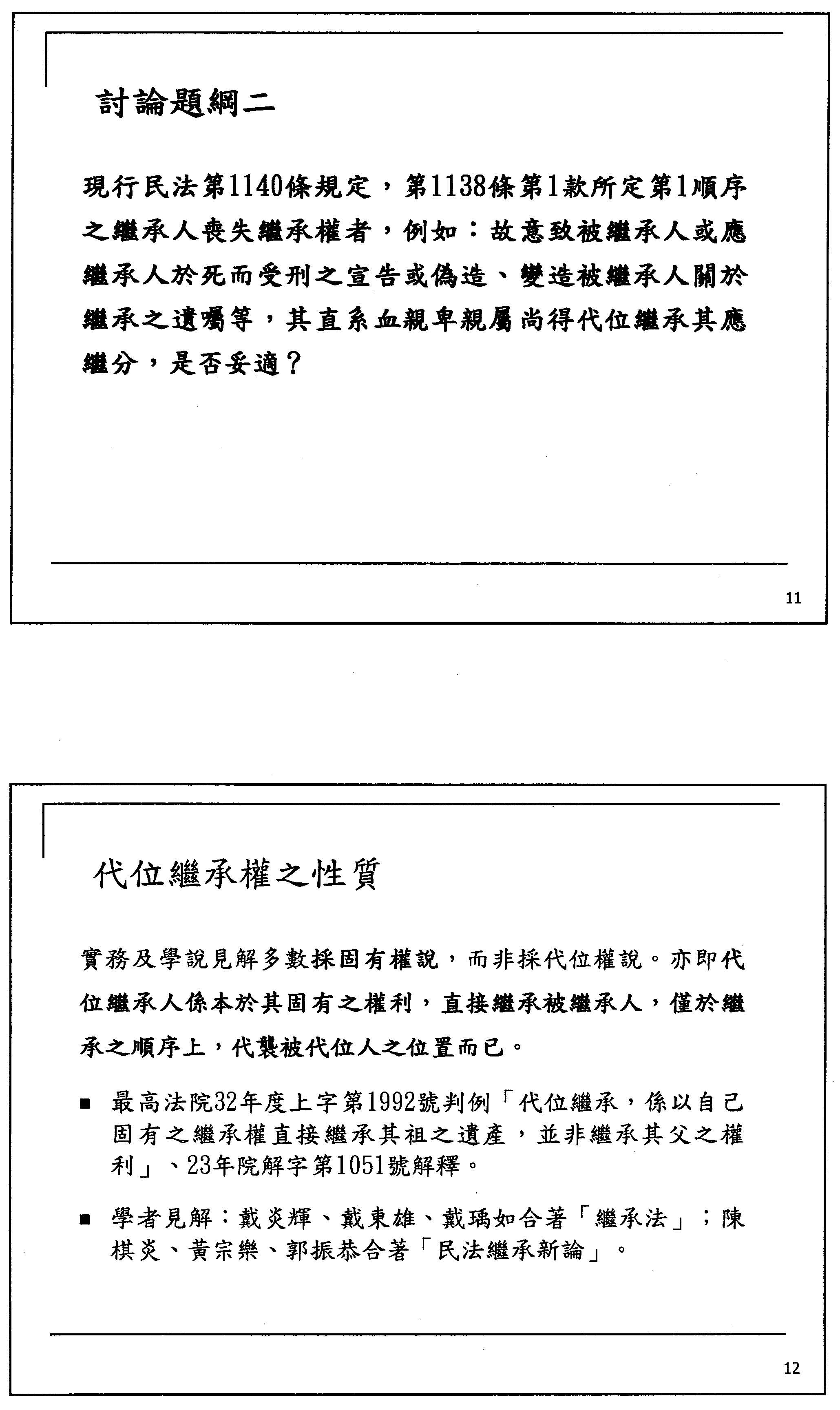 有關討論提綱二代位繼承權的性質,我的意見跟戴教授也非常接近,實務及學說見解多數採固有權說,亦即代位繼承人係本於其固有之權力,直接繼承被繼承人,僅於繼承之順序上,代襲被代位人之位置而已。依草案第一千一百四十條之修正說明,代位人是「間接繼承被繼承人遺產」,這部分跟固有權說其實是不一致的,至於為什麼是這個樣子,好像也沒有說明理由。其次,就各國的立法例,剛剛戴老師也講過,包括鄰近的德國、日本等國家,仍然把喪失繼承權列為代位繼承之原因。