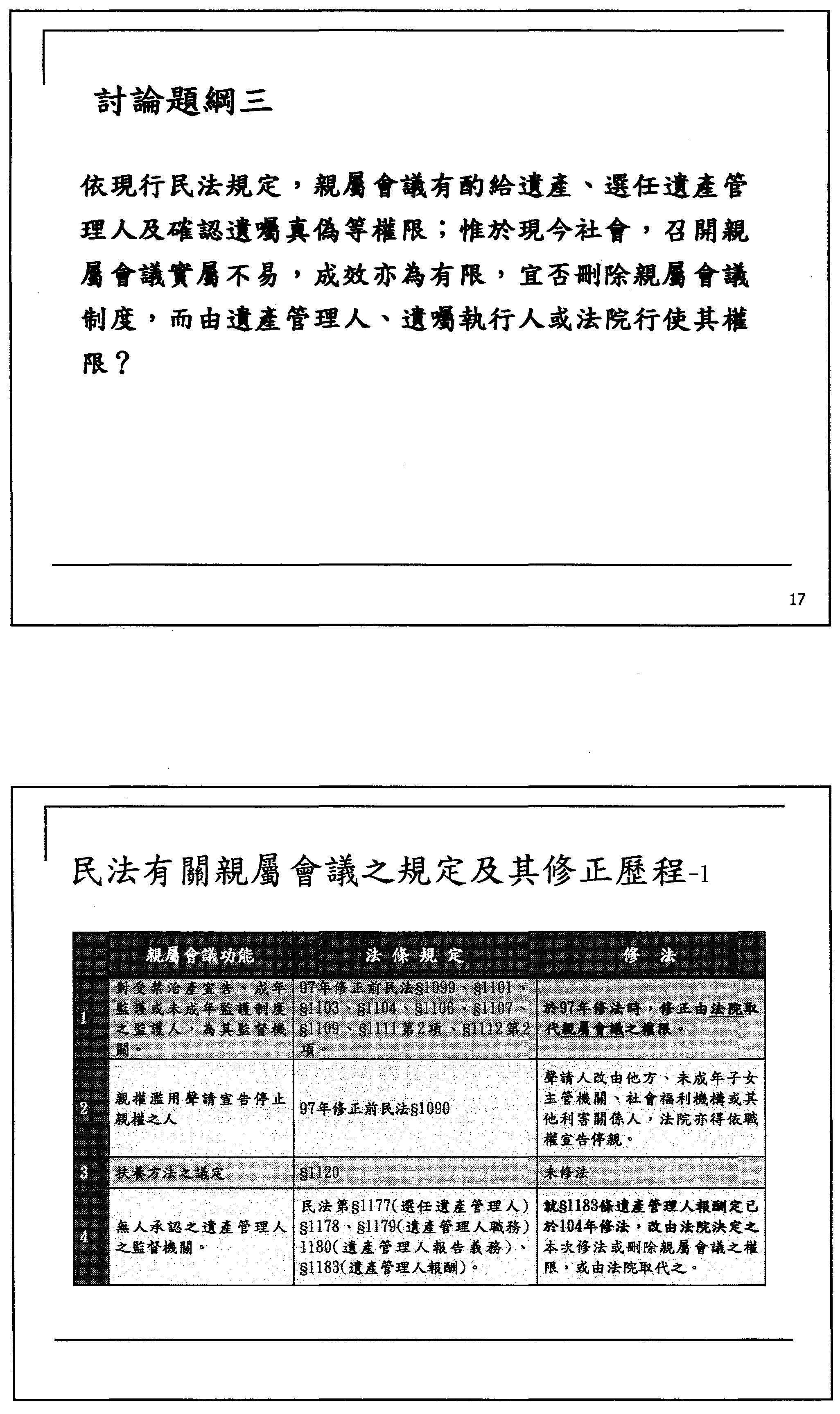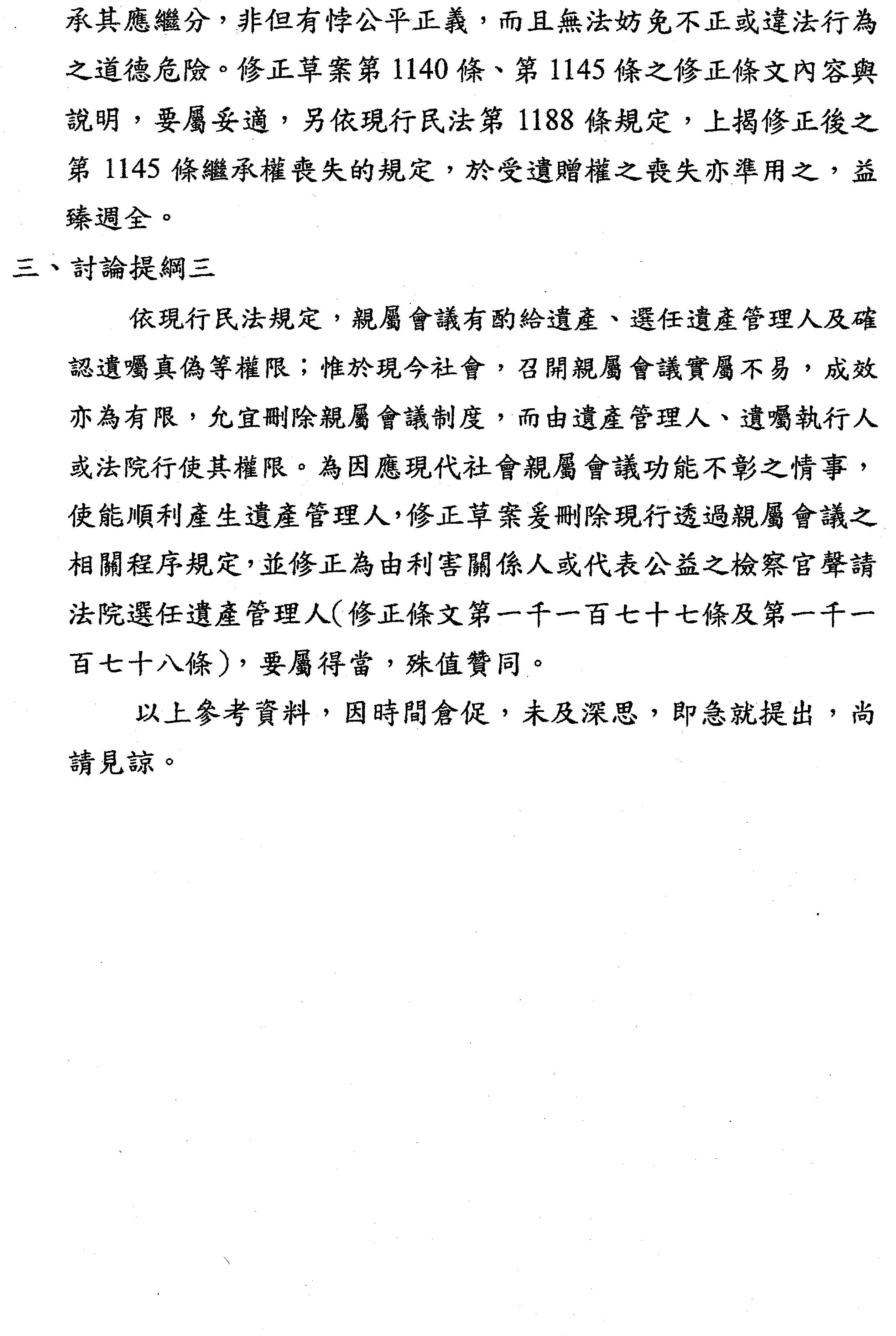 第三,有關討論提綱三,依現行民法規定,親屬會議有酌給遺產、選任遺產管理人及確認遺囑真偽等權限;只是現今社會中,召開親屬會議實屬不易,成效亦為有限,我認為允宜刪除親屬會議制度,為什麼要刪除?是因為現在人口很少,男女結婚好多都不分族了,小孩又生得少,親戚很少,而且都是小家庭,親戚本來就少了,要構成五位親屬會議的成員真的太難、太難,而且以我的經驗及感覺,親屬會議的形式已經變成一個夕陽的制度,所以我認為允宜刪除親屬會議制度是很正確的,而由遺產管理人、遺囑執行人或法院行使其權限,為因應現代社會親屬會議功能不彰之情形,始能順利產生遺產管理人,修正草案爰刪除現行透過親屬會議之相關程序規定,並修正為由利害關係人或代表公益之檢察官聲請法院選任遺產管理人,要屬得當,殊值贊同,謝謝大家。