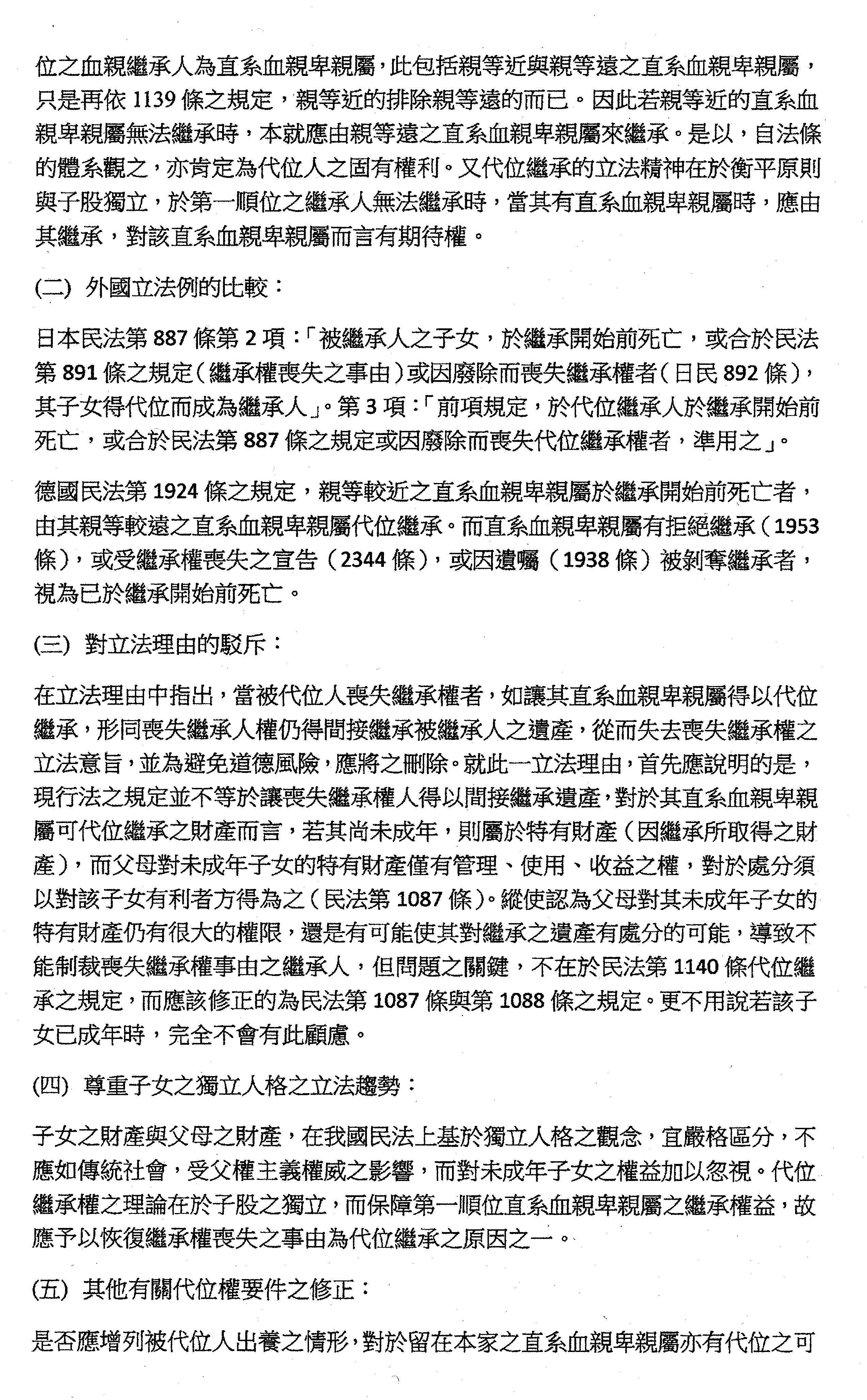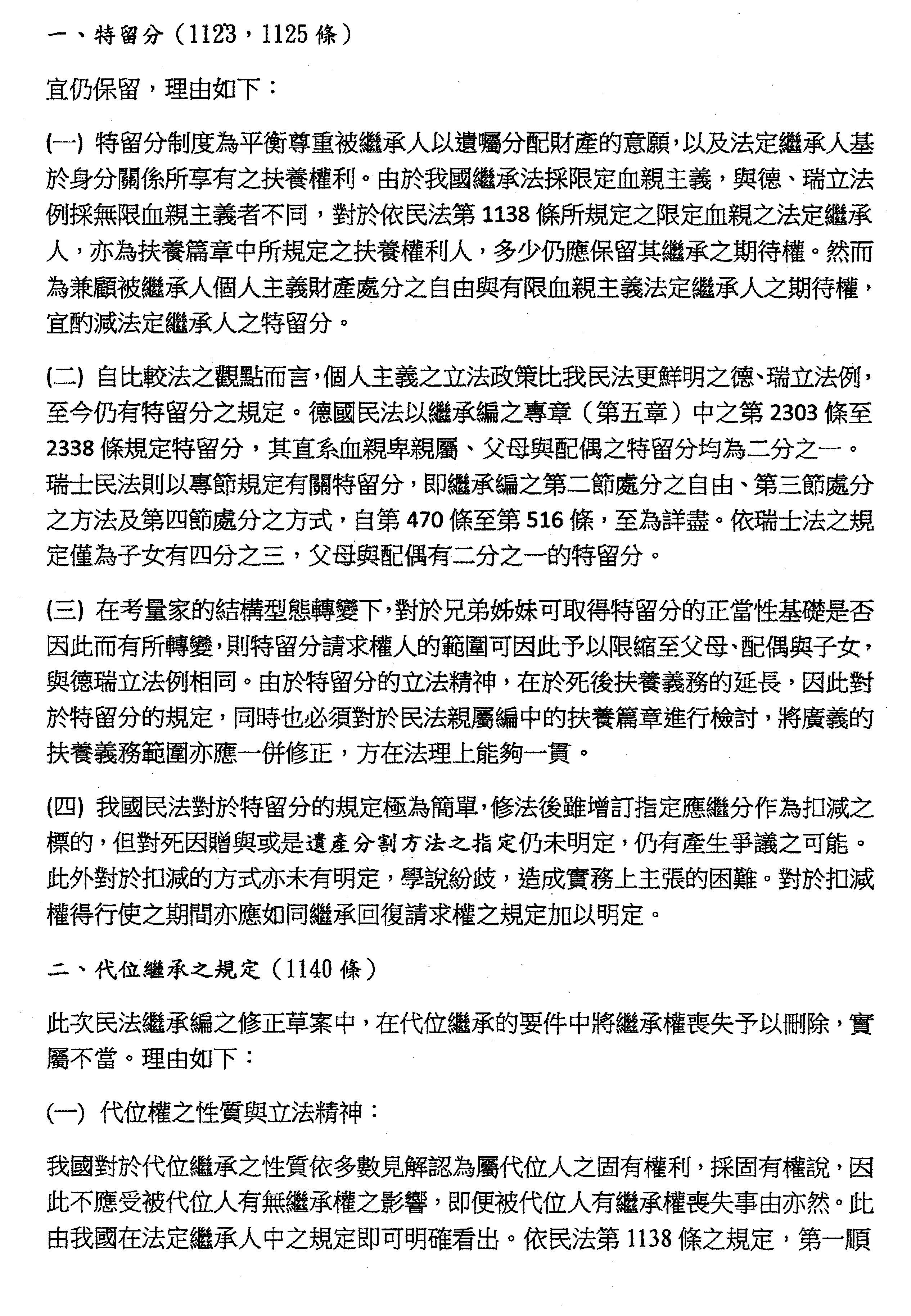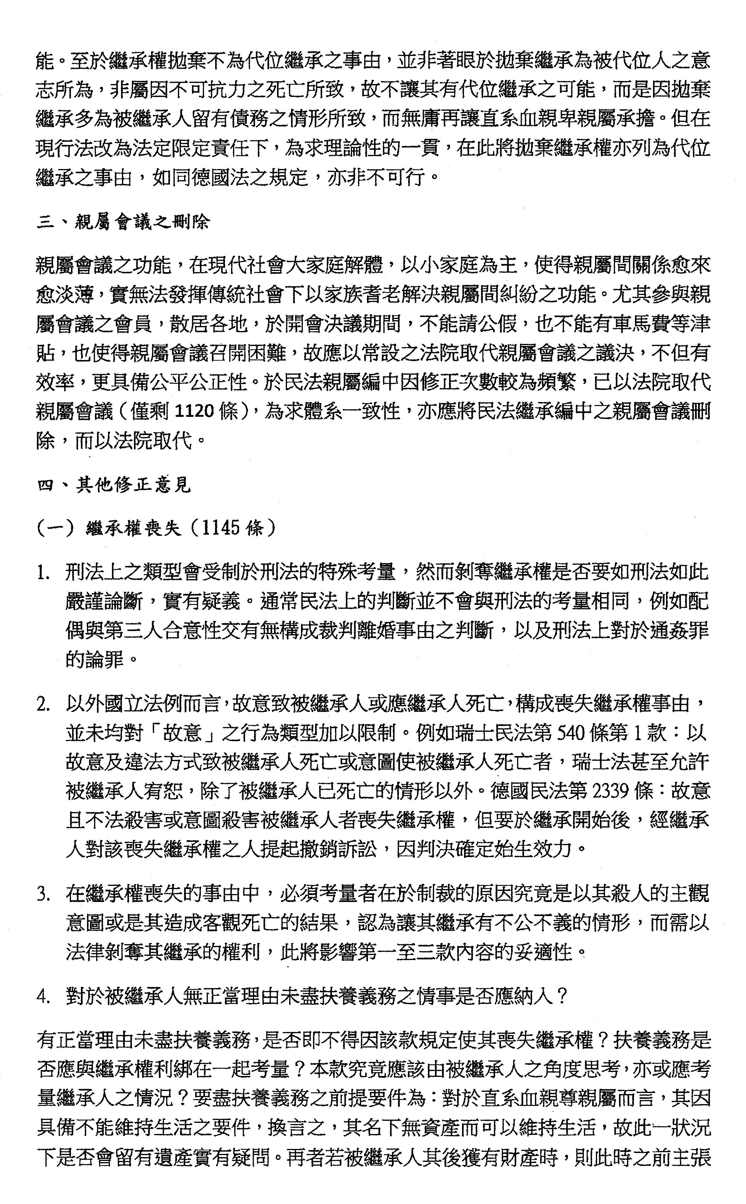 主席:戴教授認為特留分應該要更有彈性,另外對於代位繼承的部分也反對行政院、司法院的版本把繼承權喪失予以刪除,還有提出關於親屬會議和繼承權喪失的意見,也請各位一併參考。