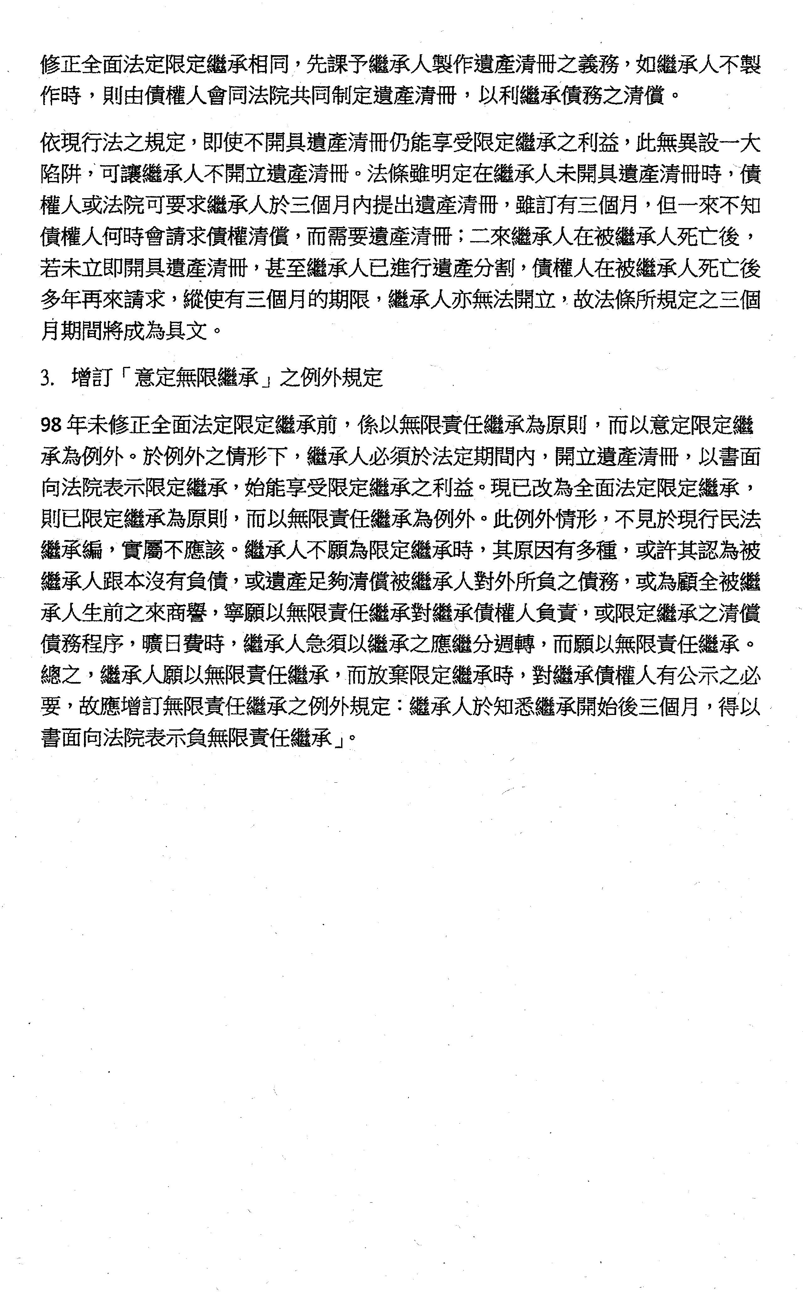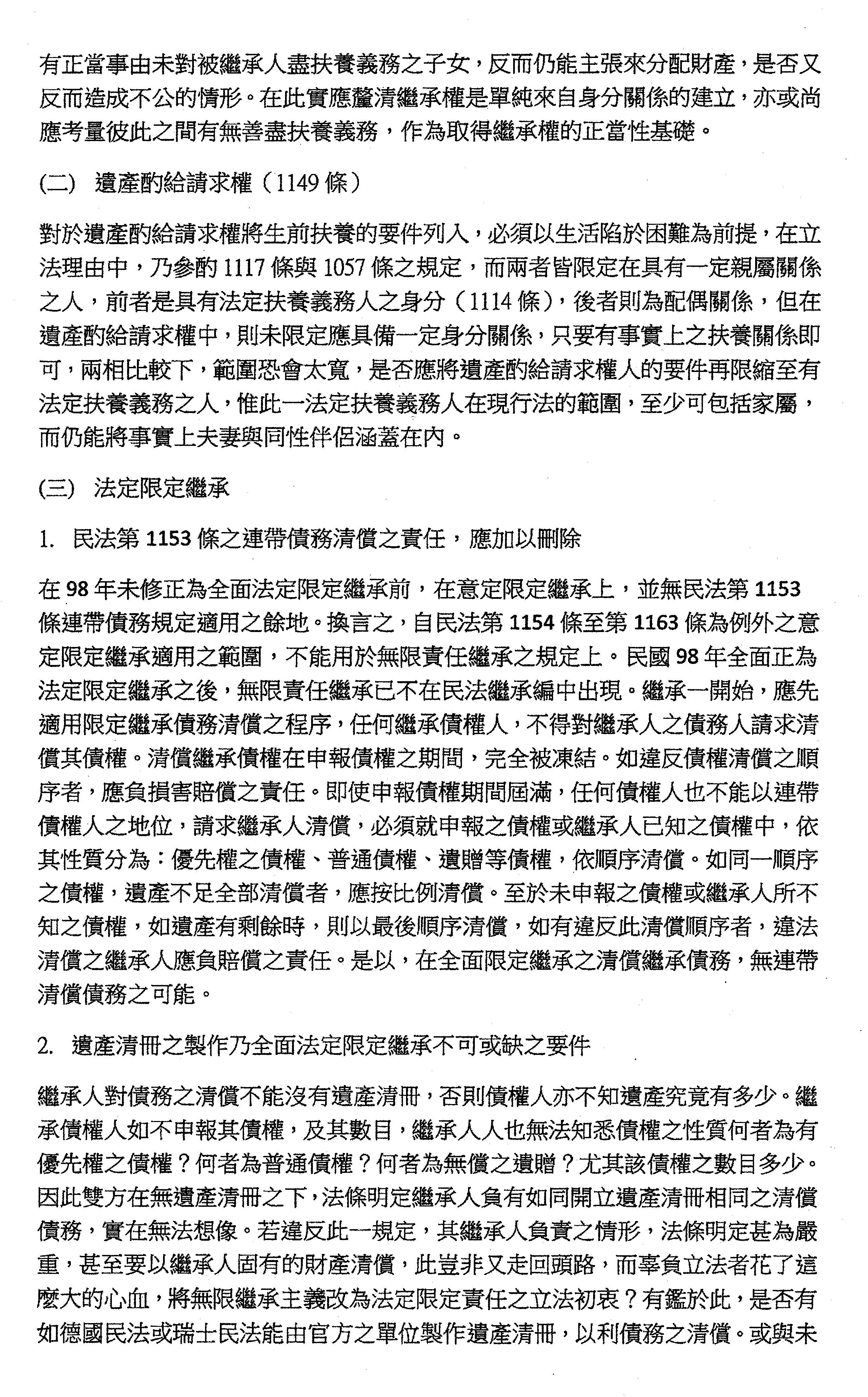 還有一件事情,我們剛剛提到遺產酌給部分過去一直沒有解決,現在也沒有解決,到底需不需要訂上限規定?因為過去在學界裡面針對遺產酌給是要以特留分說、實際所得說還是應計分說,有非常多不同的見解,可是在這次也一樣沒有解決。如果今天下午就要審酌,我們可以發現有非常多的條文有商議的必要,我們希望可以再多一點討論,個人不希望太快通過,以上。