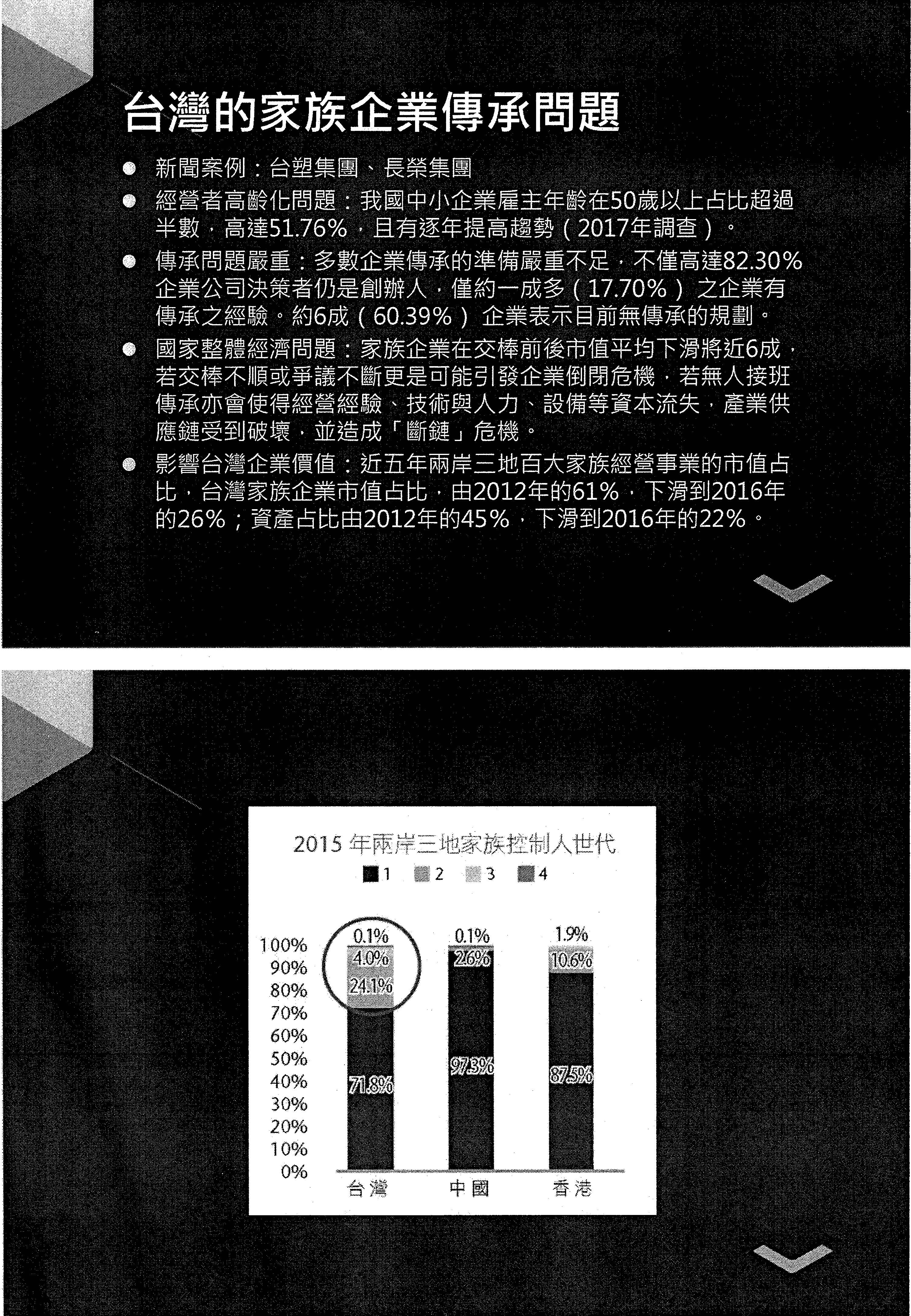 螢幕上這張圖表簡單而清楚的顯示了2015年兩岸三地家族控制人世代的情況,因為台灣經營階層世代的年紀比較大的關係,所以2015年有很多企業都面臨了必須要把家族經營權交給第二代甚至是第三代的狀況,從圖表上可以看出來,將近3成都必須要把家族企業傳承給下一代,有4%是已經傳到第三代。