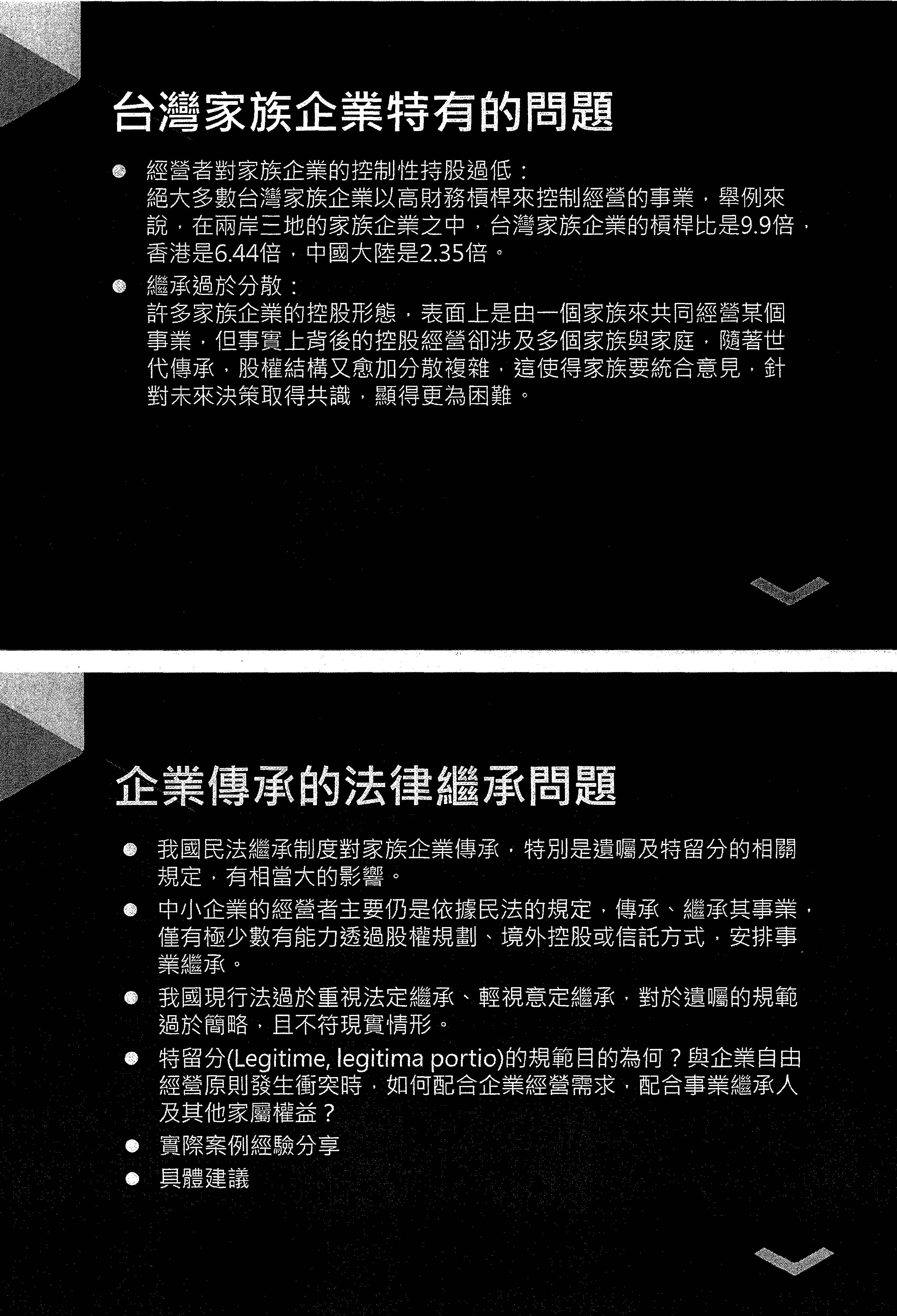 接下來我要談的是企業傳承所面臨的法律繼承問題,在民法繼承制度裡,對於家族的企業繼承有兩個最主要需要處理的問題,實務上所遇到的就是遺囑跟特留分的相關規定。對於中小企業的經營者來說,原則上還是會依據民法的相關規定來安排其事業的繼承,只有極少數的大型集團企業才有能力透過股權規劃、境外控股或信託方式來安排其事業的繼承。另一方面,因為我國現行民法規定過於重視法定繼承制度,對於透過遺囑或生前安排方式來安排繼承事項的規定,相對而言在法律上的規範比較少,也比較次順位一點,而且對於遺囑的規範過於簡略,非常不符合現在的狀況。例如這次提綱特別提到的親屬會議部分,我們在實務上操作就會知道,親屬會議非常的不切實際,坦白說,親屬會議要能順利成功達成共識的可能性相當低,對於相關當事人來說,他其實也非常不能夠接受為什麼一個平常幾乎沒有往來的親屬可以決定跟他切身相關的遺產繼承事項。