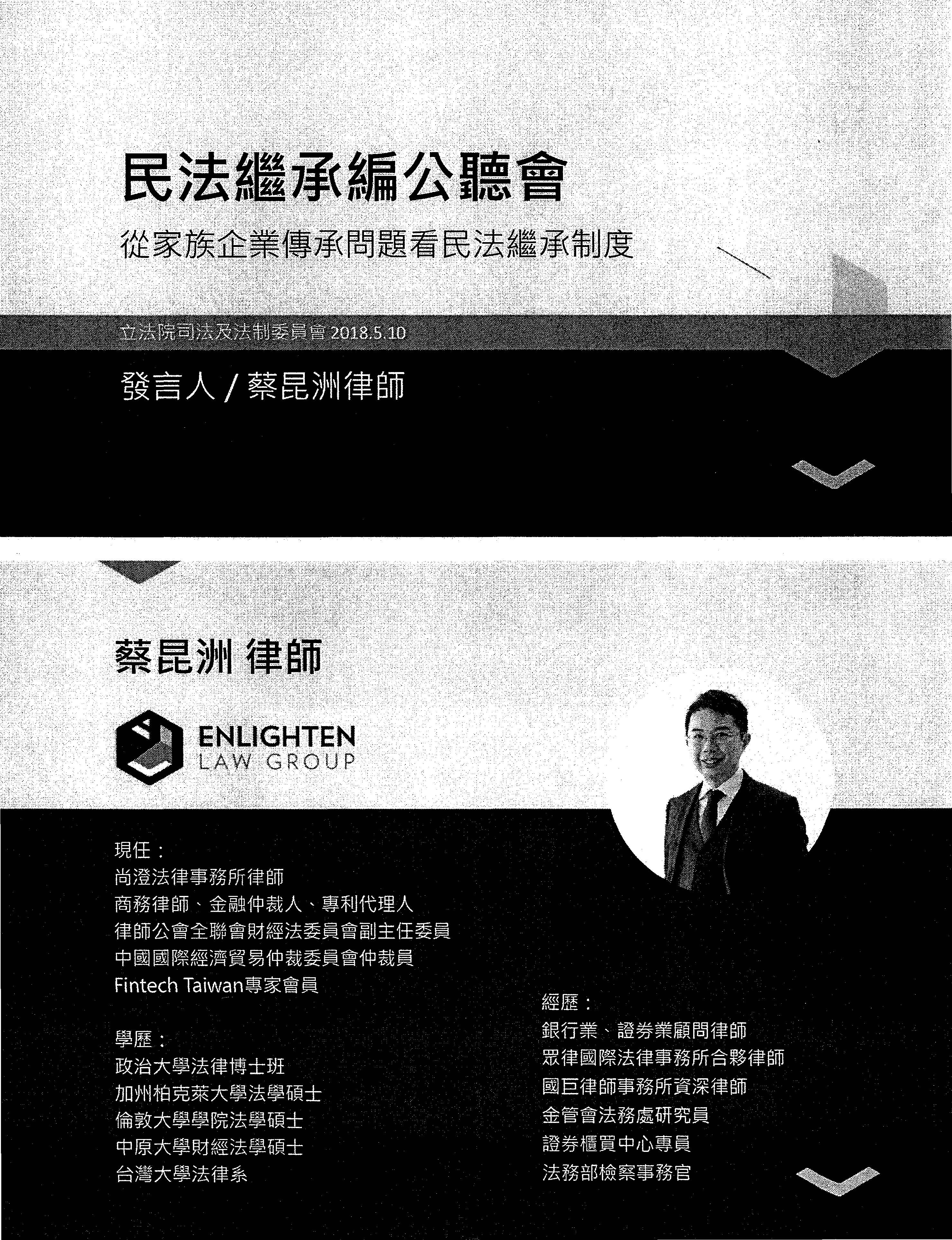 蔡昆洲律師:主席、各位委員。很榮幸有這個機會能參加民法繼承編的公聽會並且登記第一位發言,也感謝大家的禮讓。今天在場有很多我尊敬的專家學者,也有很多位是我的老師輩,各位都是民法的專家。