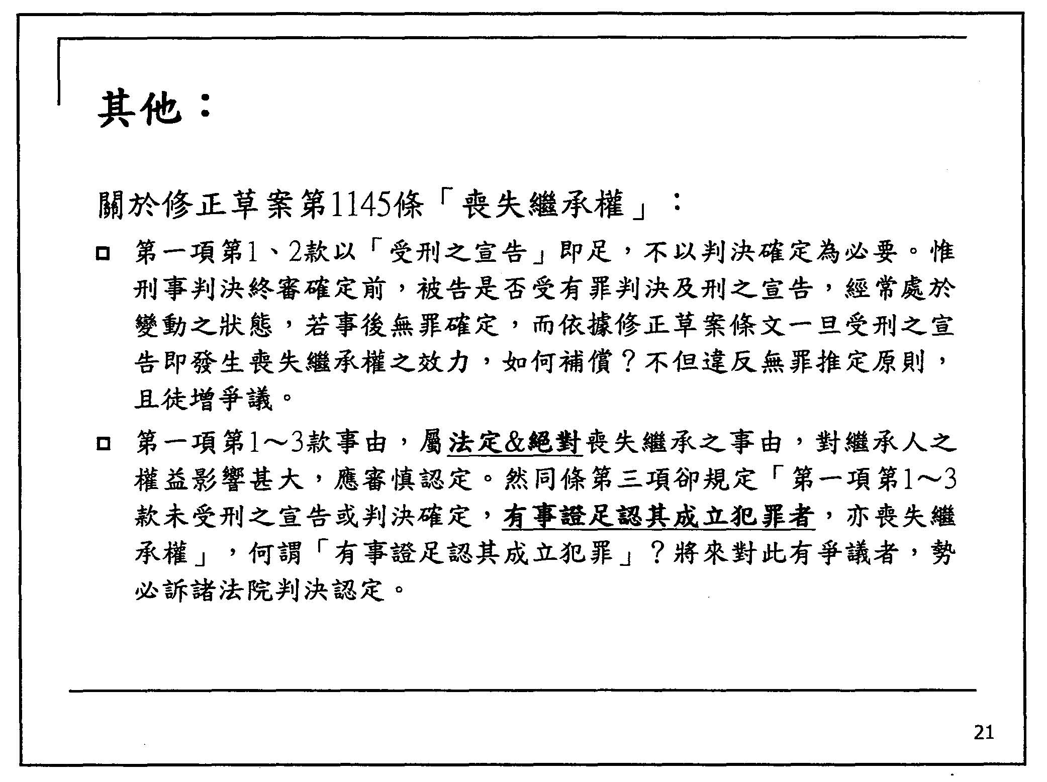 此外,關於喪失繼承權的部分,草案第一千一百四十五條第一項規定第一,二款以「受刑之宣告」即足,不以判決確定為必要,其繼承權就喪失了。但問題是,刑事判決在一、二、三審之間常常來回擺盪,在還沒有確定之前,你說他就當然喪失繼承權,由於這是剝奪他的權利,應該要更慎重一點,如果只是「受刑之宣告」而他的繼承權就喪失了,是不是違反無罪推定原則?如果他被判無罪確定的話,那麼繼承權要怎麼恢復,則又是一個很麻煩的問題。其次,草案第一千一百四十五條第三項是規定第一項第一款至第三款「未受刑之宣告或判決確定,有事證足認其成立犯罪者,亦喪失繼承權」,什麼叫做「有事證足認其成立犯罪」?將來對此有爭議者,勢必訴諸法院判決認定,所以這樣子的立法是不是適當,也一併提出來請大家思考,謝謝。