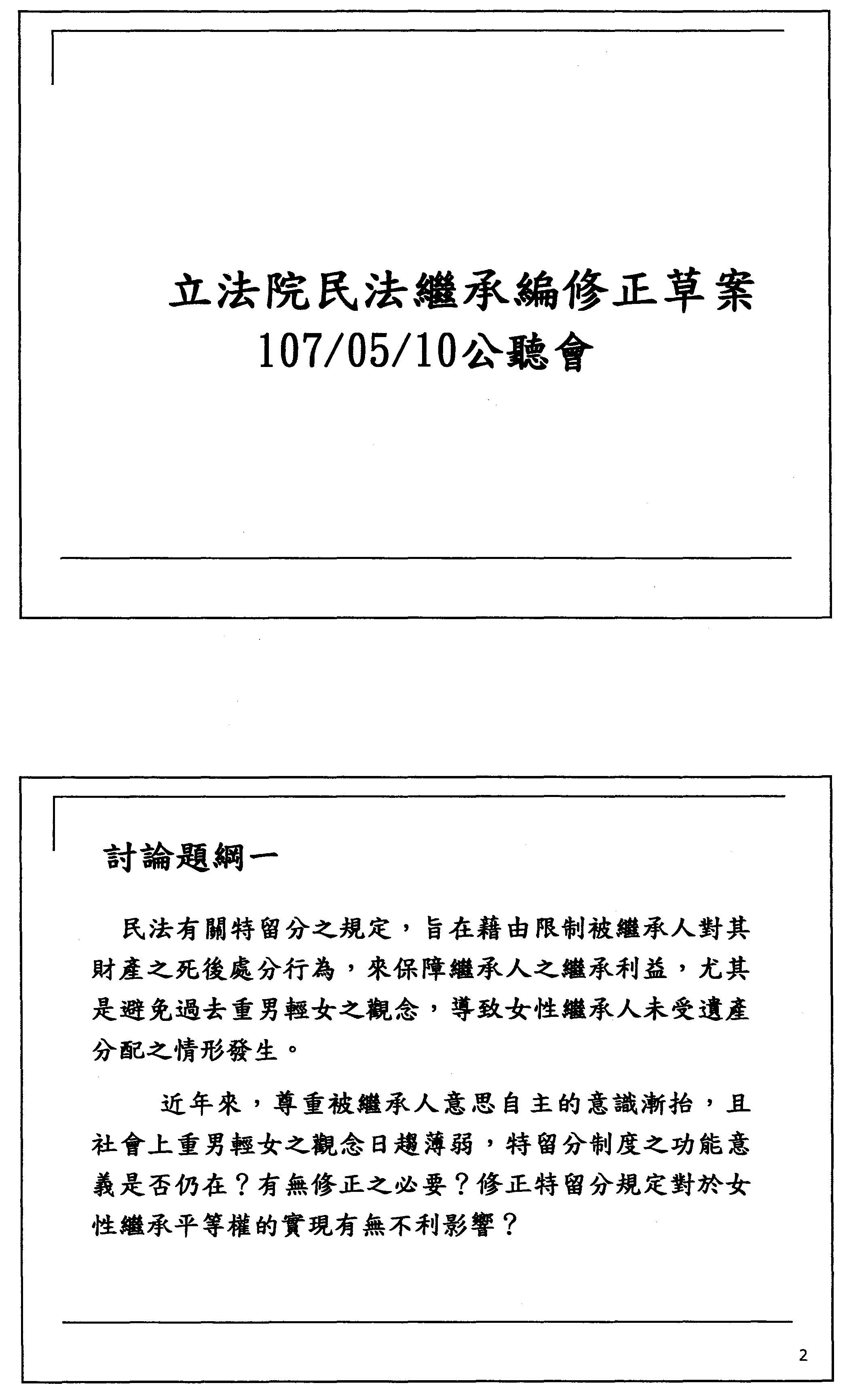 最後我有一個簡單的小結論,這次顯然好像沒有談到有關生存配偶的部分,配偶相關繼承的權利,除了特留分之外,好像並沒有特別去討論,其實我覺得生存配偶的保障可以再想想看是否有修正的空間。