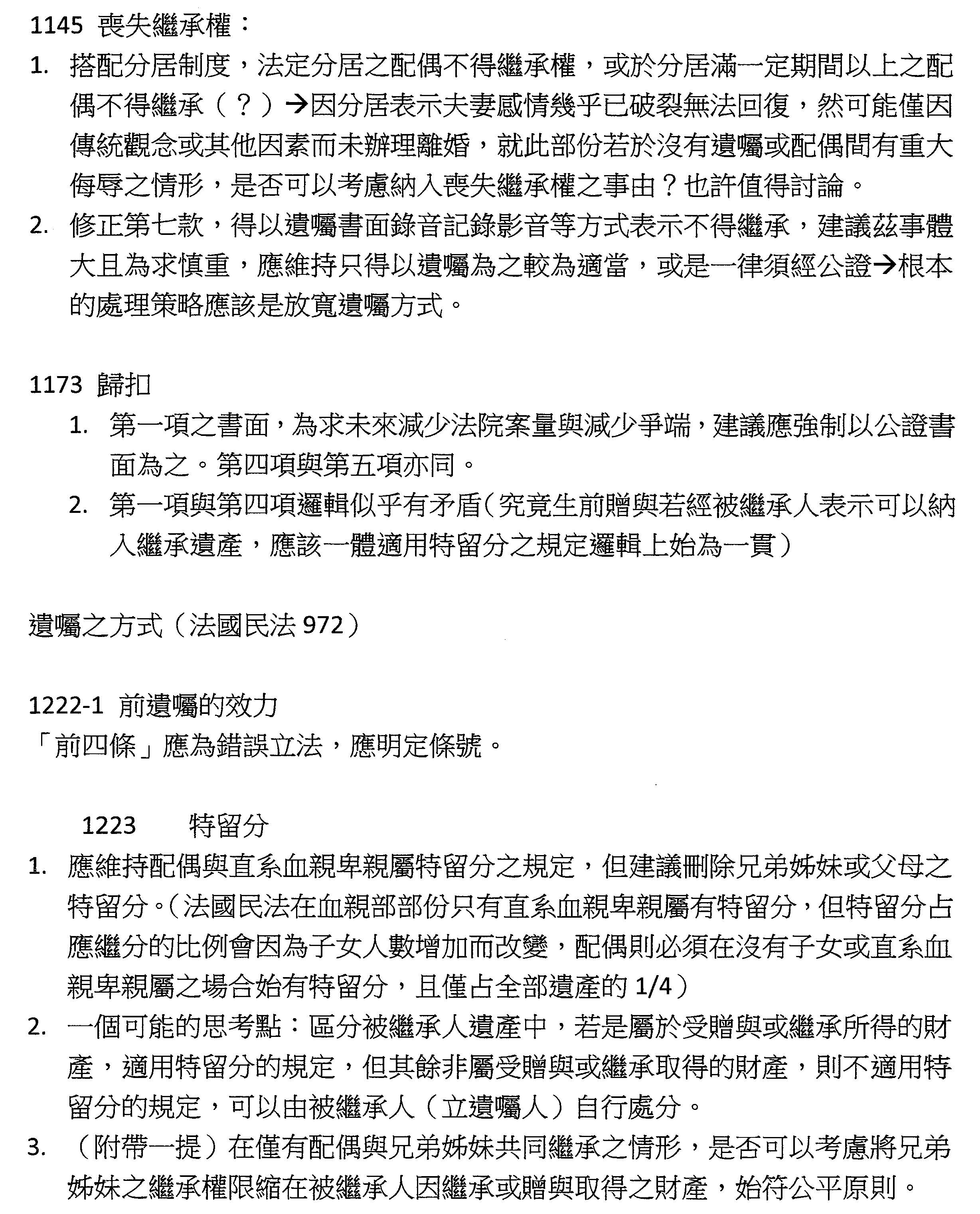 那其他的部分因為我的時間已經不夠了,所以請大家參閱我的書面意見,我對於第一千一百四十五條繼承權喪失還有被繼承人沒有正當理由未盡扶養義務是否應納入這個條文有一些意見,我對遺產酌給請求權也有一些想法,請各位參酌我的書面意見,謝謝。