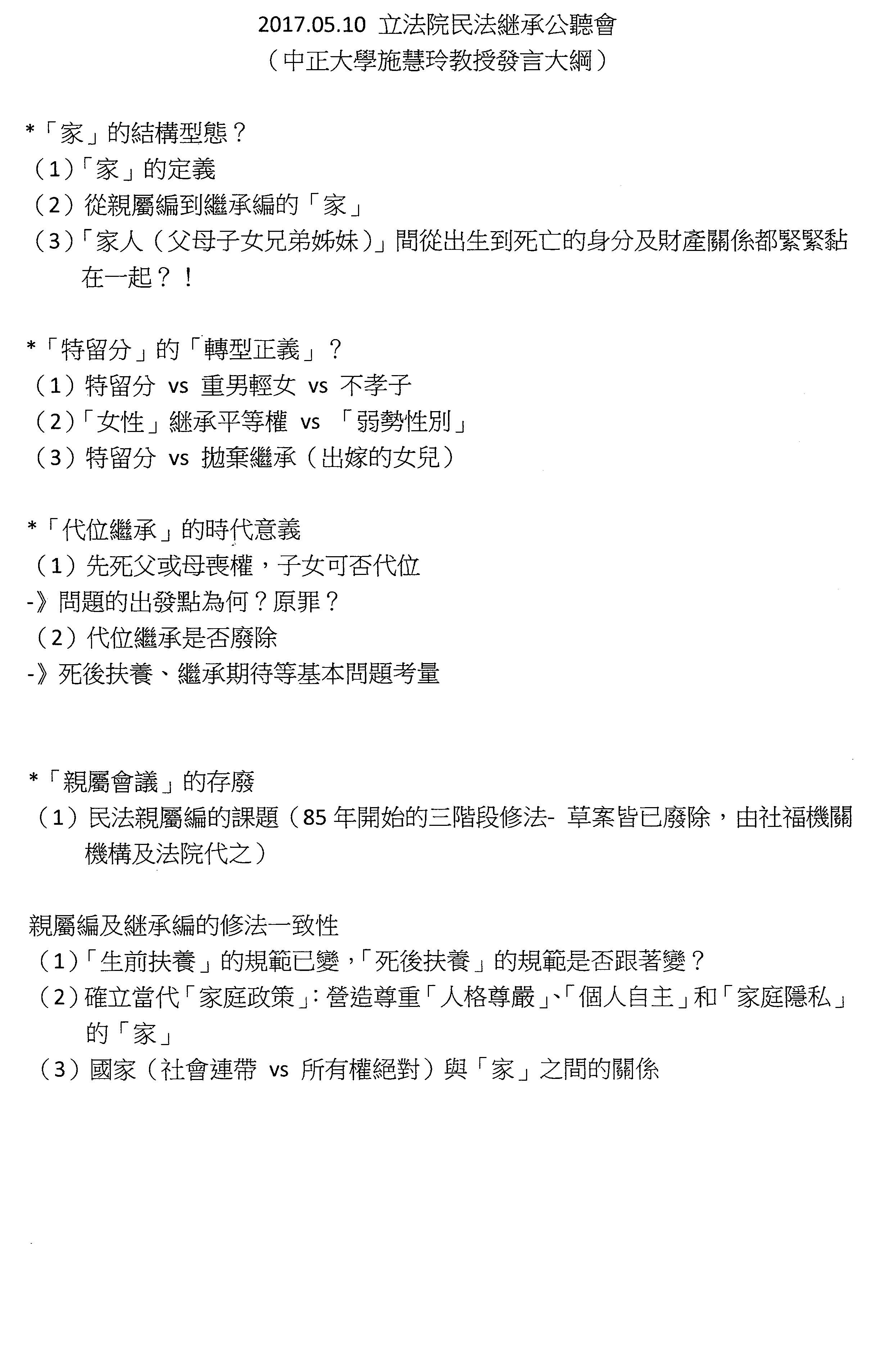 施慧玲教授:主席、各位委員。可能跟幾位來賓不太一樣,我收到這個邀請已經非常多天,因為基於個人的慵懶,我剛剛在高鐵上才把各位手上的講綱準備好寄過來,沒想到我到的時候已經在我桌上,我覺得立法院同仁的工作效率讓我非常驚艷。