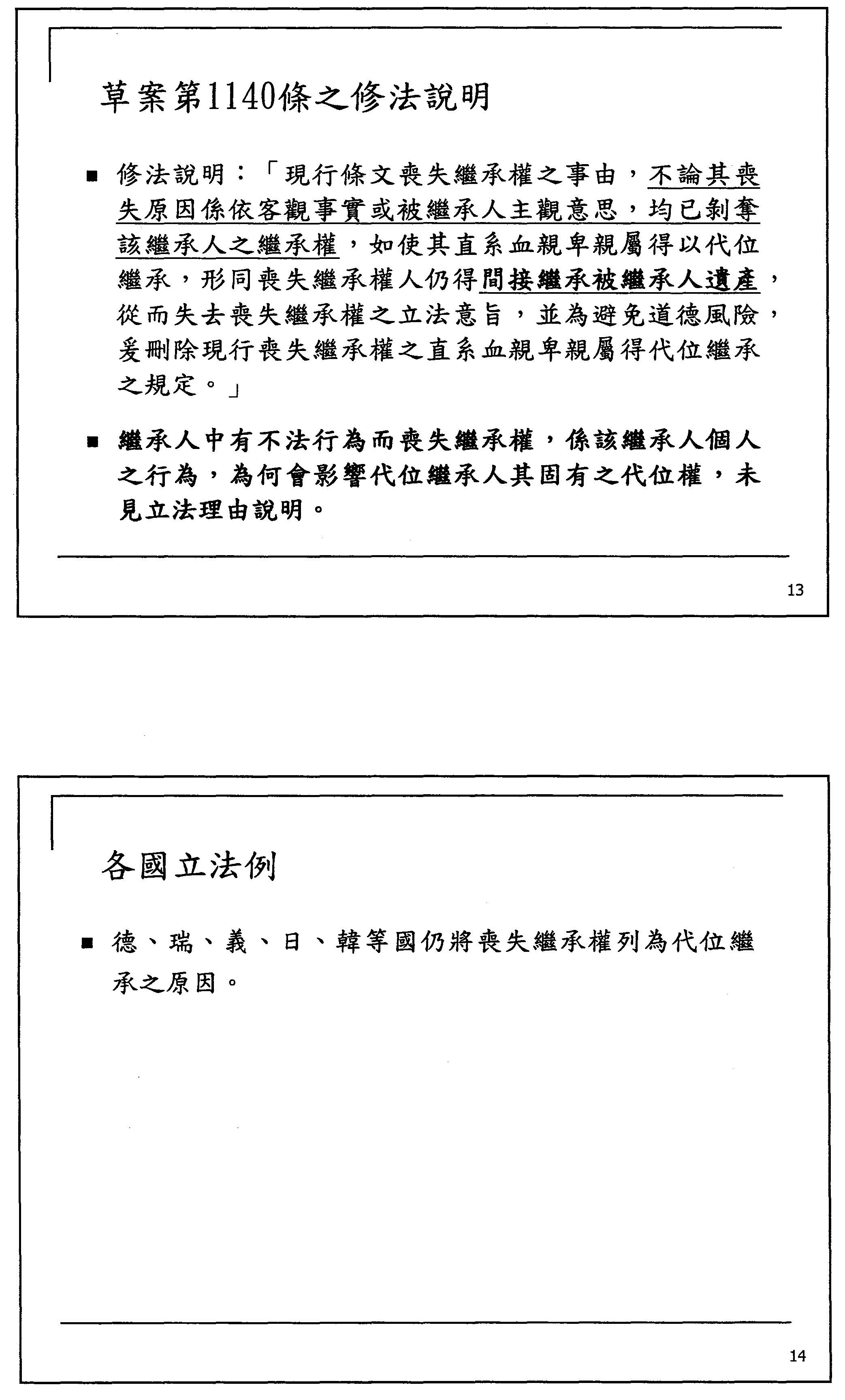 關於代位繼承的規定,我在這裡必須要強烈的聲明,把喪失繼承權從代位繼承的事由裡面拿掉,我們身分法學界一致認為不妥,因為從法理來看,我國的代位權是採取固有權說,這是身為代位人的固有權利,所以不應該受到被代位人行為的影響,包括他因為一些事由而喪失繼承權,然後影響到他們可以代位的可能性,我覺得這是從代位權的性質跟立法精神可以看到的第一點。然後從外國立法例來看,因為我們整個制度其實就是參照德、瑞還有日本的立法例,日本其實也受德、瑞立法例的影響很深,這些國家其實都還是把繼承權喪失列為代位繼承的事由之一。