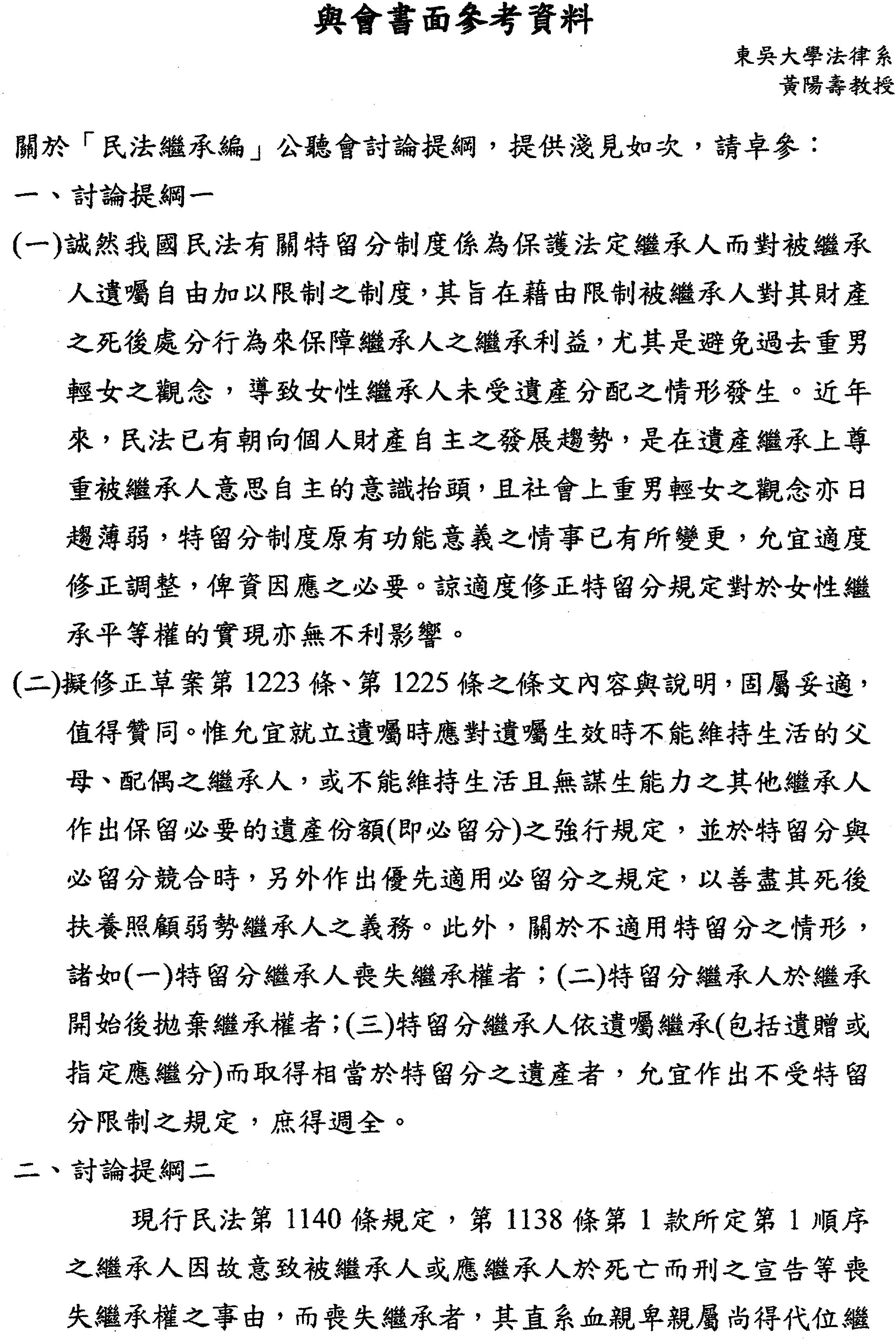 黃陽壽教授:主席、各位委員。我要先簡單的介紹一下。因為我當了46年的律師,也教了30幾年的民法及中國大陸的民法。因為給我的時間非常倉促,所以寫出一份好簡單的書面,我怕你們誤會當一個教授這麼不認真。因此,請大家多多見諒,因為時間太短了。我等一下還會就這份書面與大陸的法制比較,供各位參考。但是我要聲明,我非常愛台灣,絕對不要把我看成紅色的人。