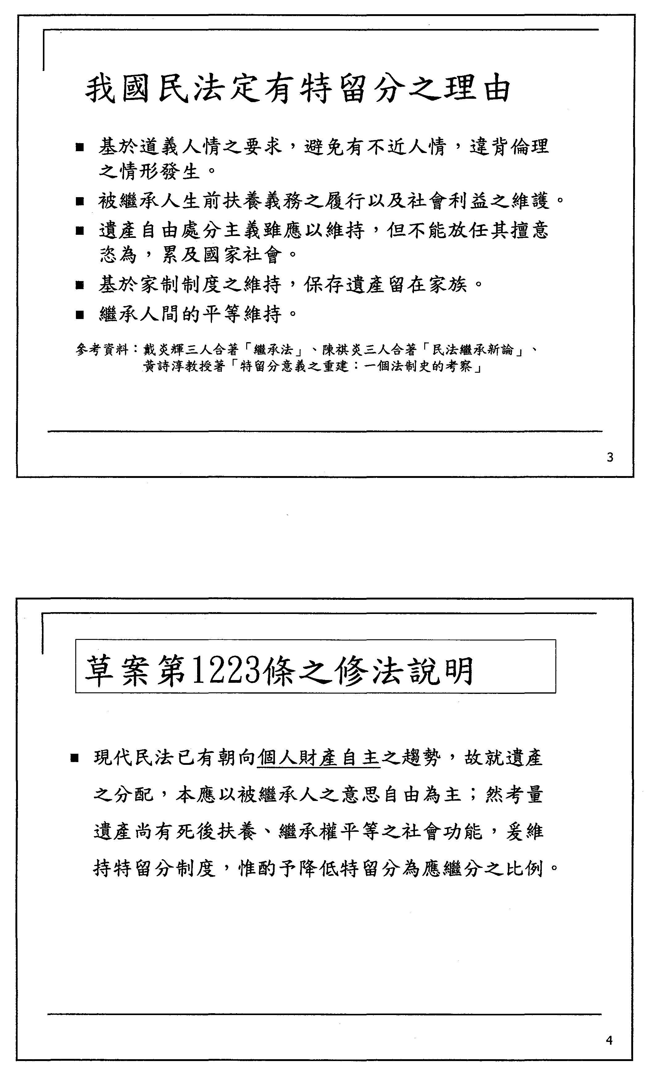第一,關於特留分制度是不是保留?司法院和行政院會銜的版本,主要是考量到有礙於現行國情和文化,我們贊同法務部所採取之漸進式的修法,未來我們認為應該由主管機關隨著時代的變遷和文化的遞移做階段性和滾動式的檢討。