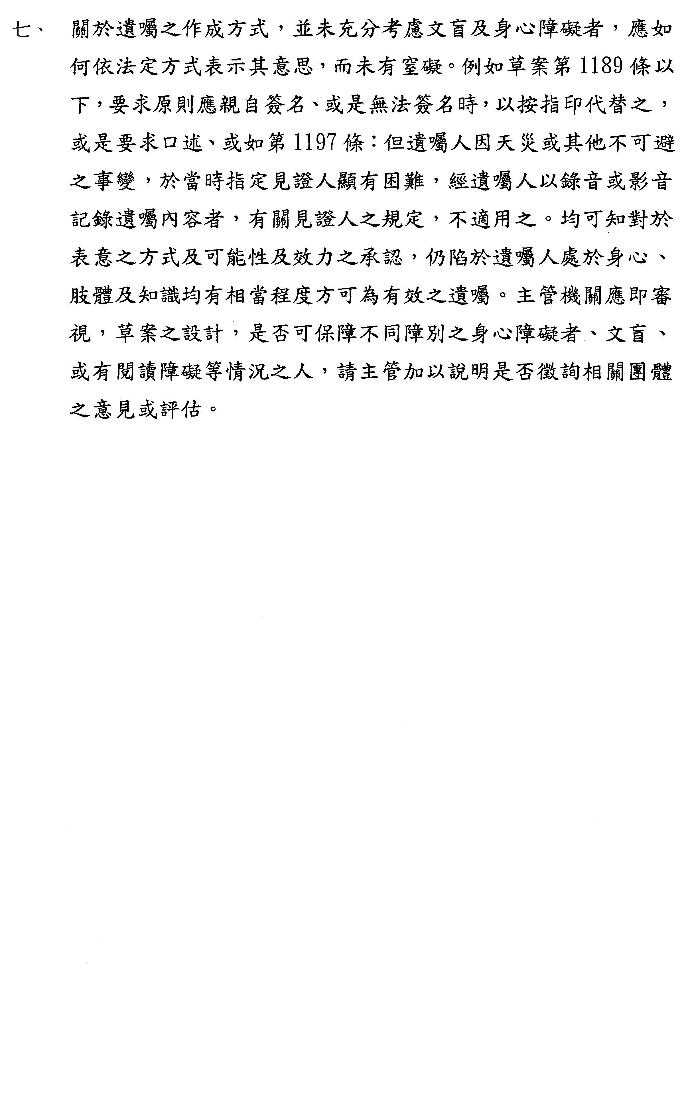 另外關於遺囑的部分,我們沒有考慮到文盲及身心障礙者,像是霍金教授,照我們遺囑修改的方法,他可能完全沒有辦法作成,因為他可能沒有辦法按指印,我們要求簽名,但是要按指印,但有的人可能沒有手腳,那怎麼去判斷?特別是我們的文盲人口中,女性有22萬多人,我們希望在遺囑作成方式是不是可以跟身心障礙團體多了解他們的需要?我們希望能夠尊重他們表意的自由。