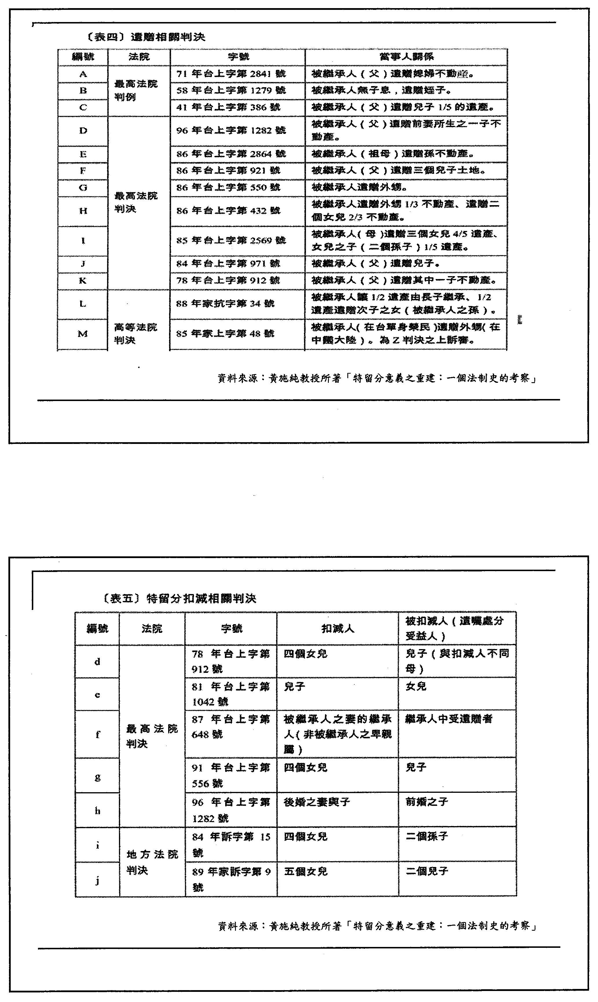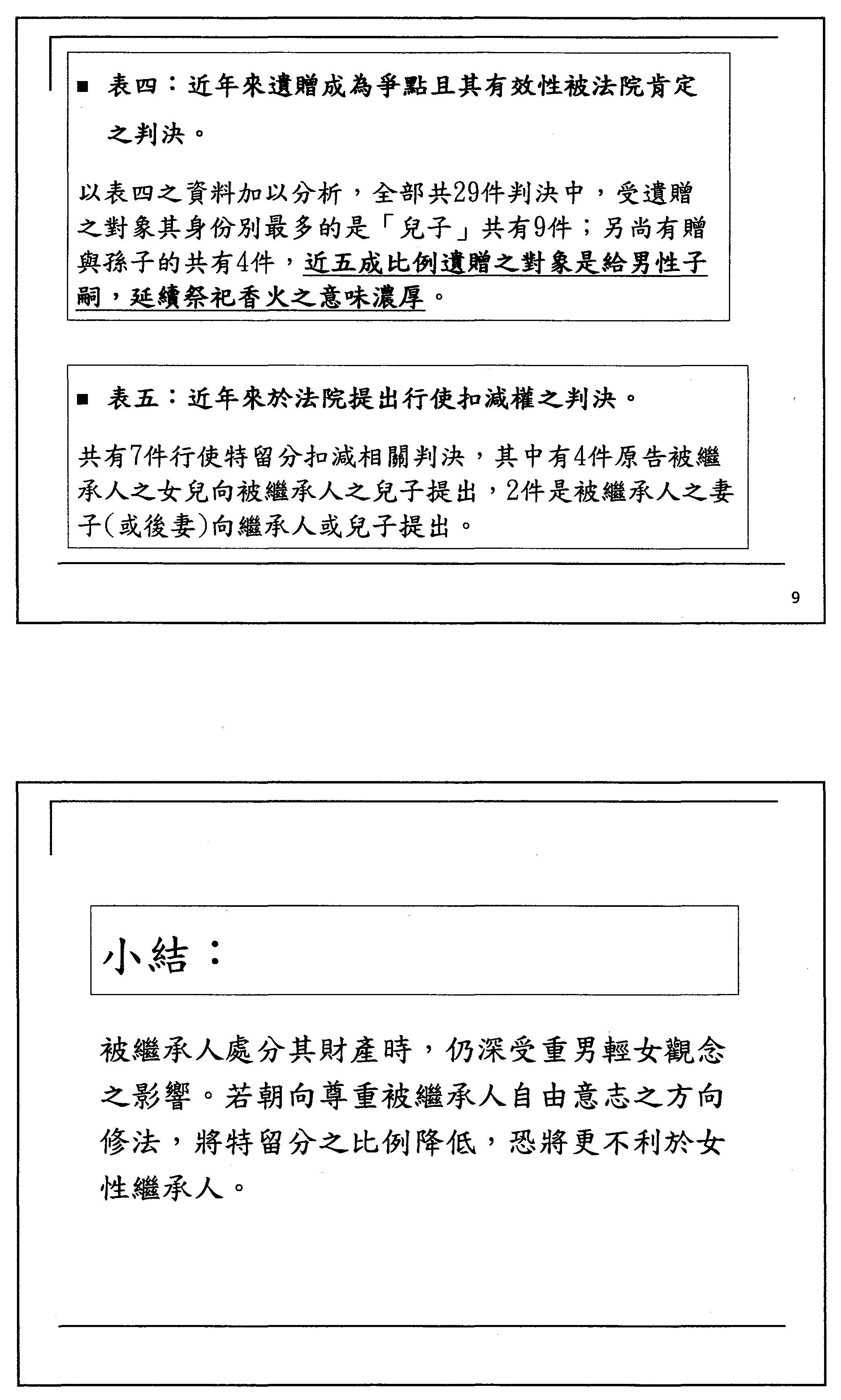 再者,臺大黃施淳教授所寫的一篇文章裡面針對判決所做的整理,簡報中的表四是關於遺贈的相關判決;表五是關於特留分扣減的相關判決,我個人看到這樣的資料後再做了一點分析。表四的贈與部分,在29件判決裡面有9件是贈與給兒子,另外贈與給孫子的有4件,也就是近5成比例的贈與對象是男性子嗣,要延續祭祀香火的意味非常的濃厚;至於表五,針對要提出行使扣減權的判決,7件裡面有4件的原告是女兒,向兒子提出,有2件是妻子向被繼承人的兒子提出,很容易看得出來女性繼承人的權利受到了侵害,所以在比例上才會如此懸殊。我的小結就是,被繼承人處分財產時,仍深受重男輕女觀念之影響。若朝向尊重被繼承人自由意志之方向修法,將特留分之比例降低,恐將更不利於女性繼承人。