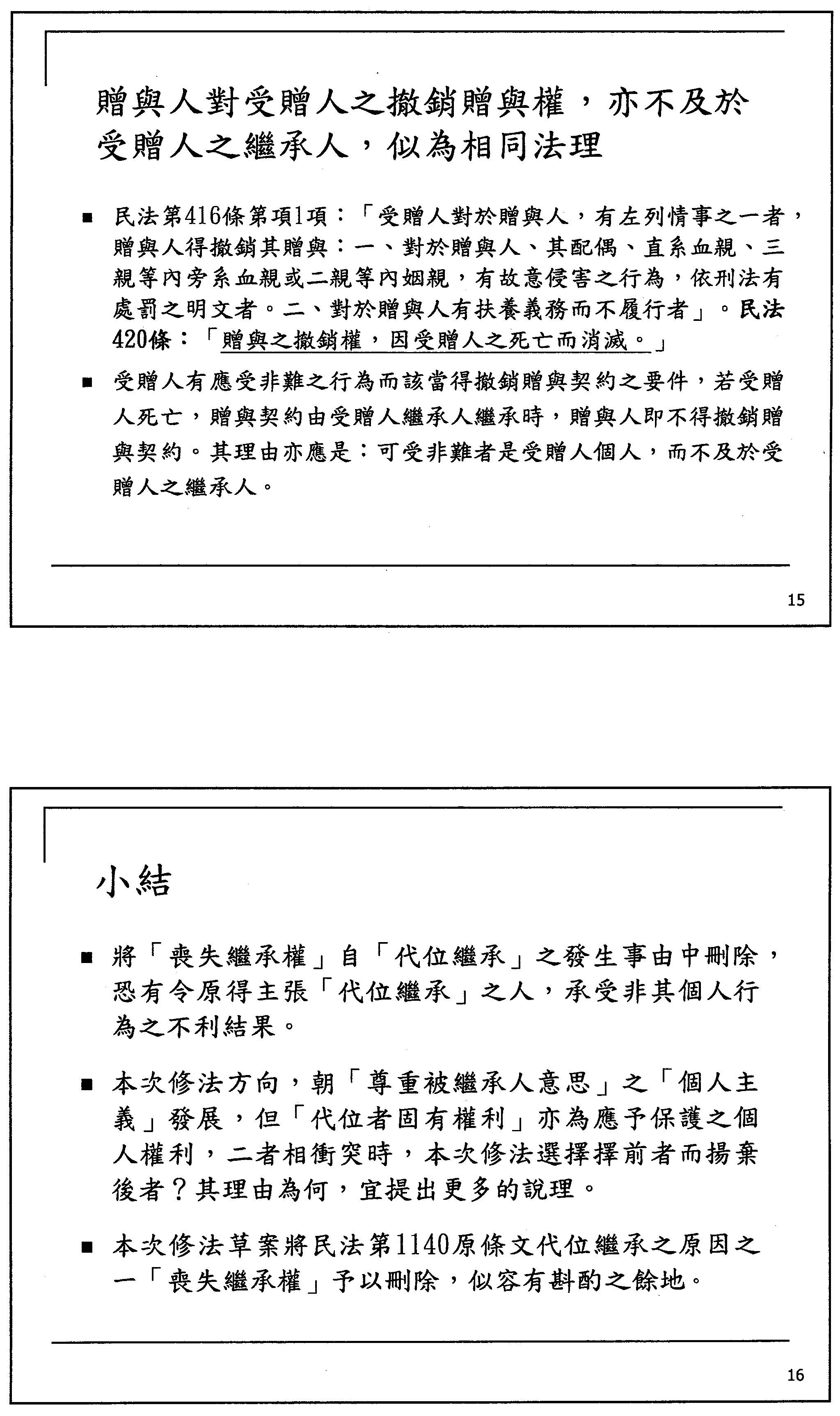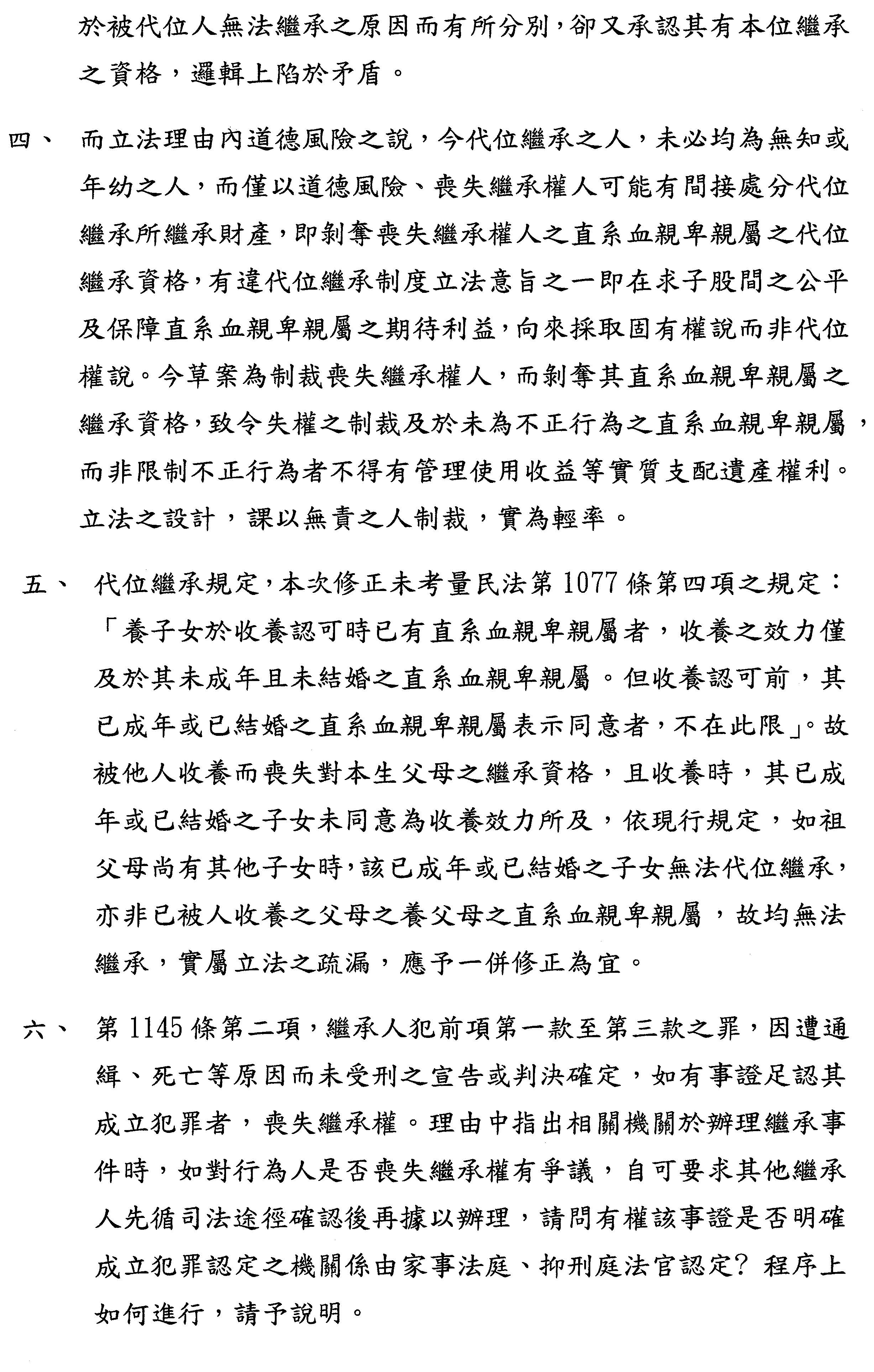 第二個是有關代位繼承的部分,把喪失繼承權的事由刪掉,不作為可以代位繼承的事由,當然,剛剛大部分的學者專家都認為這會影響孫輩的權利,尤其是採固有權說,不過這個當初我們在委員會的修正時,其實也有一些討論,後來部裡面徵詢各機關的意見,其實各位也可以在我們立法理由說明欄的部分看到,例如父繼承祖父的,但是因為父喪失了繼承權,子代位繼承以後,父會間接或實質取得,剛剛當然還有許多學者專家有不同的意見,這個部分我們也是看看下午的討論各位委員的意見如何,我們再來進行實質上面的討論。