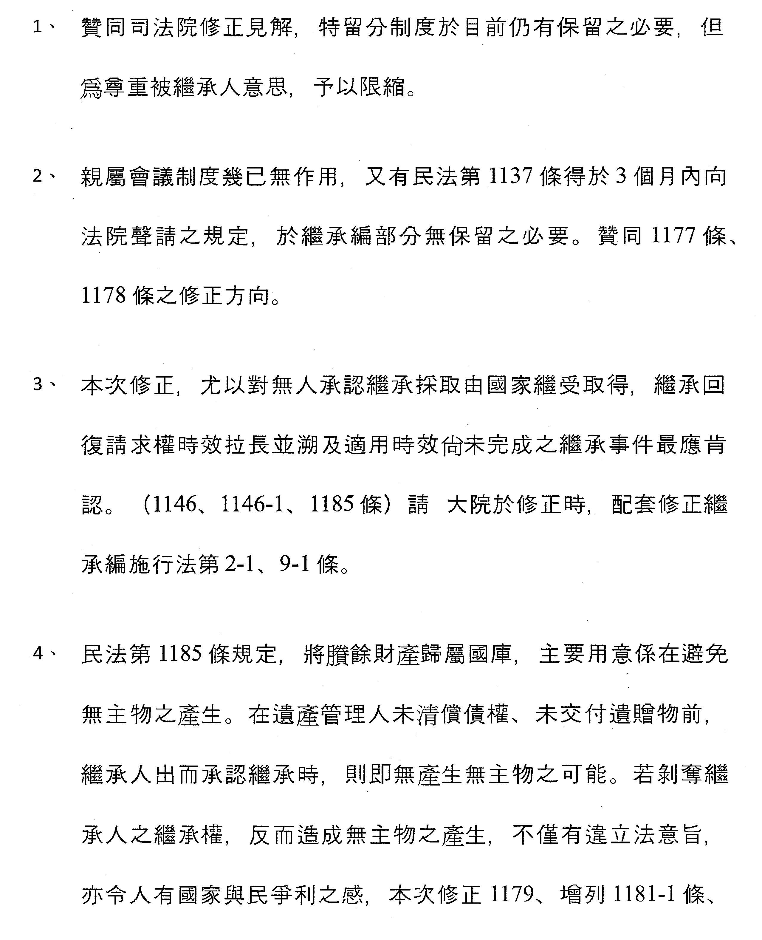 提綱二:現行民法有關特留分的相關規定是否有修正之必要?本院認為,現在民法已經有朝向個人財產自主的趨勢,就遺產的分配,應該以被繼承人的意思自由為主。在考量遺產分配之扶養義務,繼承權平等的社會功能,因此本院和行政院共同提出修正草案,以下就稱之為行政院版本之民法修正草案,本院認為應該維持第一千一百二十三條有關特留分的制度,但是草案就降低特留分應繼分之比率,希望能夠兼顧被繼承人意思的自由,本院立場是尊重法務部的意見。