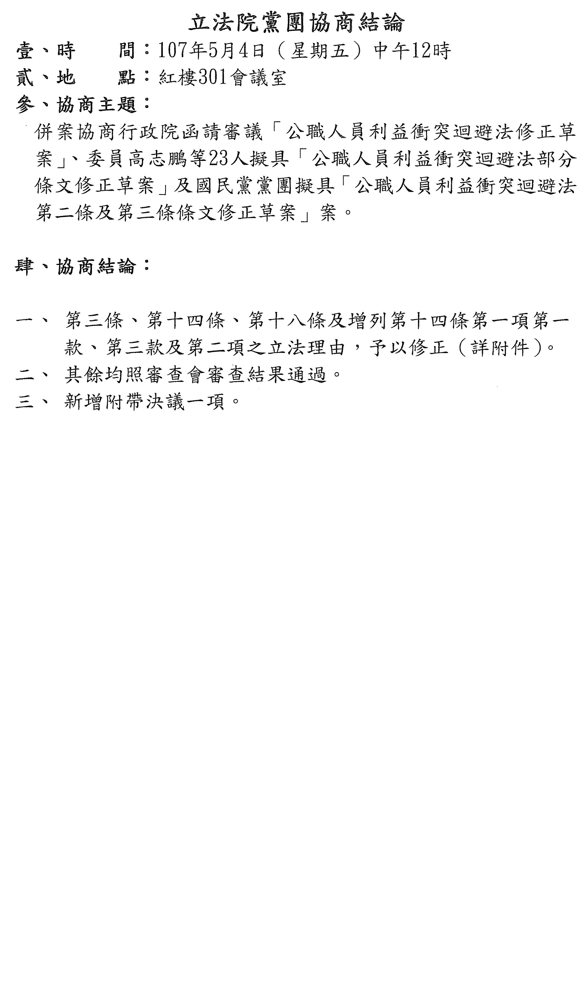 主席:請問院會,對以上協商結論有無異議?(無)無異議。本案逐條討論時,逕依協商結論處理。