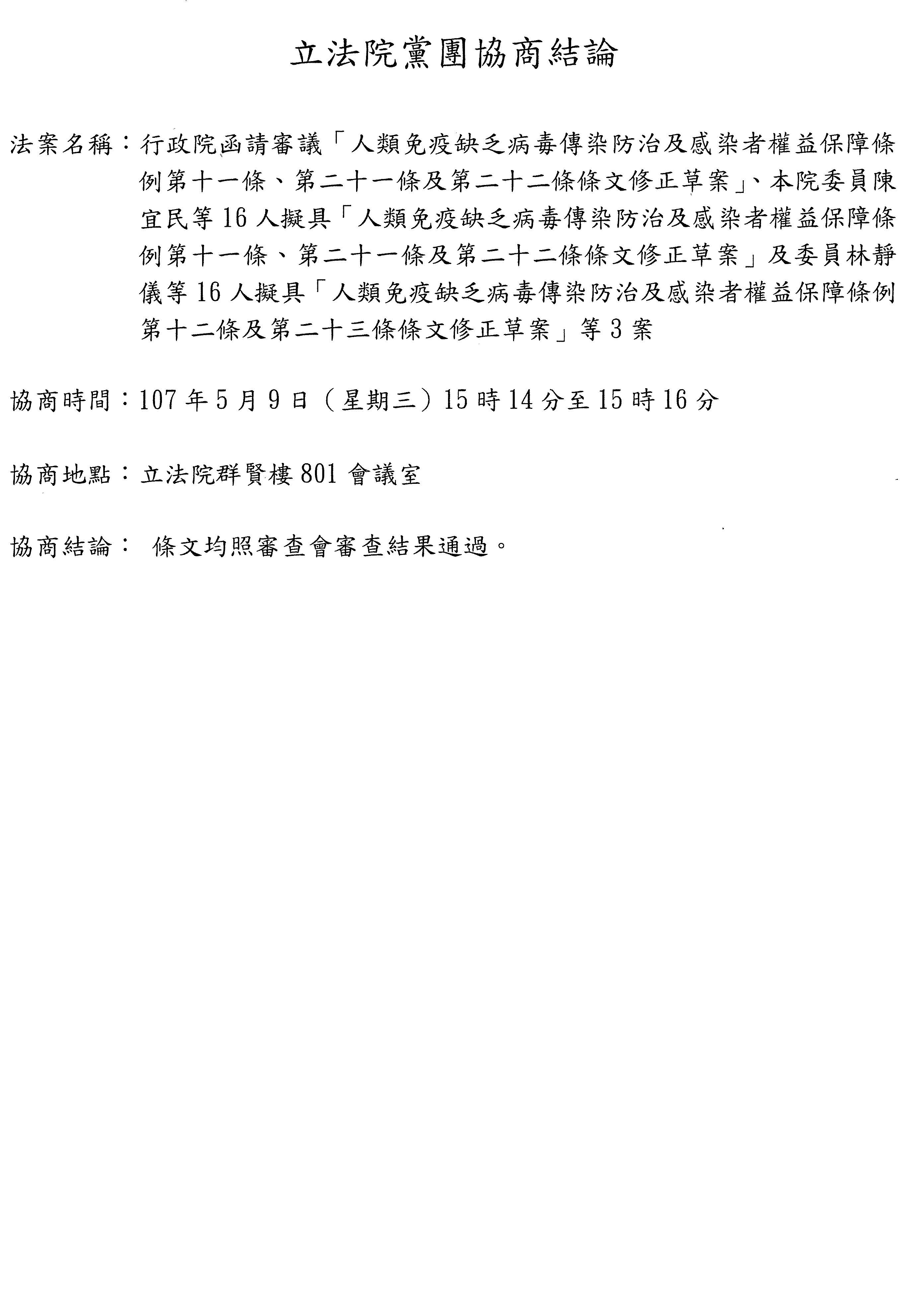 二、協商併案審查行政院函請審議、委員陳宜民等16人擬具「人類免疫缺乏病毒傳染防治及感染者權益保障條例第十一條、第二十一條及第二十二條條文修正草案」、委員林靜儀等16人擬具「人類免疫缺乏病毒傳染防治及感染者權益保障條例第十二條及第二十三條條文修正草案」案。