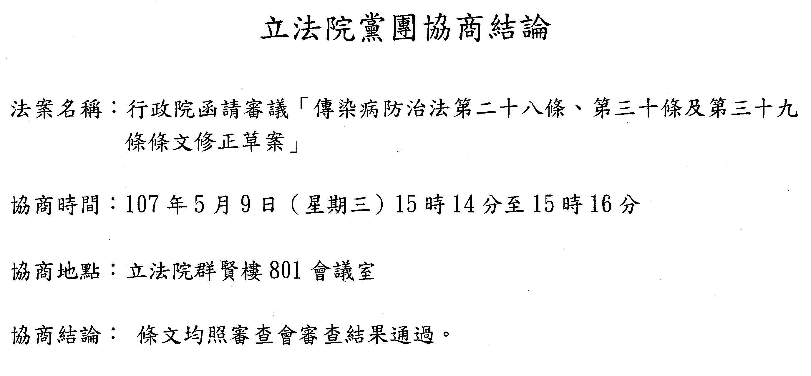協商主題 一、協商行政院函請審議「傳染病防治法第二十八條、第三十條及第三十九條條文修正 草案」案。