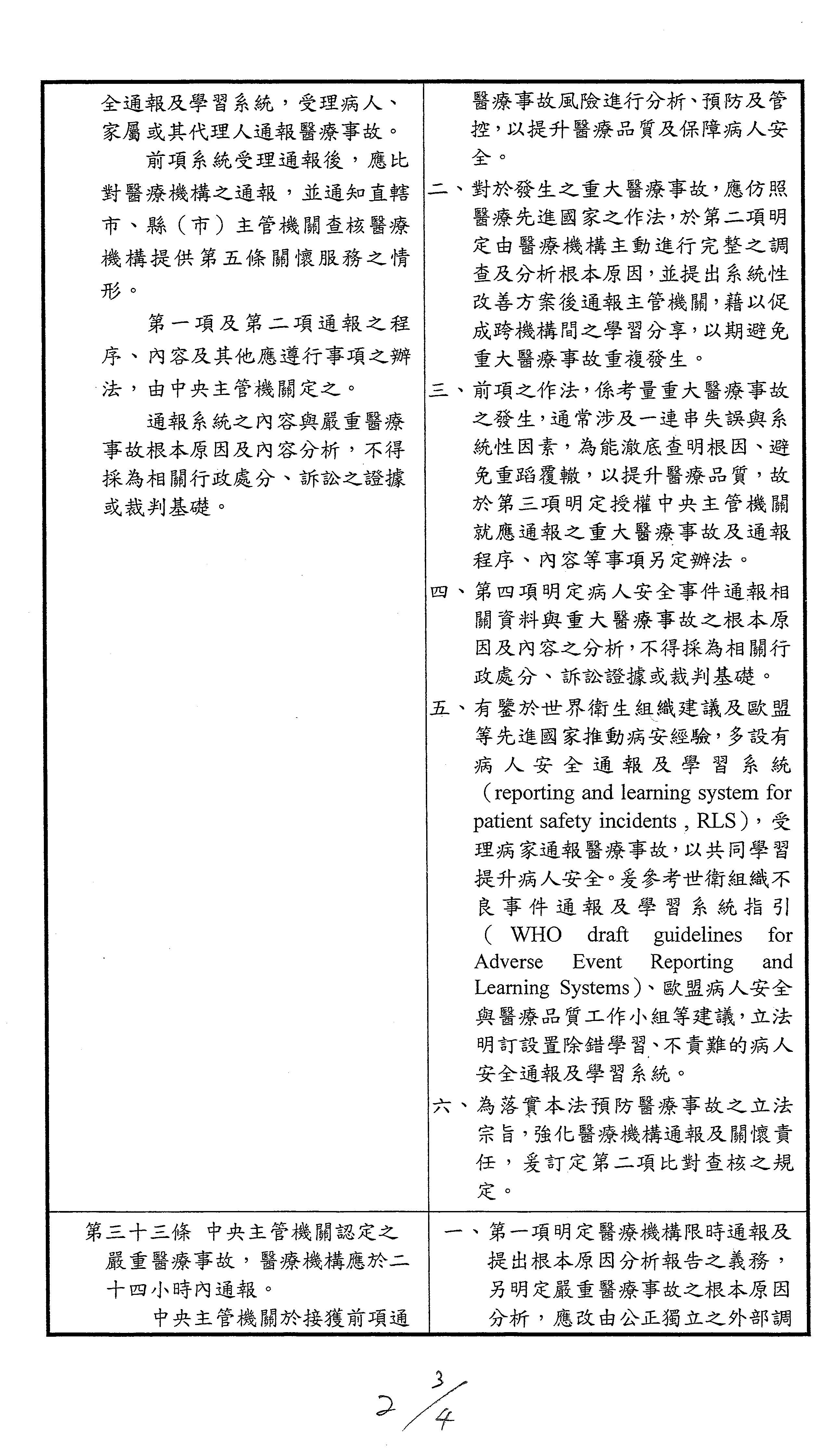 行政院提案: 第三十三條 中央主管機關認定之嚴重醫療事故,應自行或委託具醫事專業之財團法人、機構或團體成立專案小組進行調查,並提出報告後公布之。 前項專案調查,得通知醫療事故有關人員到場說明及提供資料,被調查之醫療機構、法人、團體或有關人員,不得規避、妨礙或拒絕。 第一項嚴重醫療事故之認定、專案小組之組成、運作方式及其他應遵行事項之辦法,由中央主管機關定之。 第一項調查報告之公布應符合個人資料保護法之規定及共同學習之原則,並遵守保密規定。 |