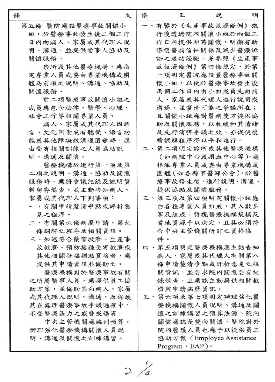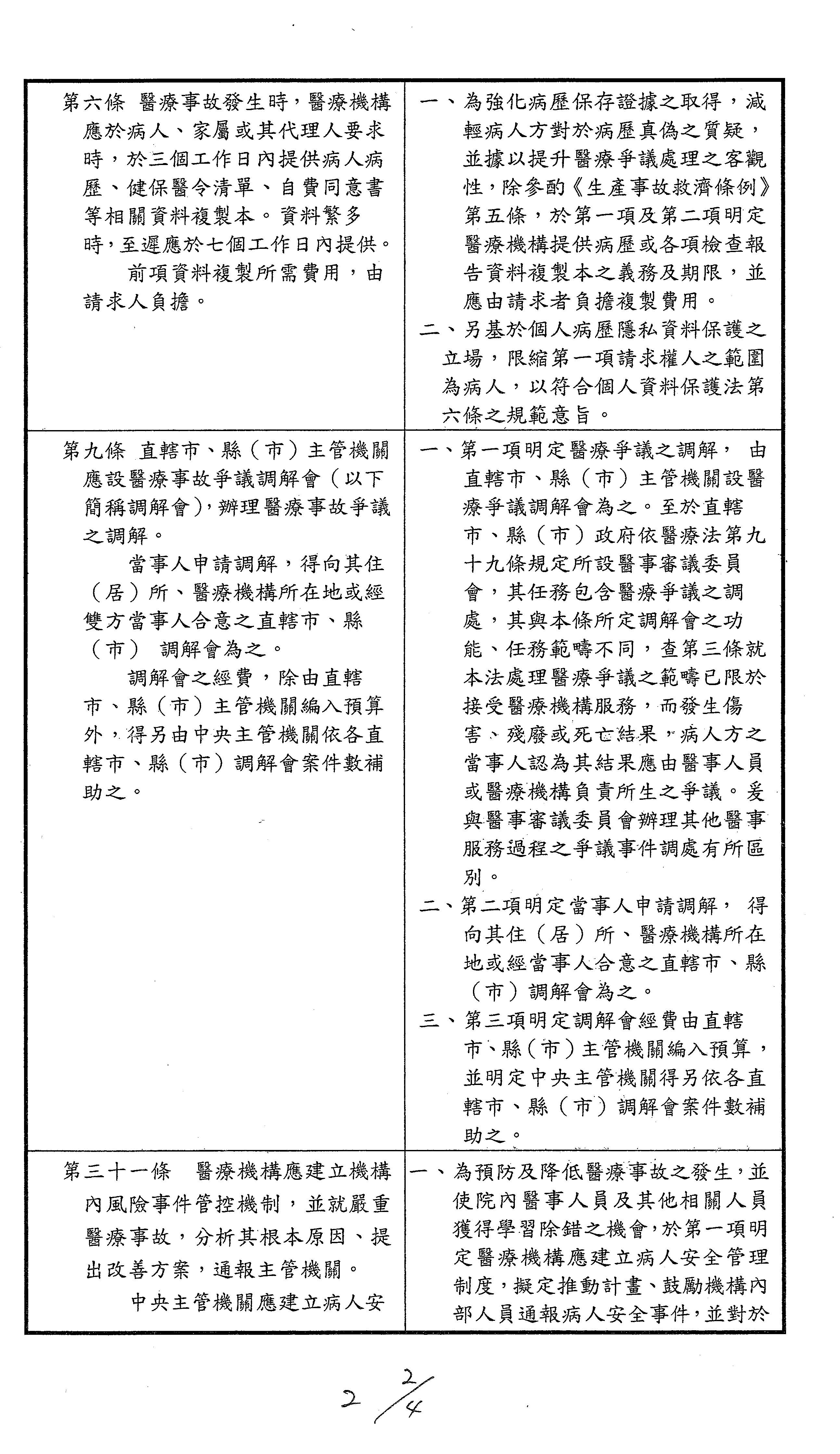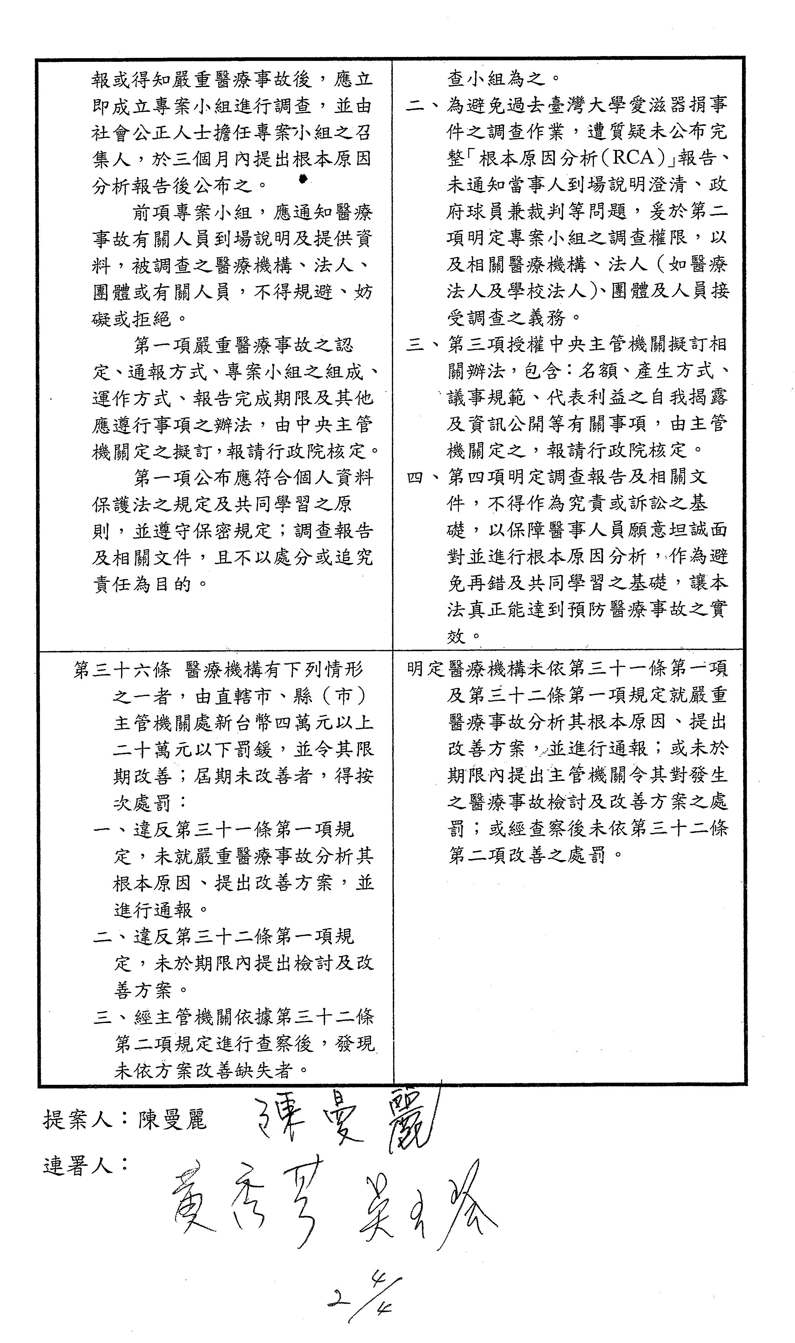 委員陳宜民等19人提案: 第三十二條 主管機關對發生醫療事故或醫療爭議之醫療機構,得視需要令其限期分析發生原因,並提出檢討及改善方案。 主管機關得於前條第二項通報或前項提出檢討及改善方案後一年內,查察改善方案之執行。 |