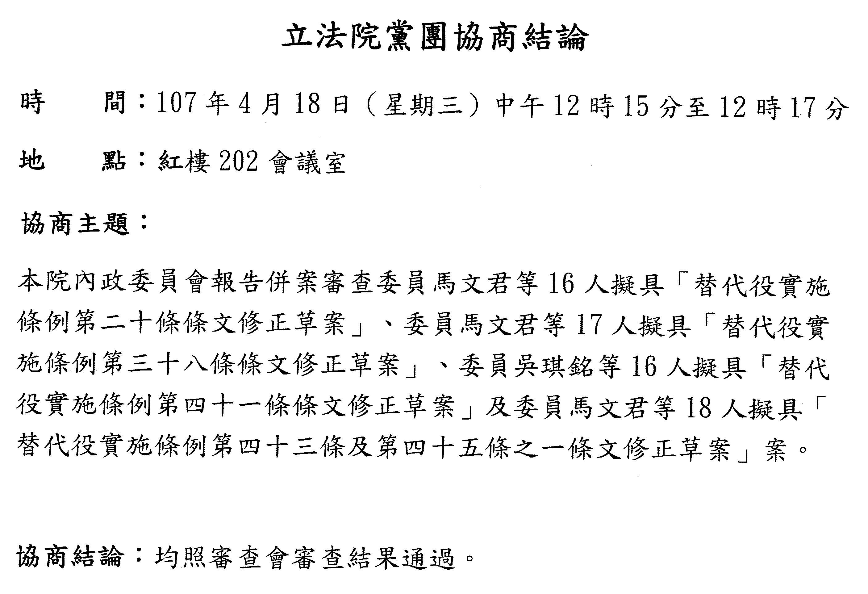 協商主題 一、本院內政委員會報告併案審查委員馬文君等16人擬具「替代役實施條例第二十條條文修正草案」、委員馬文君等17人擬具「替代役實施條例第三十八條條文修正草案」、委員吳琪銘等16人擬具「替代役實施條例第四十一條條文修正草案」及委員馬文君等18人擬具「替代役實施條例第四十三條及第四十五條之一條文修正草案」案。二、本院內政委員會併案審查行政院函請審議「社會團體法草案」、委員賴瑞隆等16人擬具「社會團體法草案」、委員洪宗熠等25人擬具「社會團體法草案」案。三、本院委員陳曼麗等18人擬具「社會團體法草案」案。