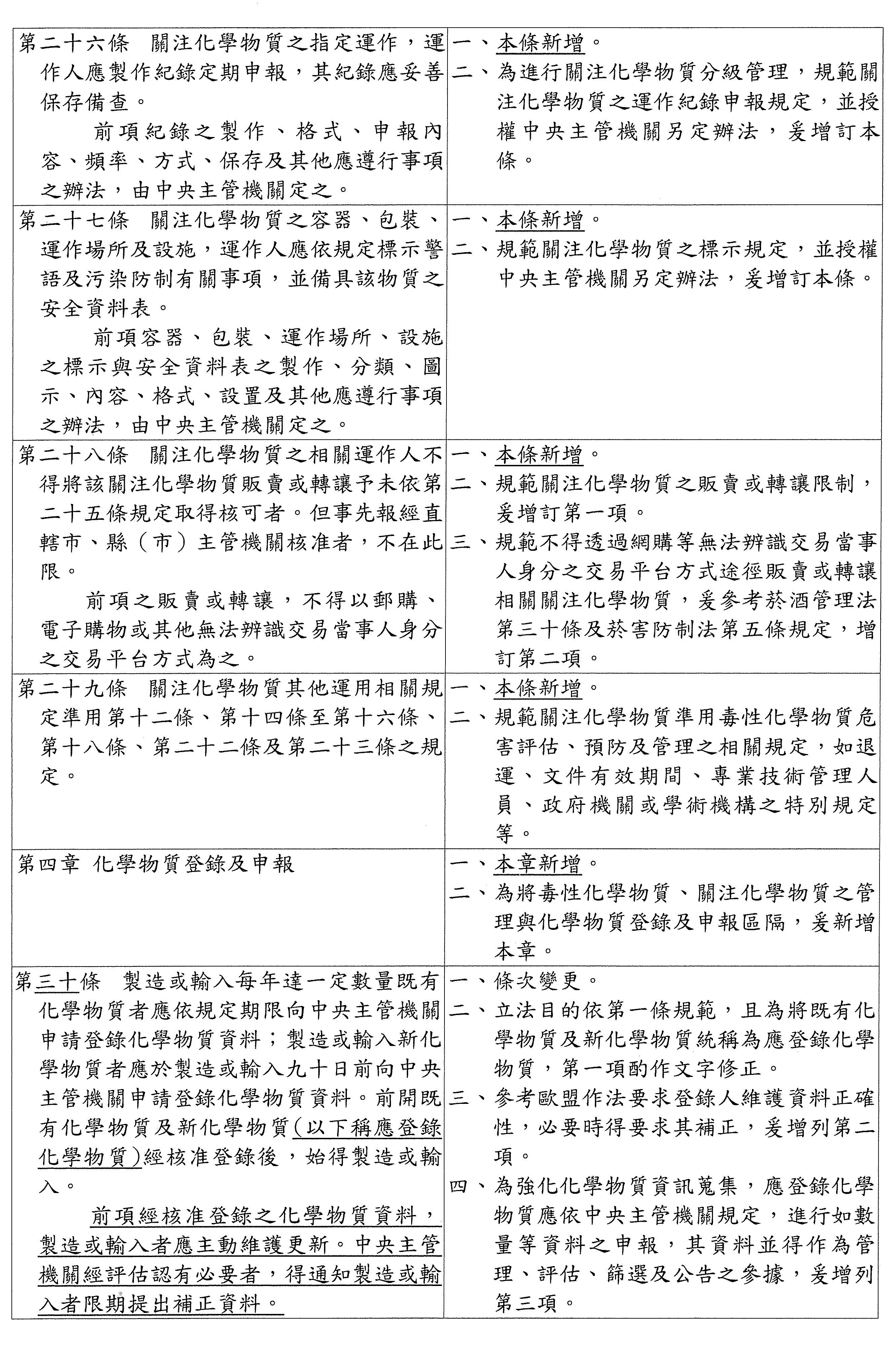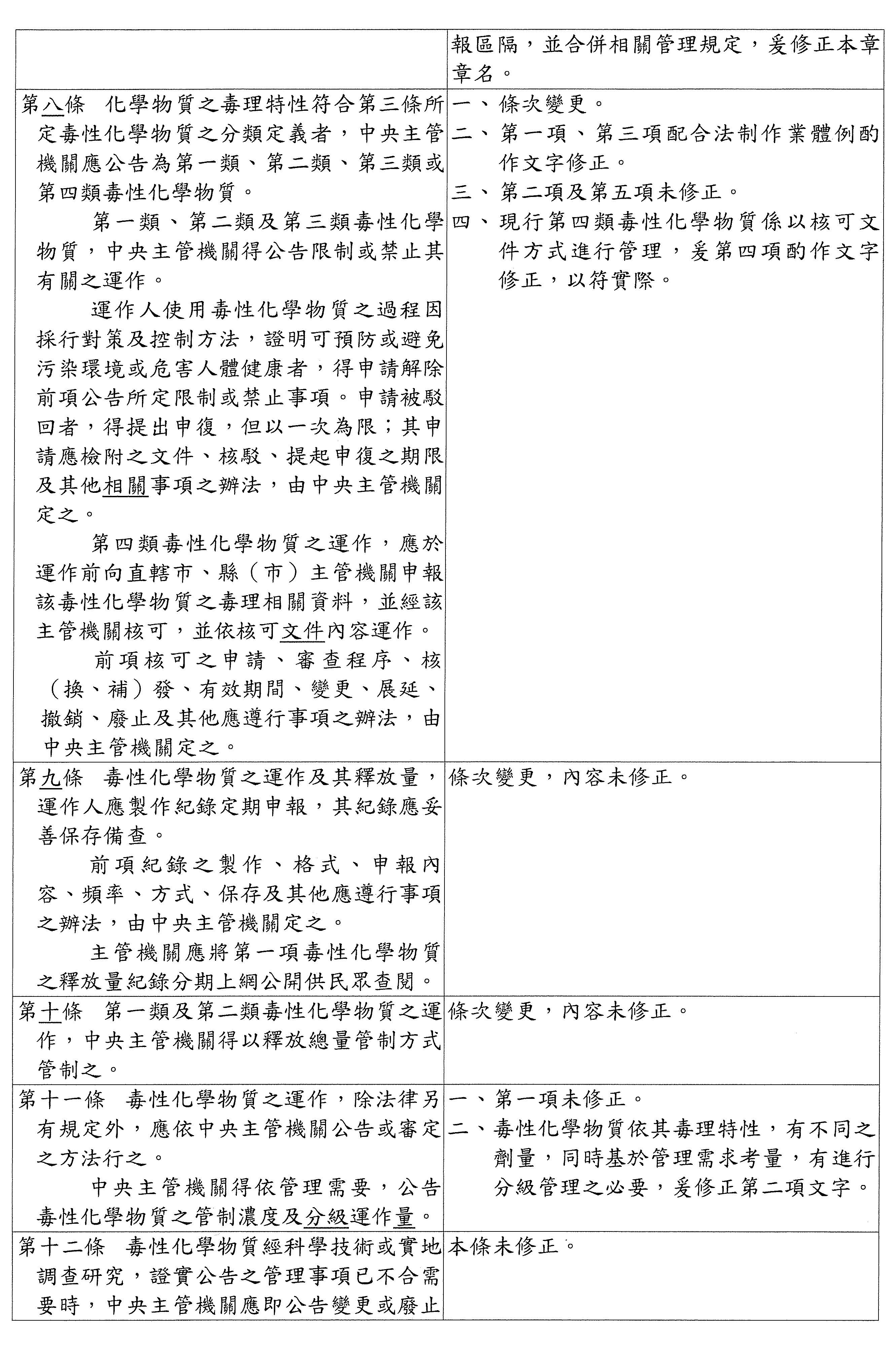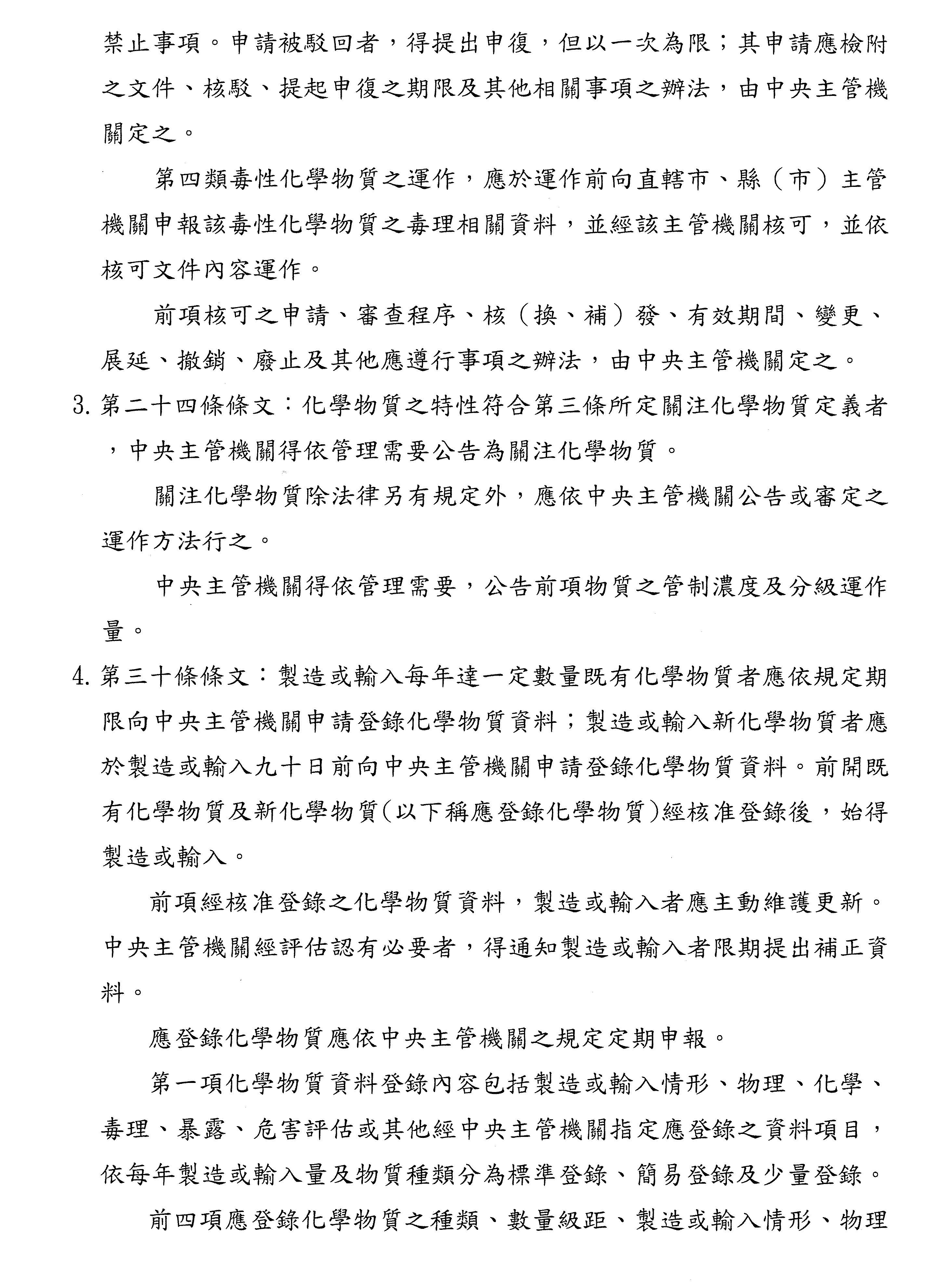 爰建請中央環境保護主管機關應於本法修正完成施行後一年內,重新檢討目前列入第四類毒性化學物質管理之化學物質,是否需列入前三類毒性化學物質來管理或列入關注化學物質來管理。