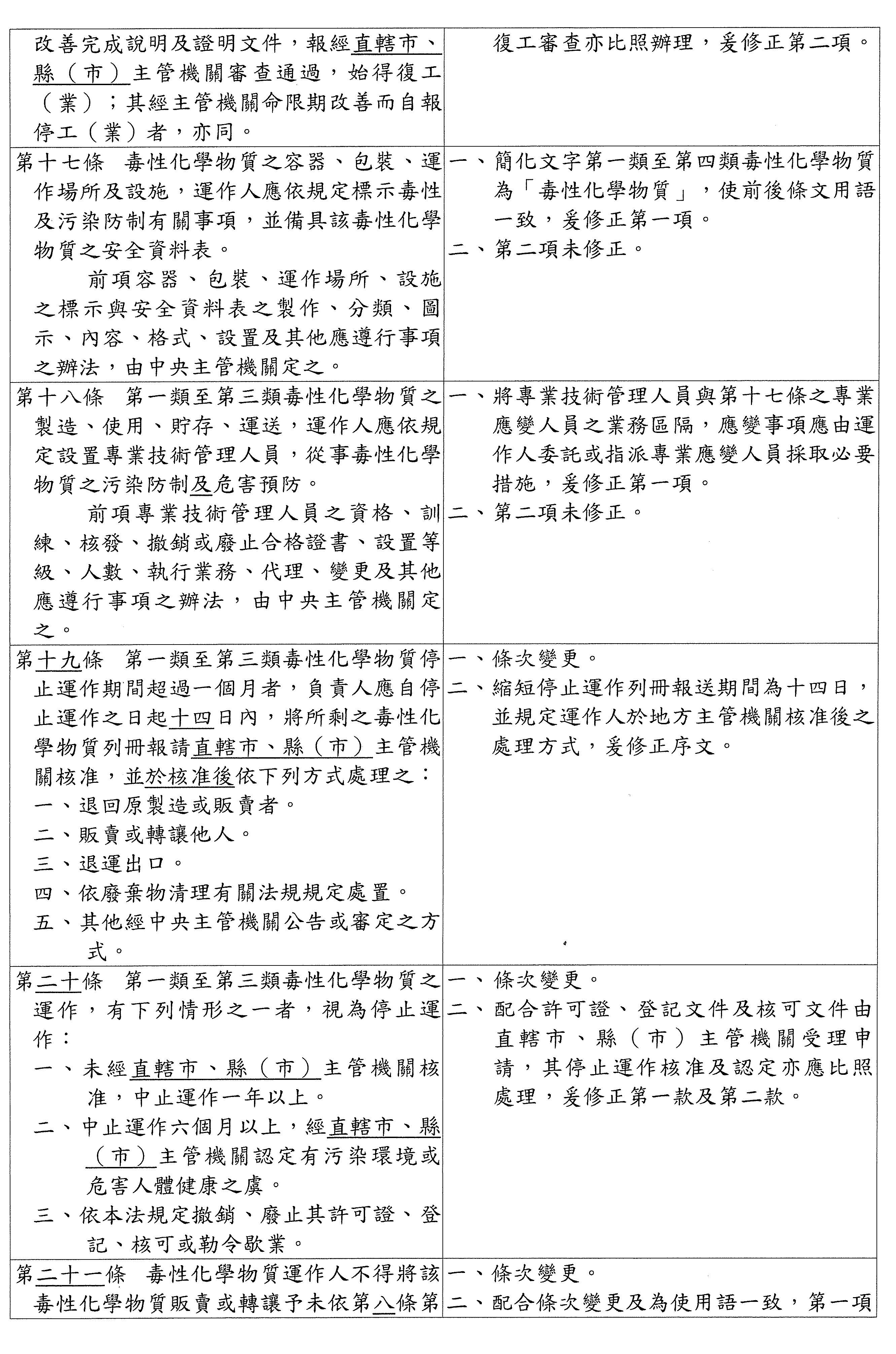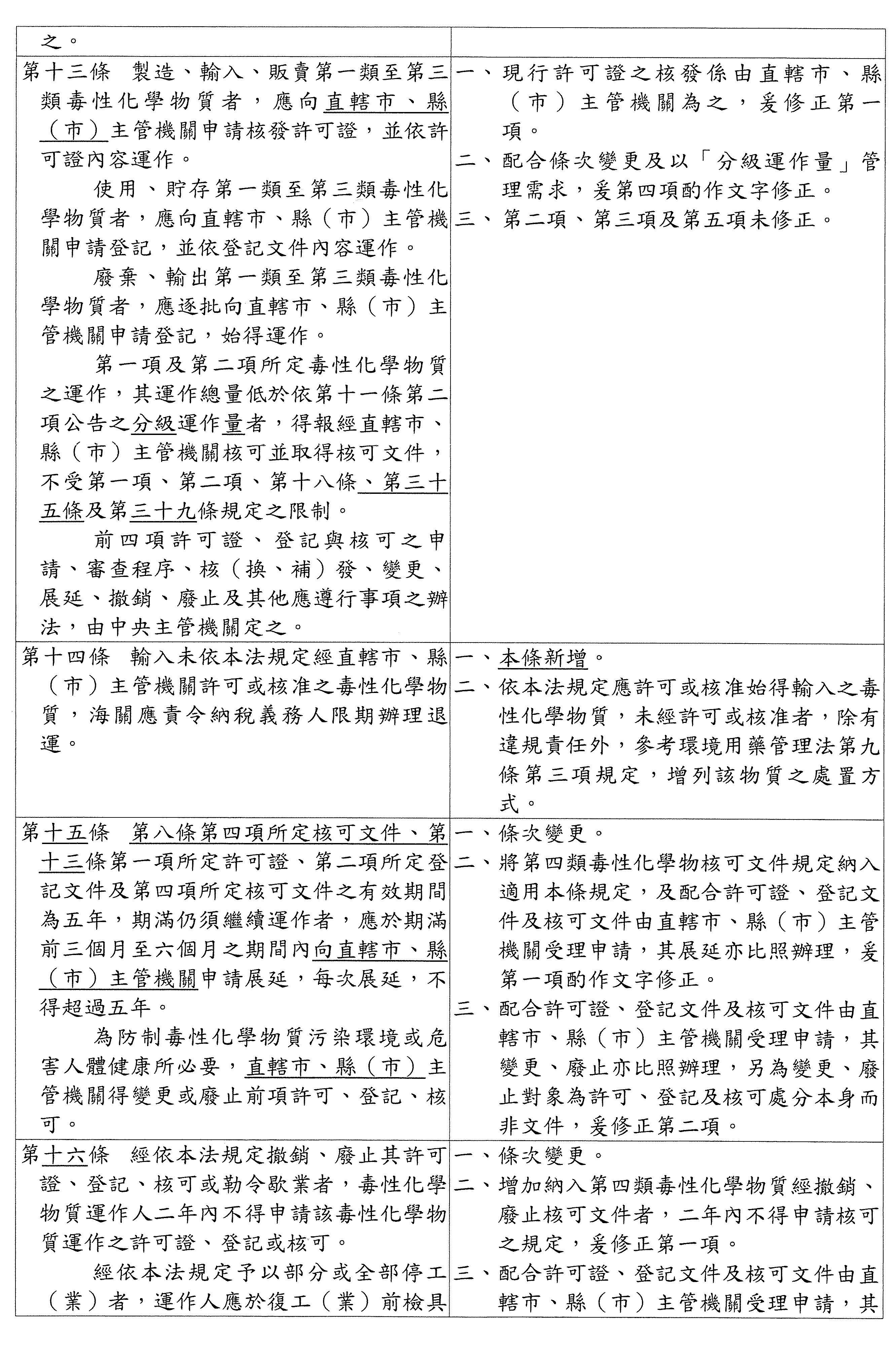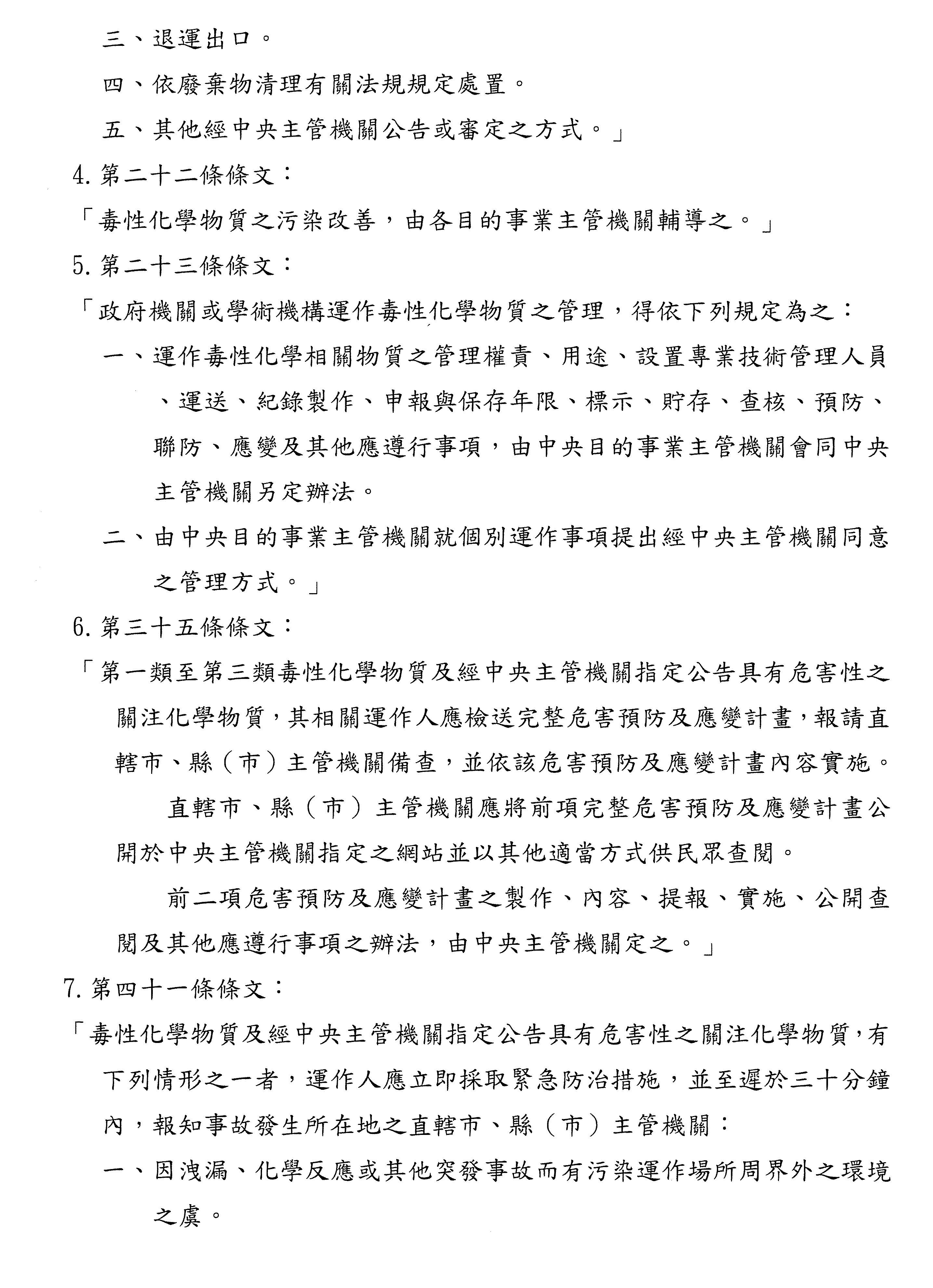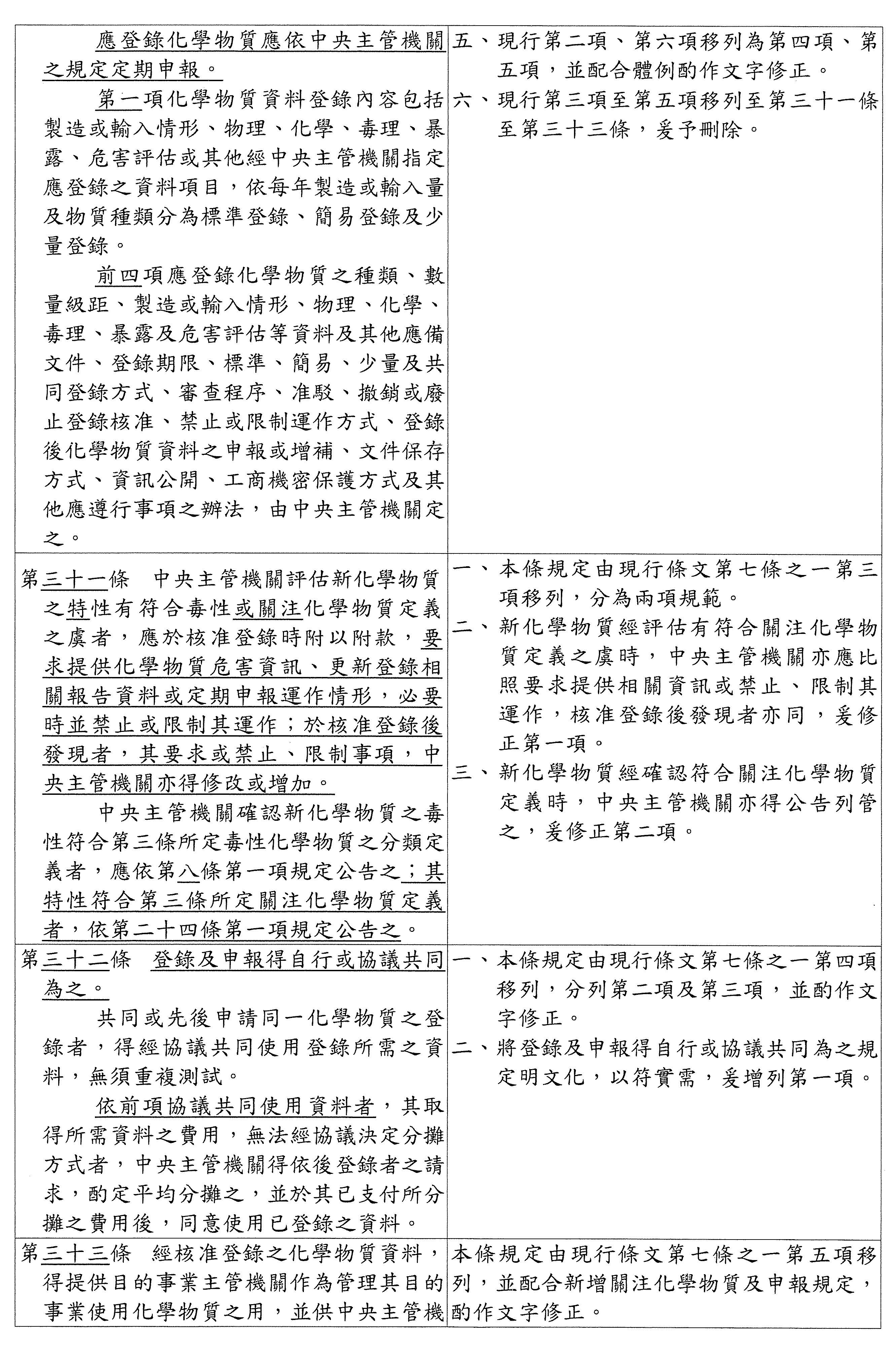 爰建請中央環境保護主管機關應於本法修正完成施行後一年內,重新檢討目前列入第四類毒性化學物質管理之化學物質,是否需列入前三類毒性化學物質來管理或列入關注化學物質來管理。