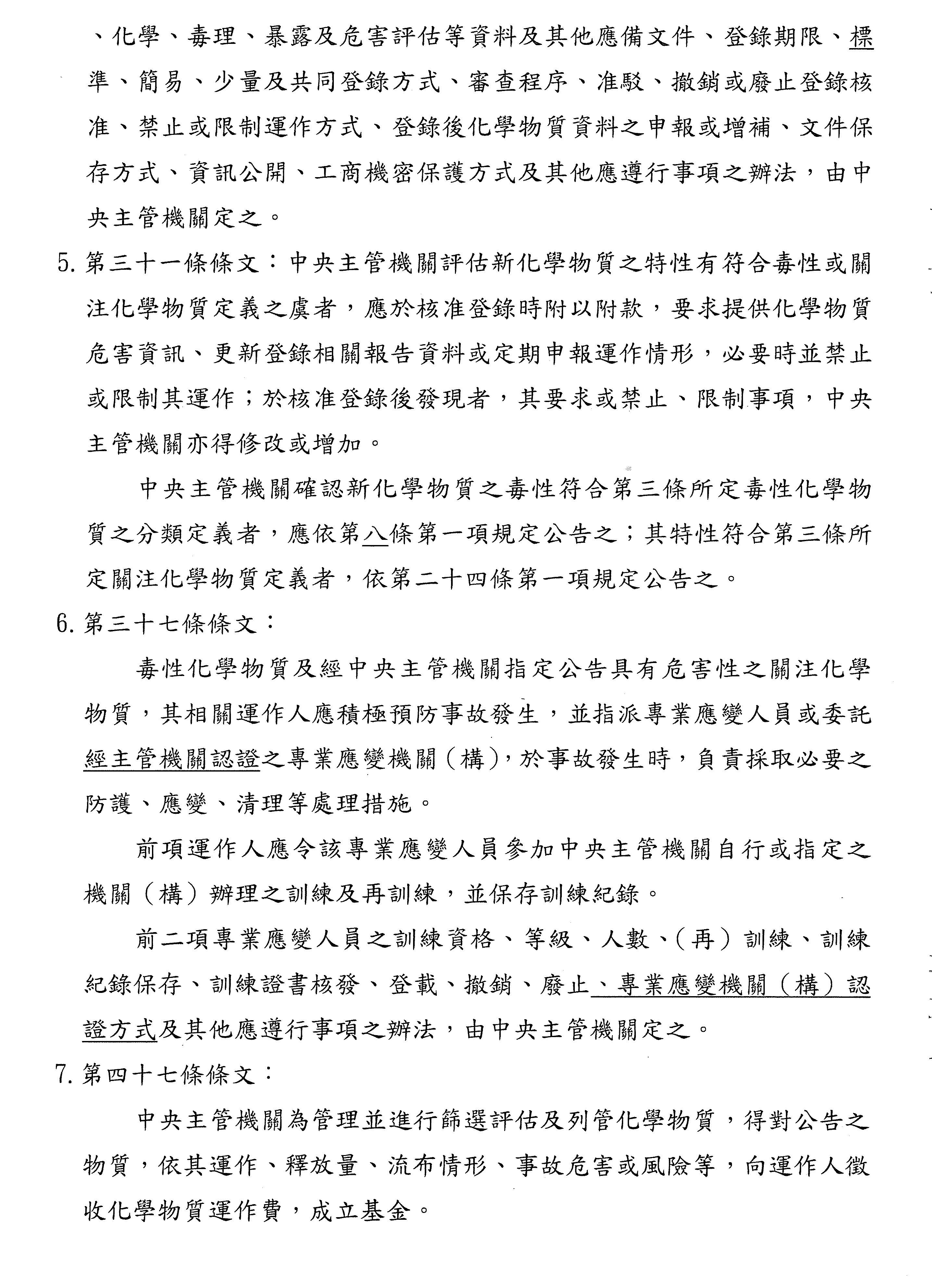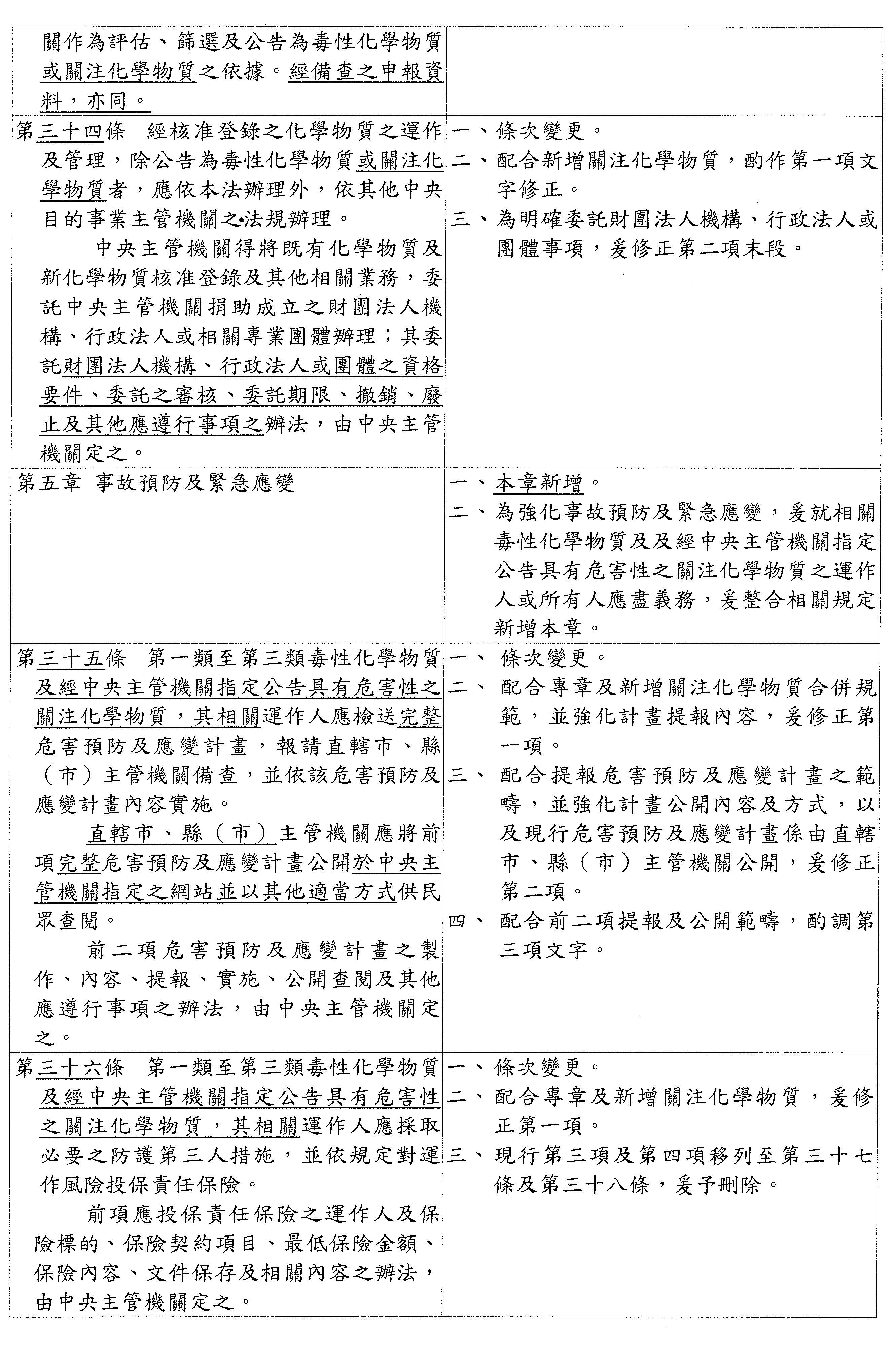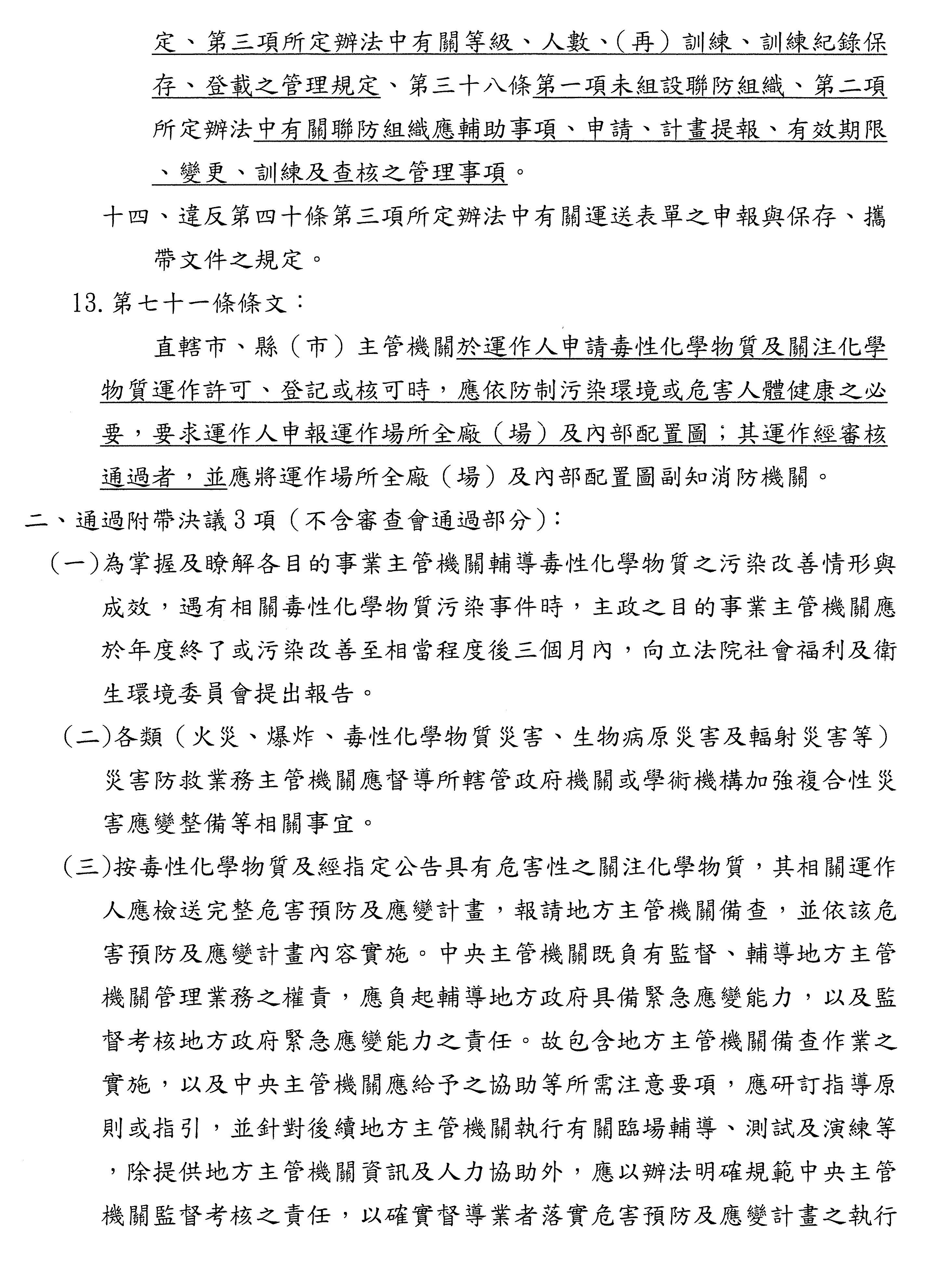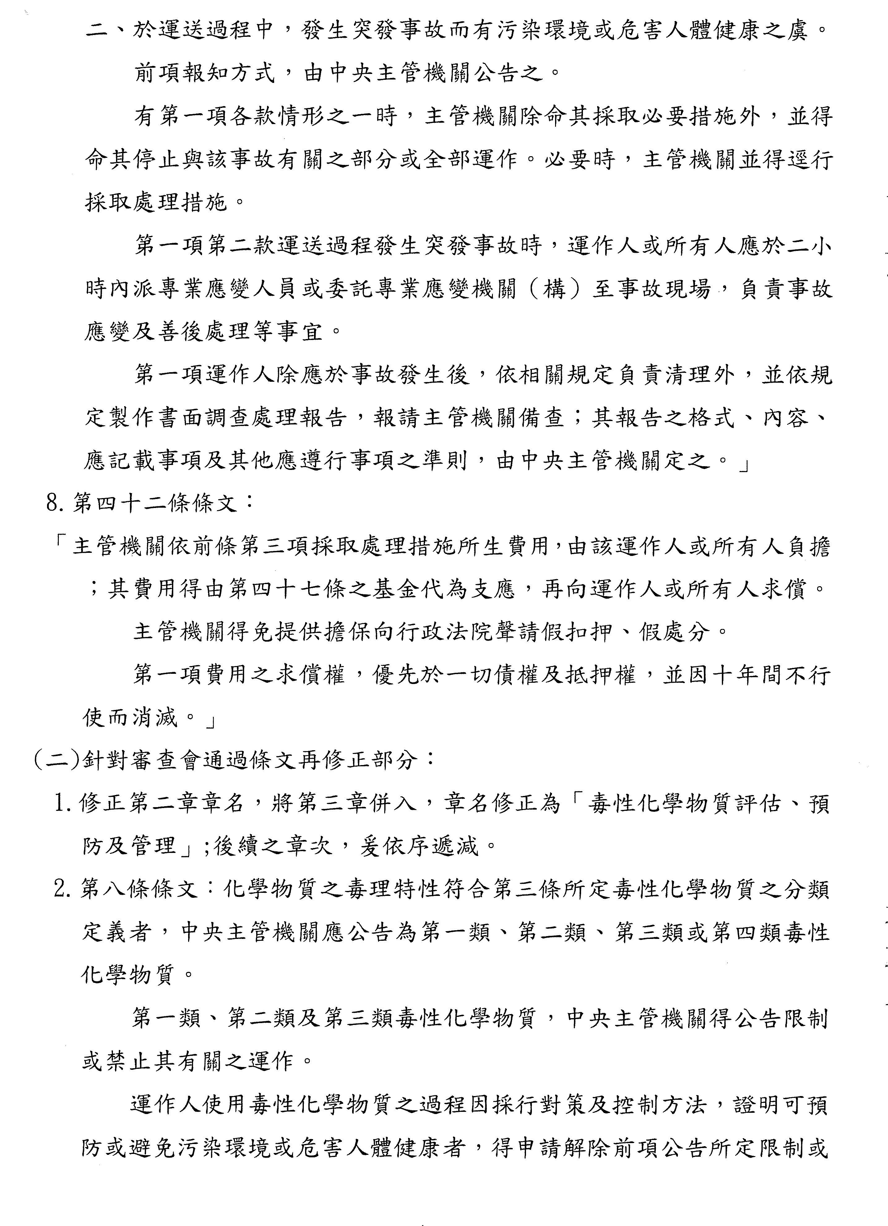 其次,為了強化化災環境事故的應變,本席還特別要求在修法過程中增列事故預防及緊急應變的專章,整合毒性化學物質及具危害性關注化學物質業者應辦理相關的預防及應變措施,以強化政府部門及業者對於化災的重視及處理能力。