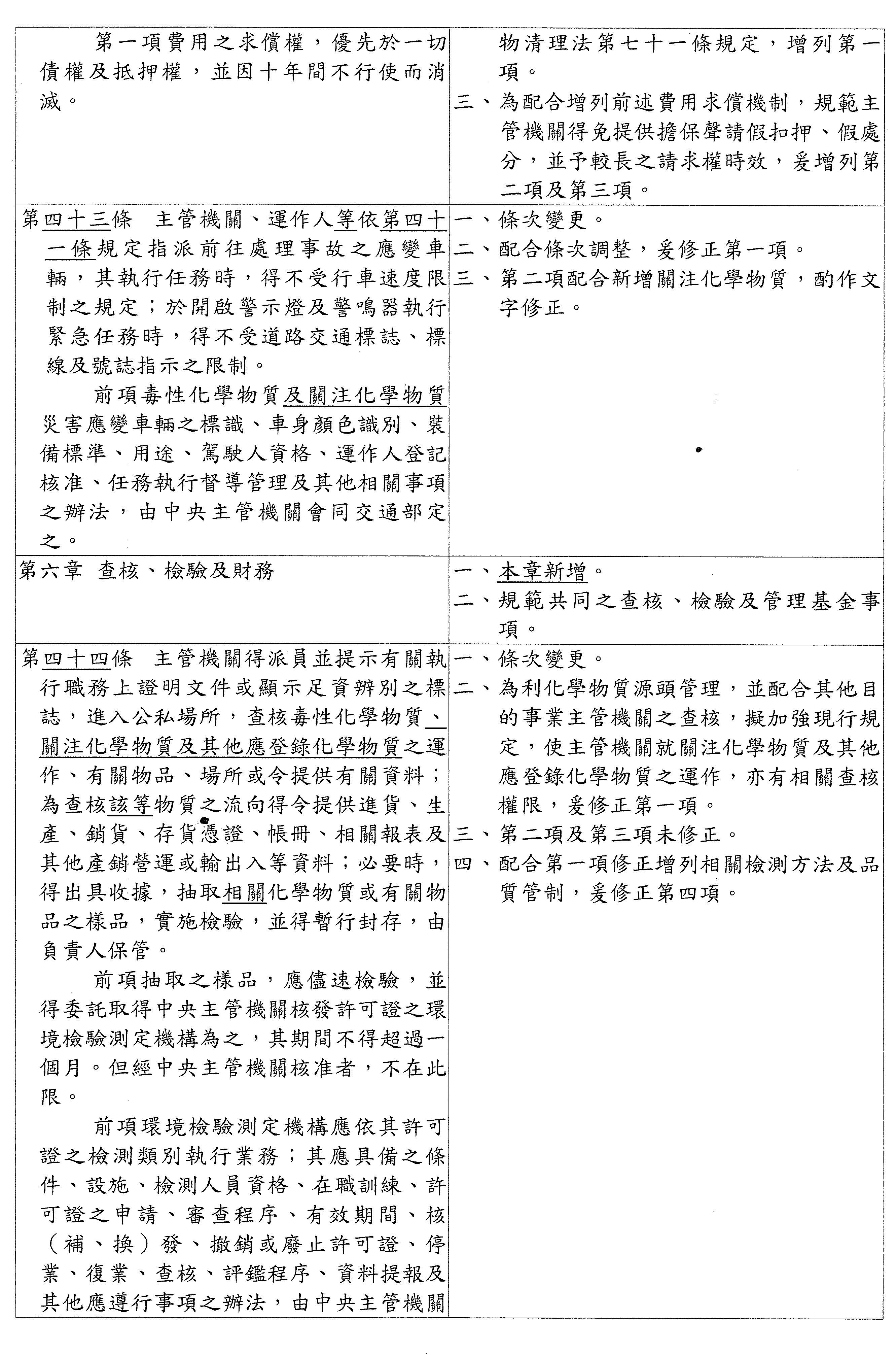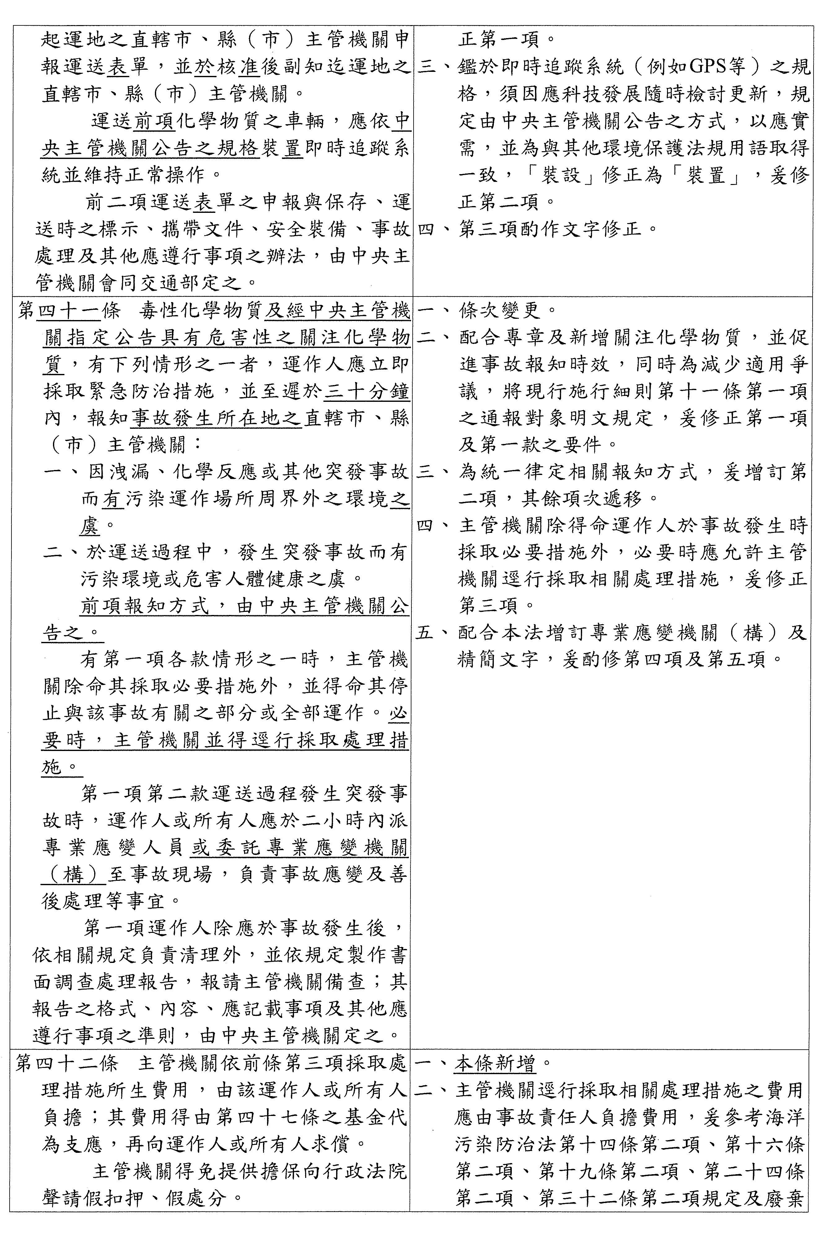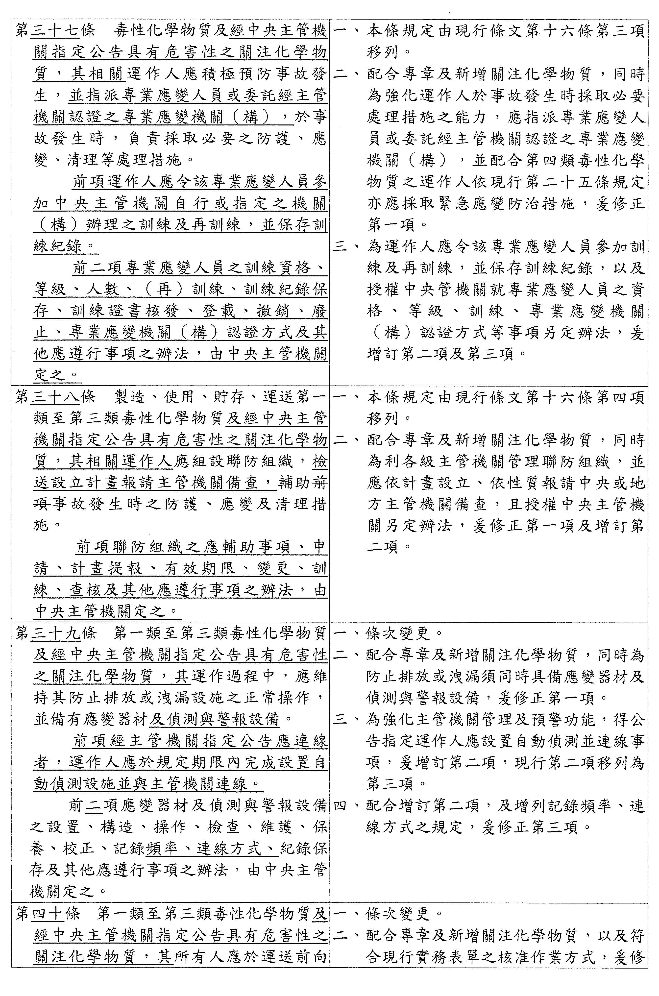 其次,為了強化化災環境事故的應變,本席還特別要求在修法過程中增列事故預防及緊急應變的專章,整合毒性化學物質及具危害性關注化學物質業者應辦理相關的預防及應變措施,以強化政府部門及業者對於化災的重視及處理能力。