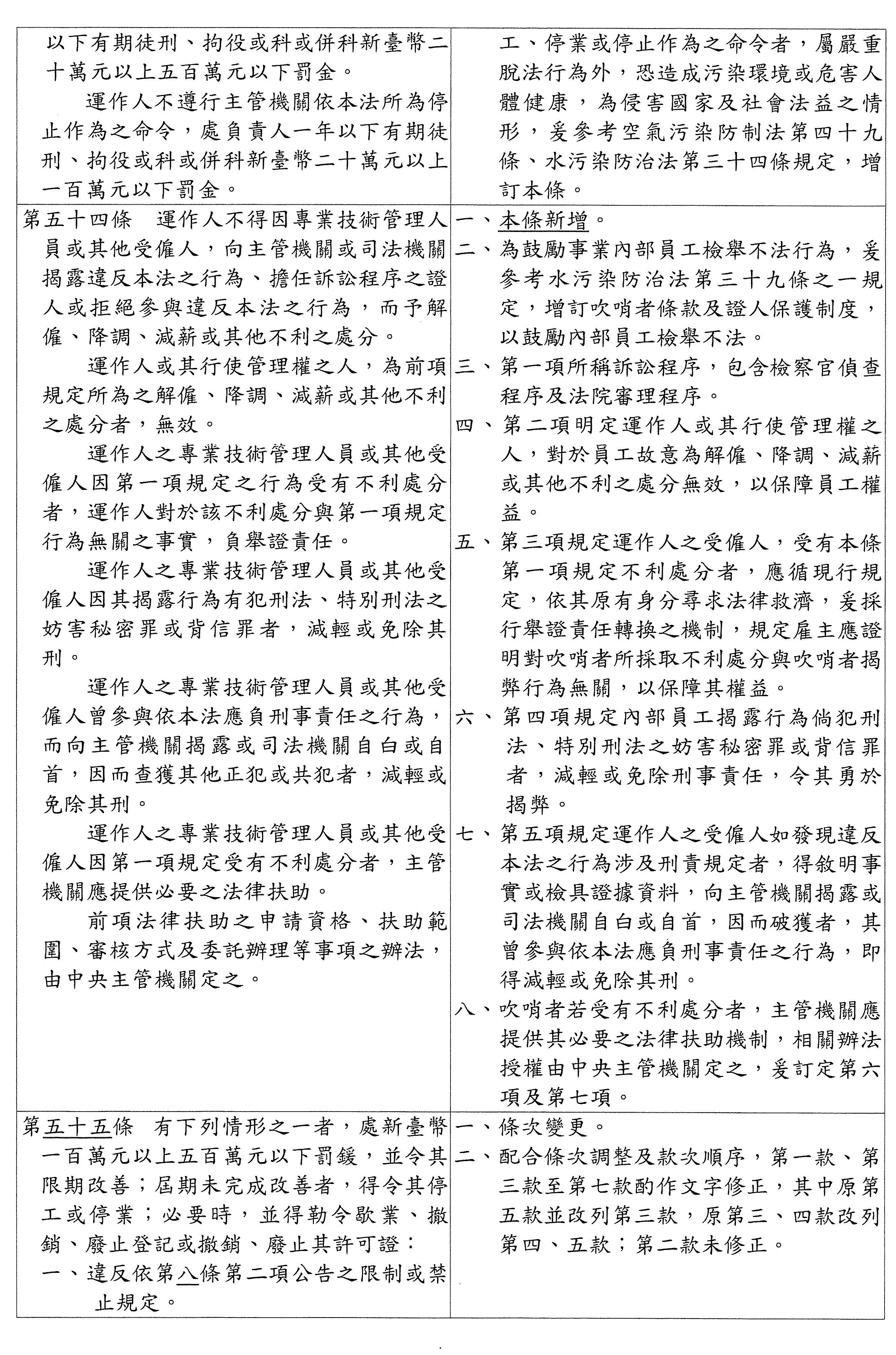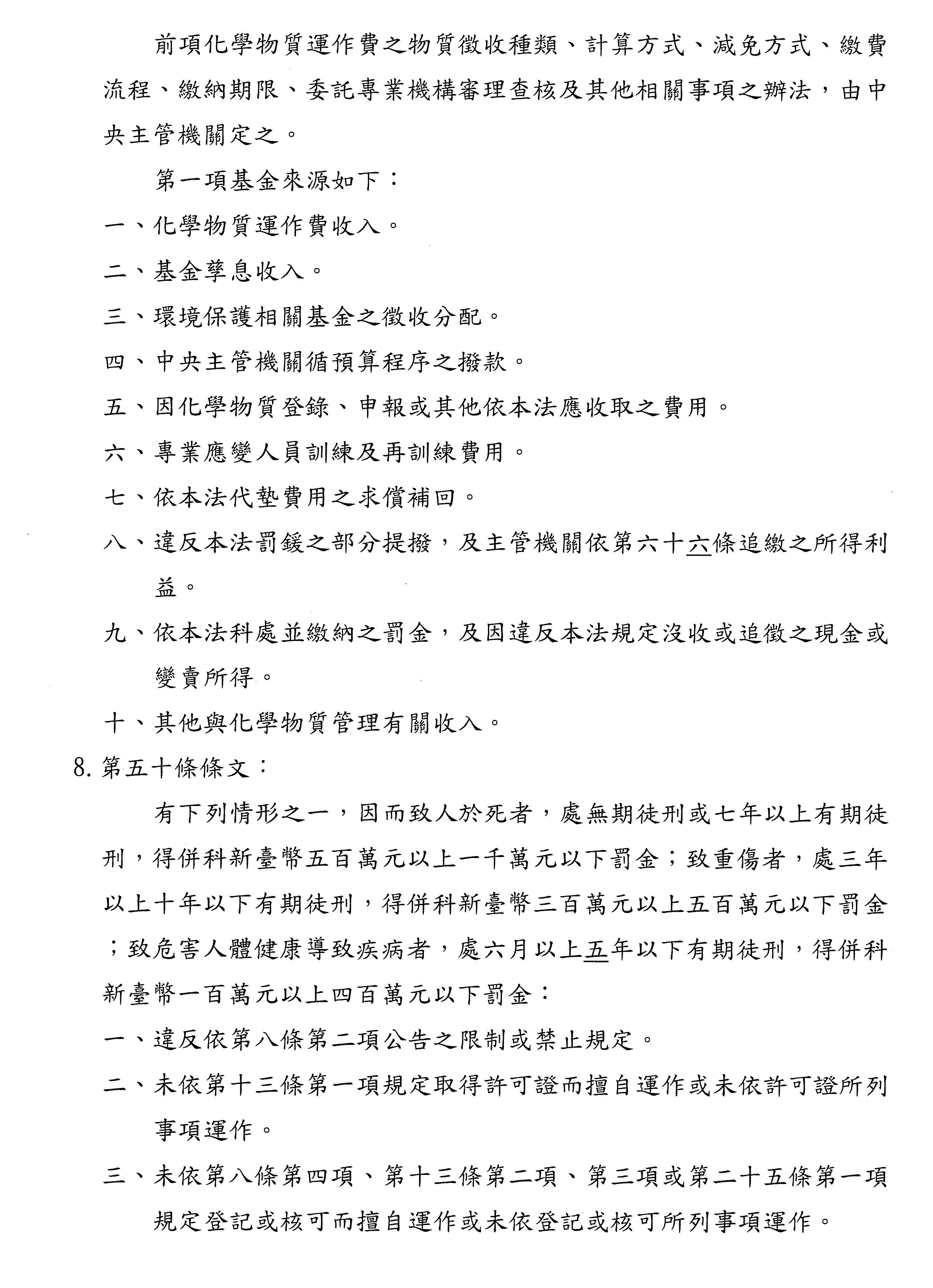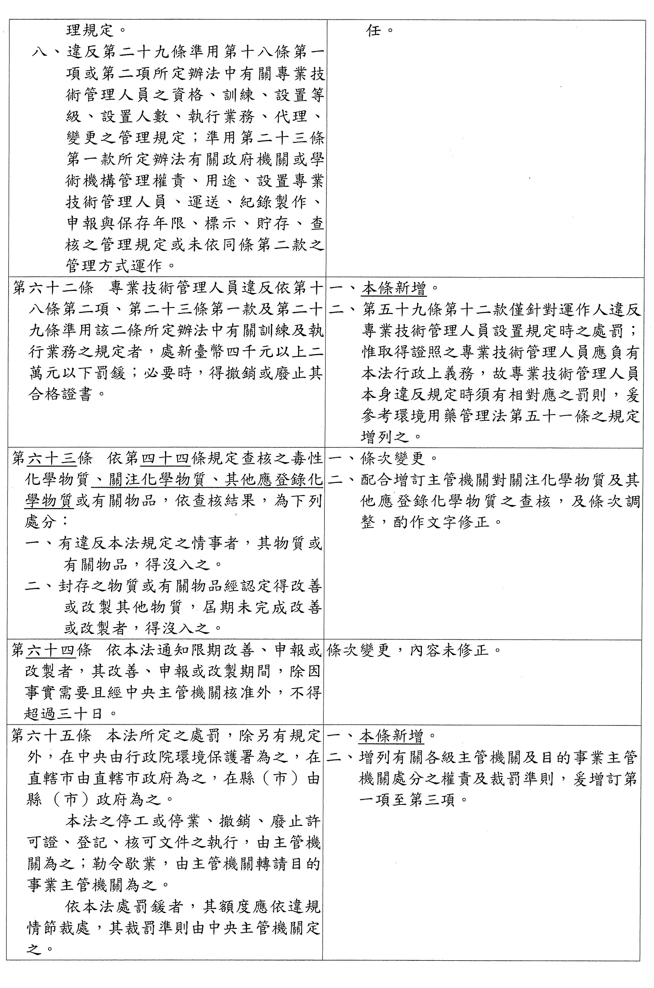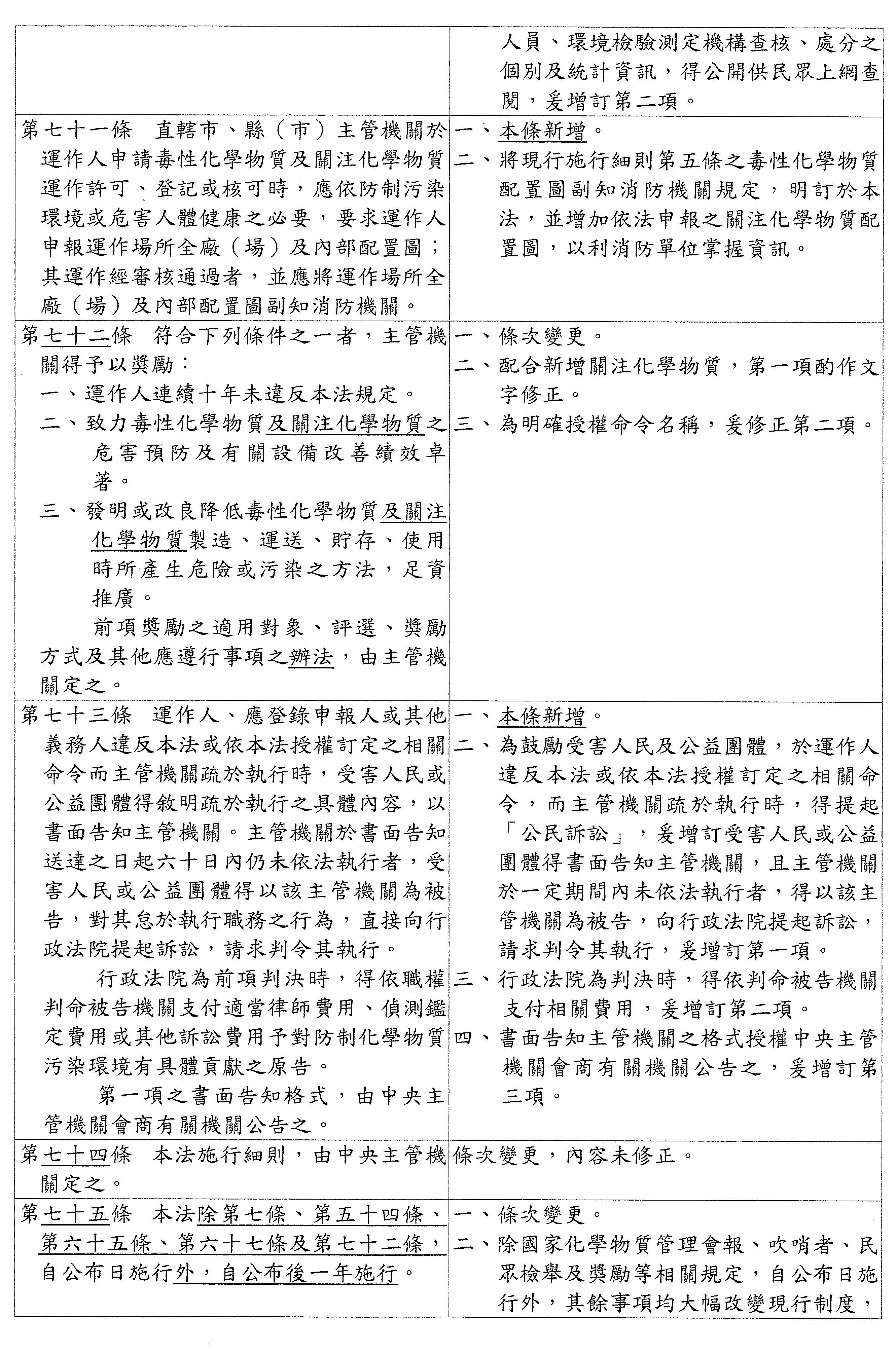 其次,為了強化化災環境事故的應變,本席還特別要求在修法過程中增列事故預防及緊急應變的專章,整合毒性化學物質及具危害性關注化學物質業者應辦理相關的預防及應變措施,以強化政府部門及業者對於化災的重視及處理能力。