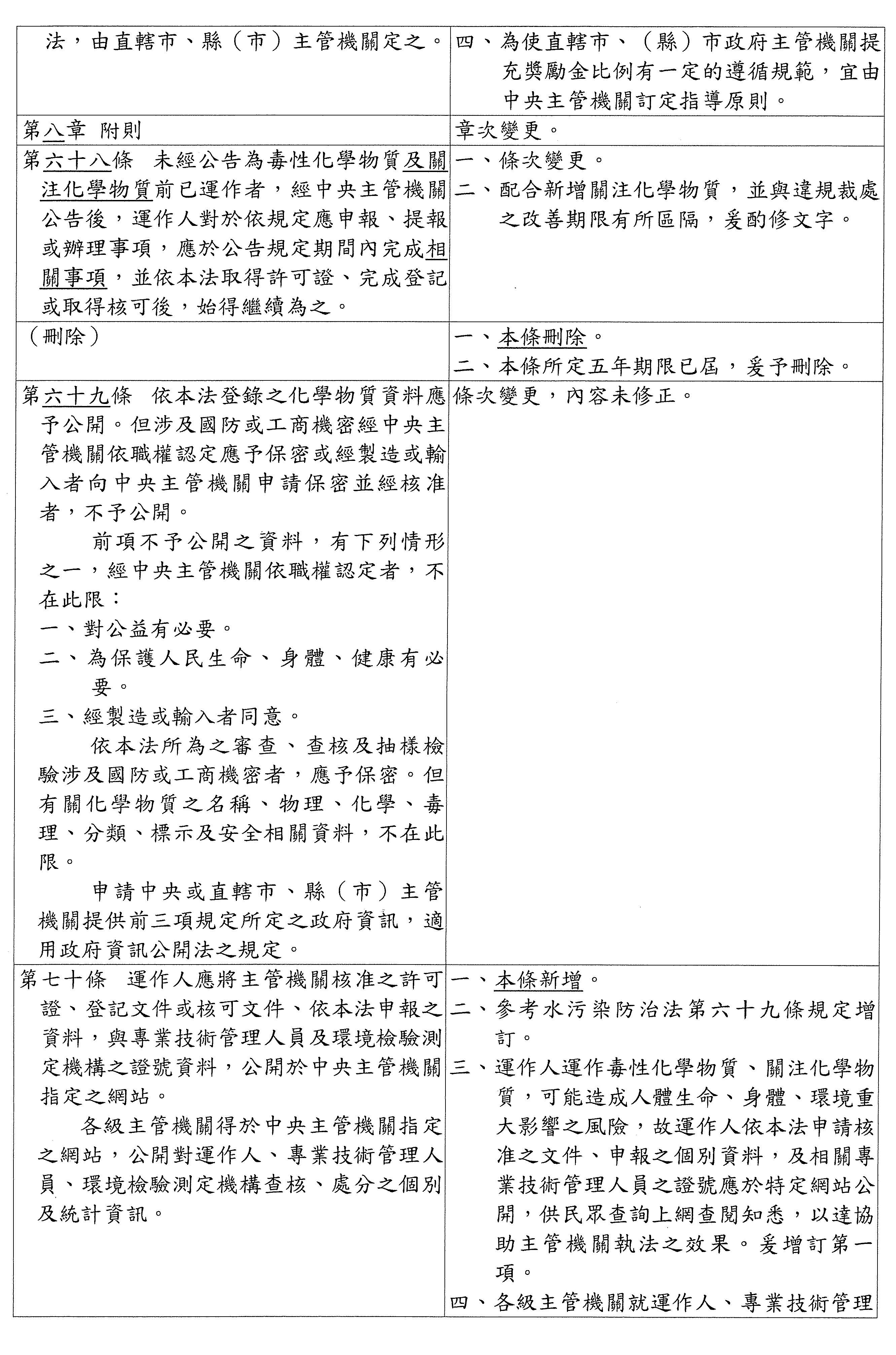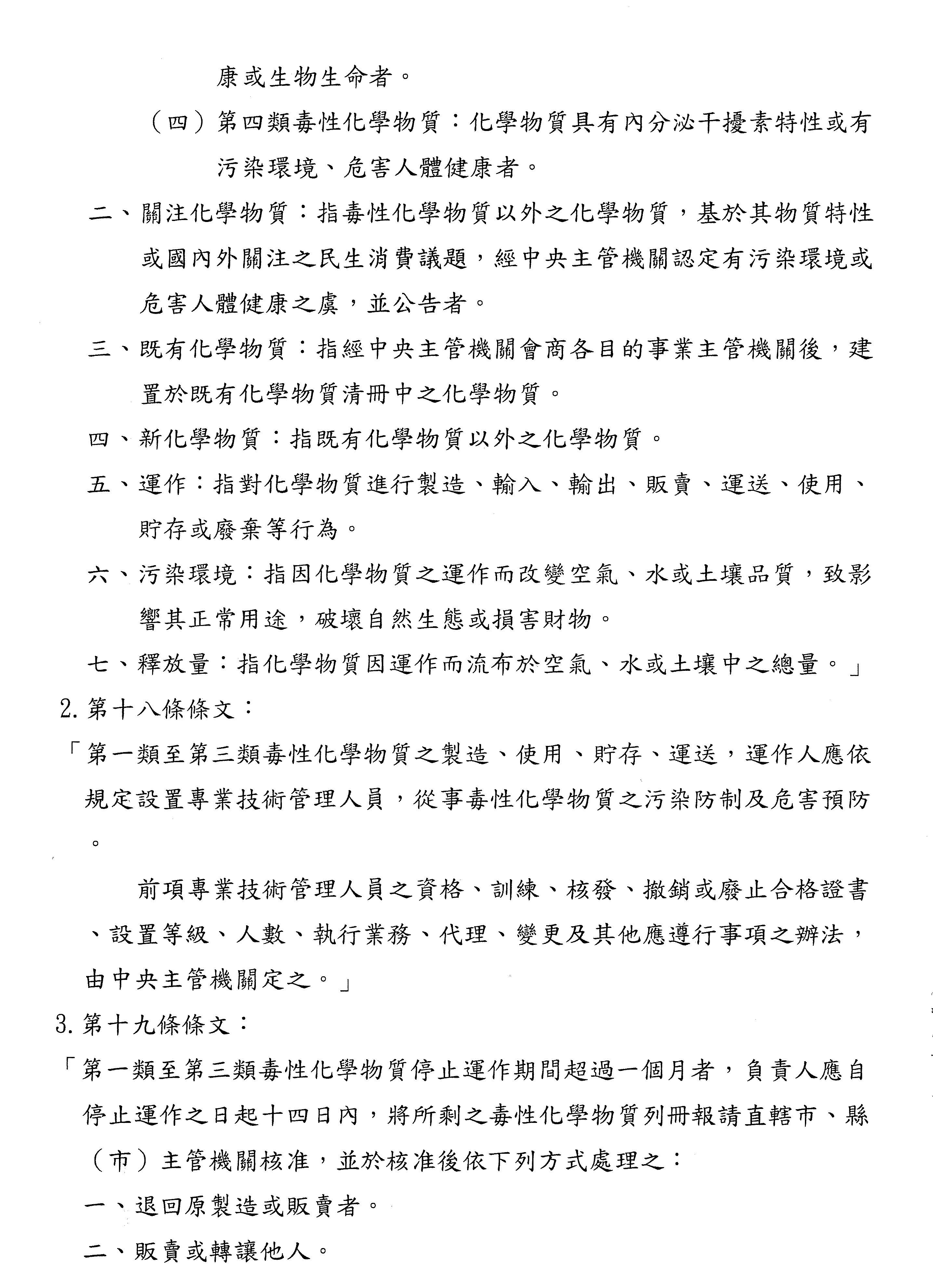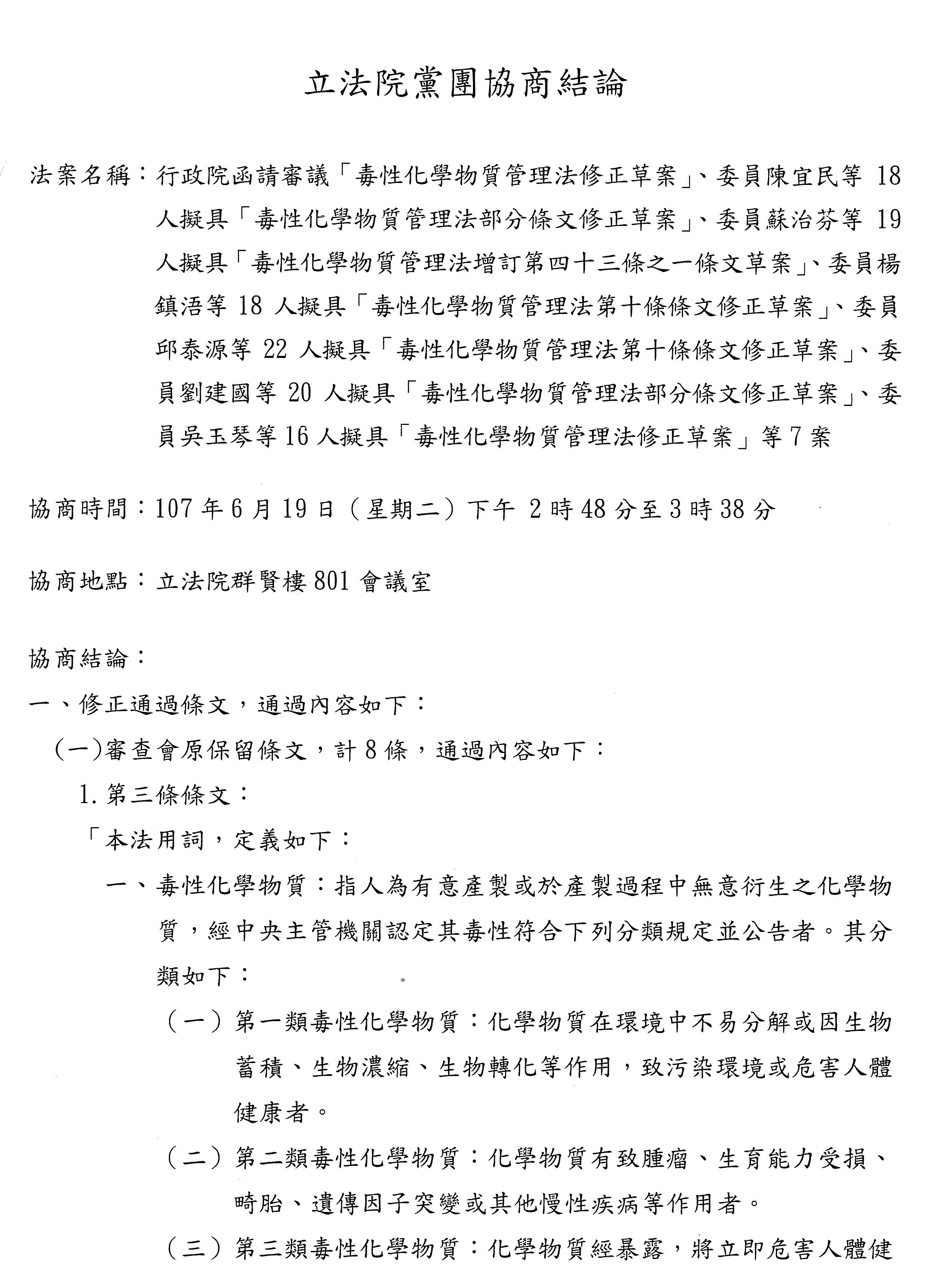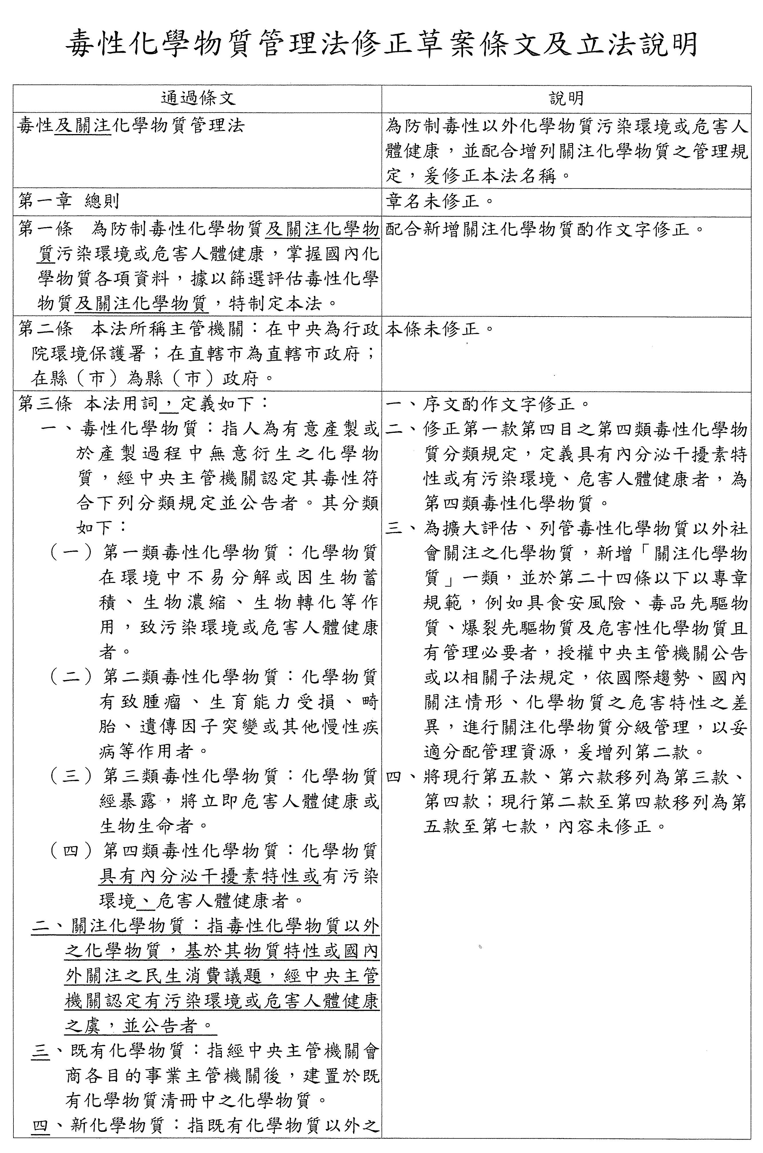 本案決議:「毒性化學物質管理法」名稱修正為「毒性及關注化學物質管理法」,並將條文修正通過。