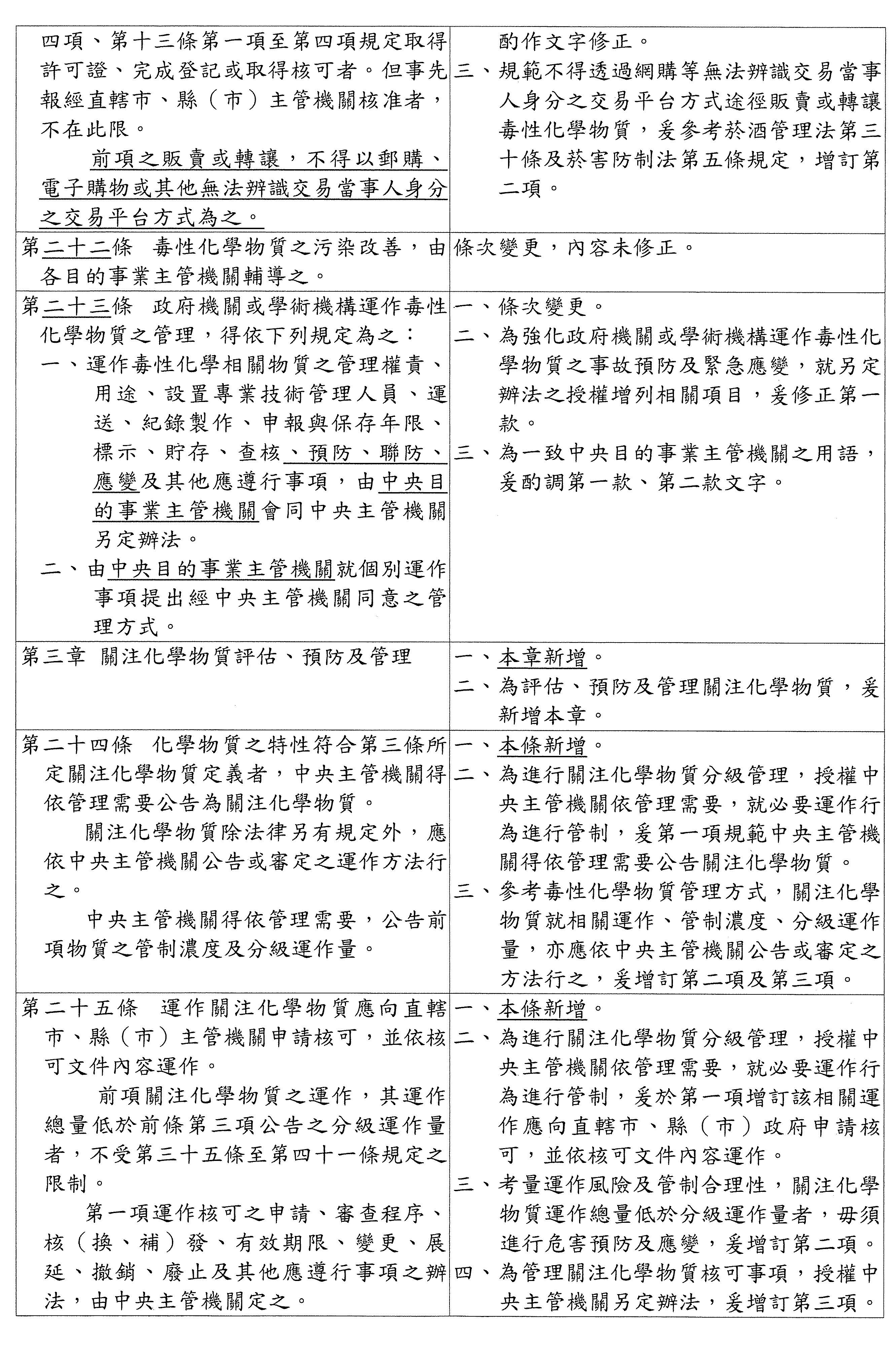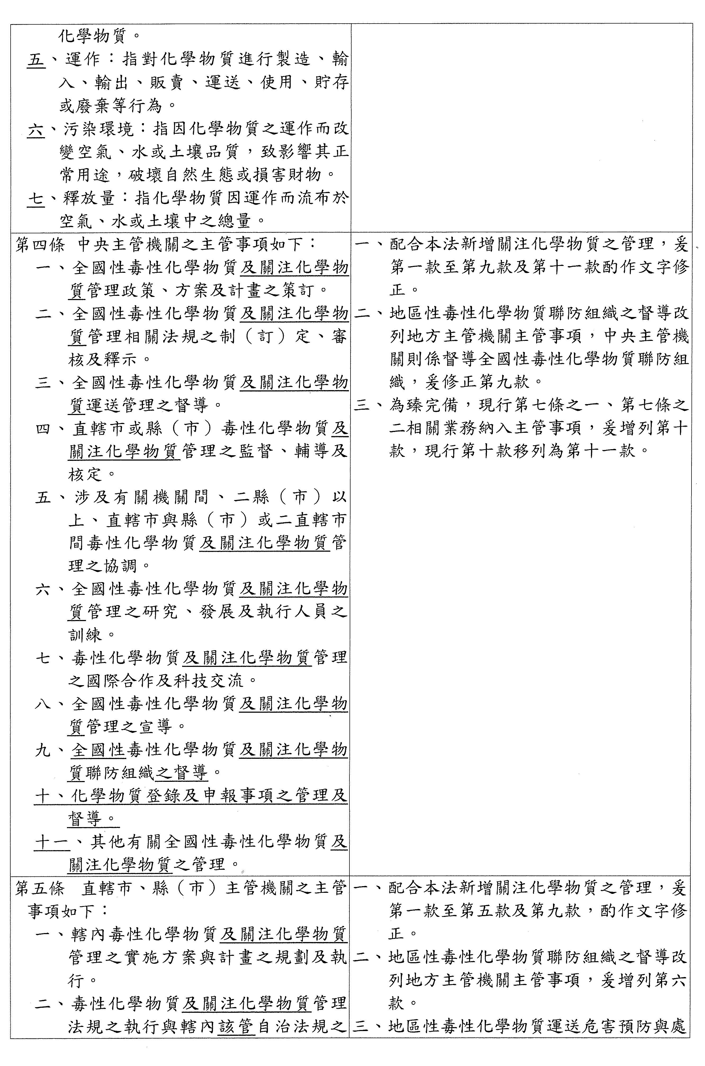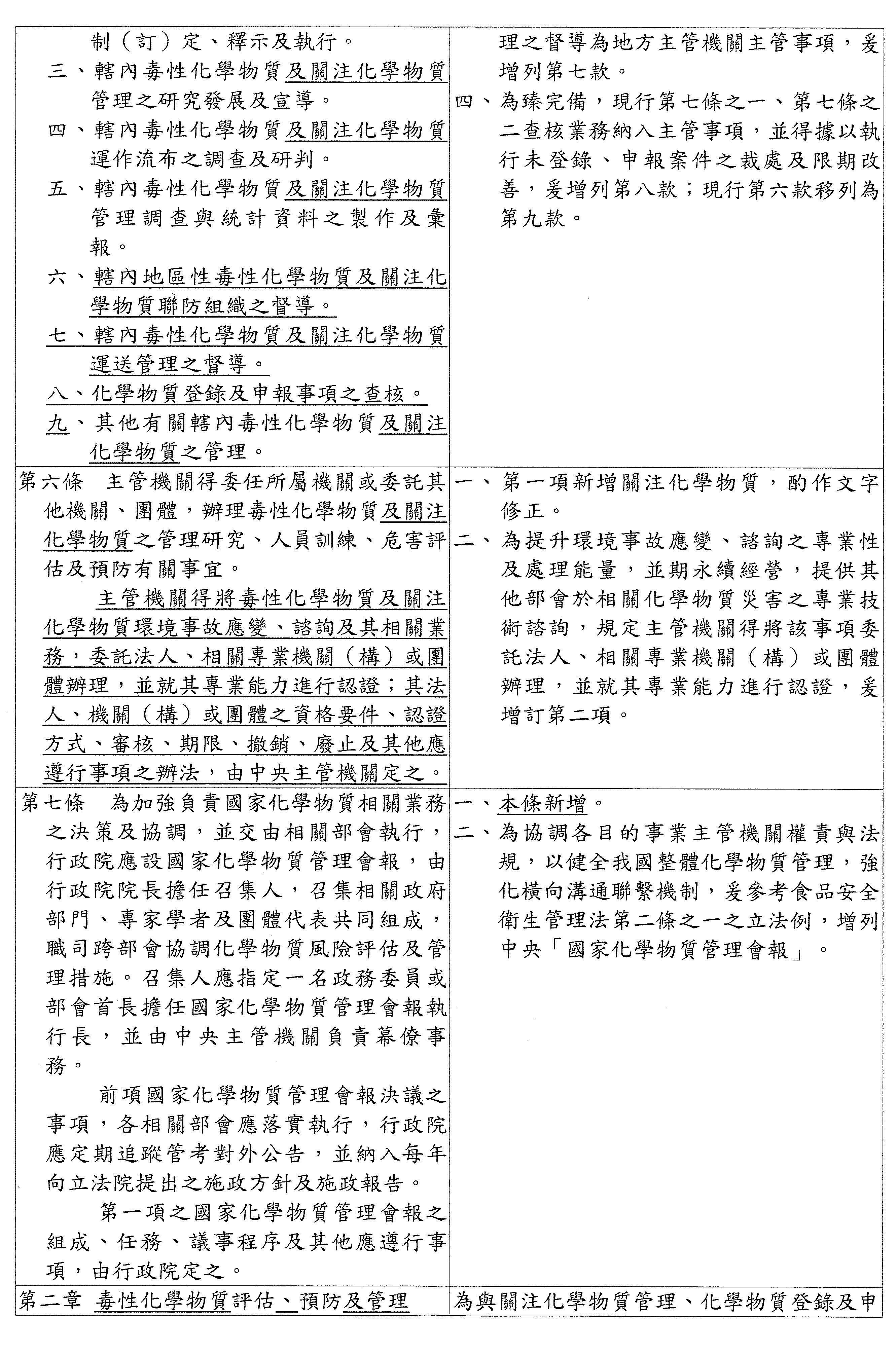 爰為補強現有各相關部會於化學物質管理強度的差異與流向斷點,中央環境保護主管機關應於本法完成修正施行後一年,提出化學物質相關管理法案及本法之配合修訂案,送交行政院審查。