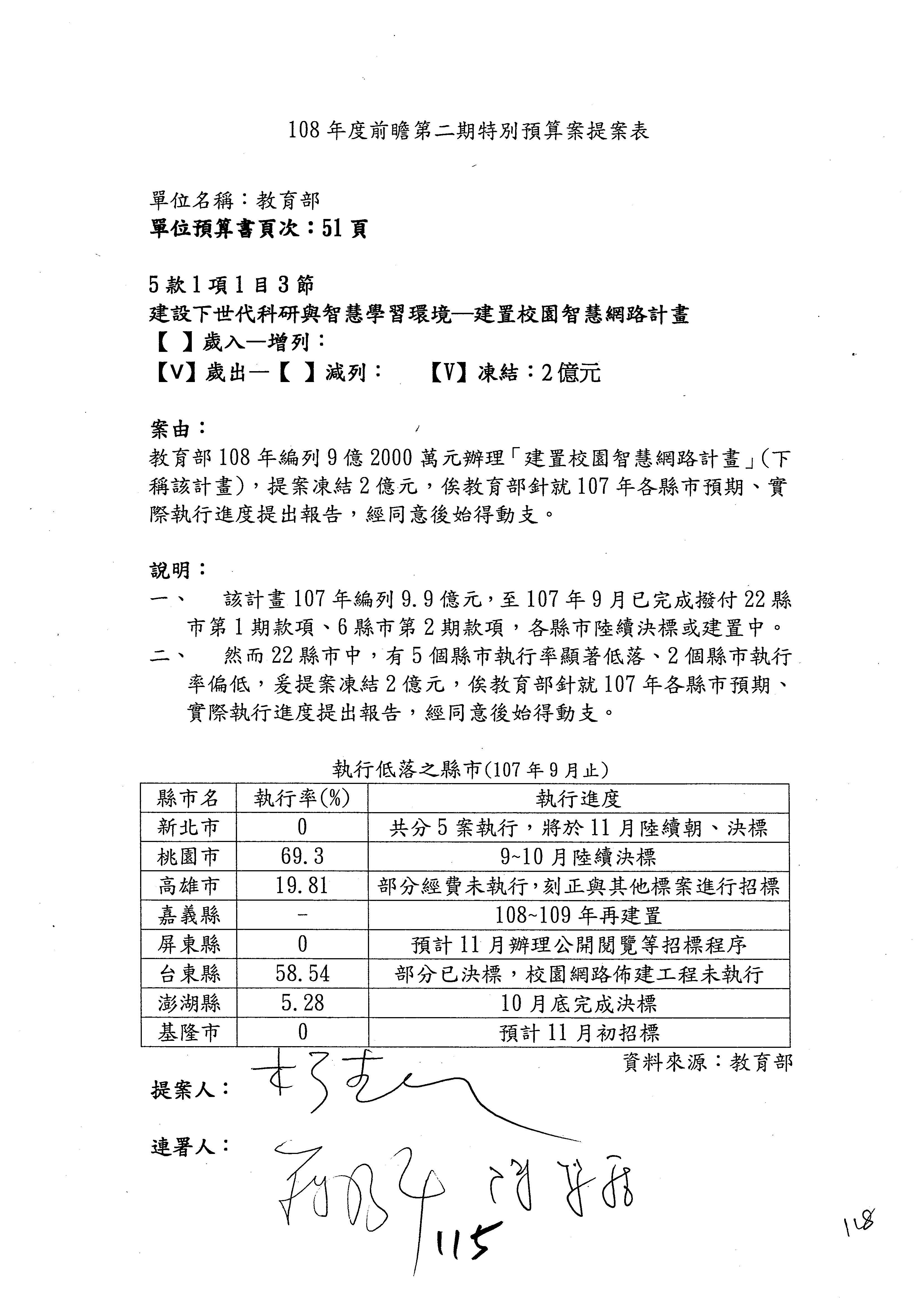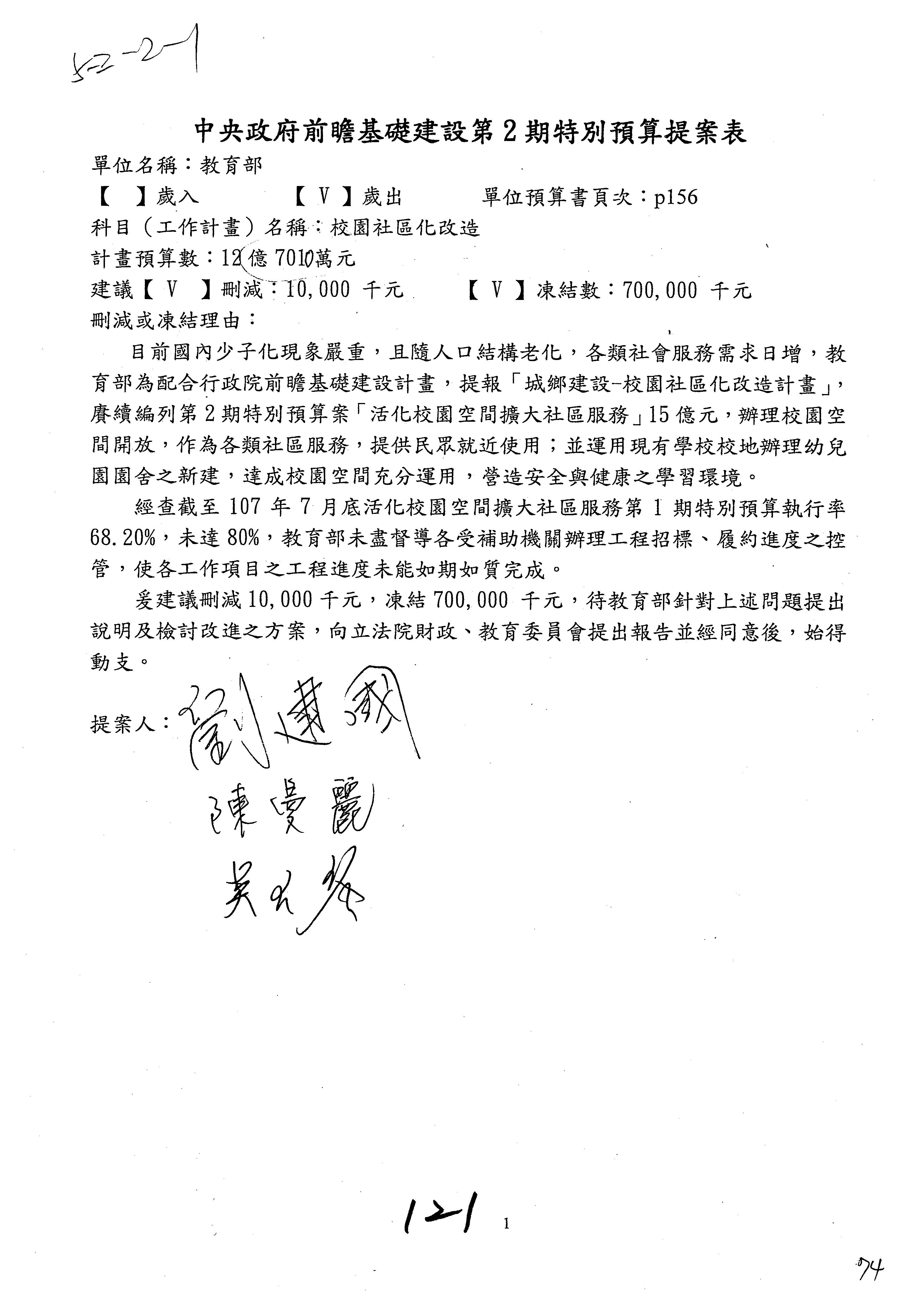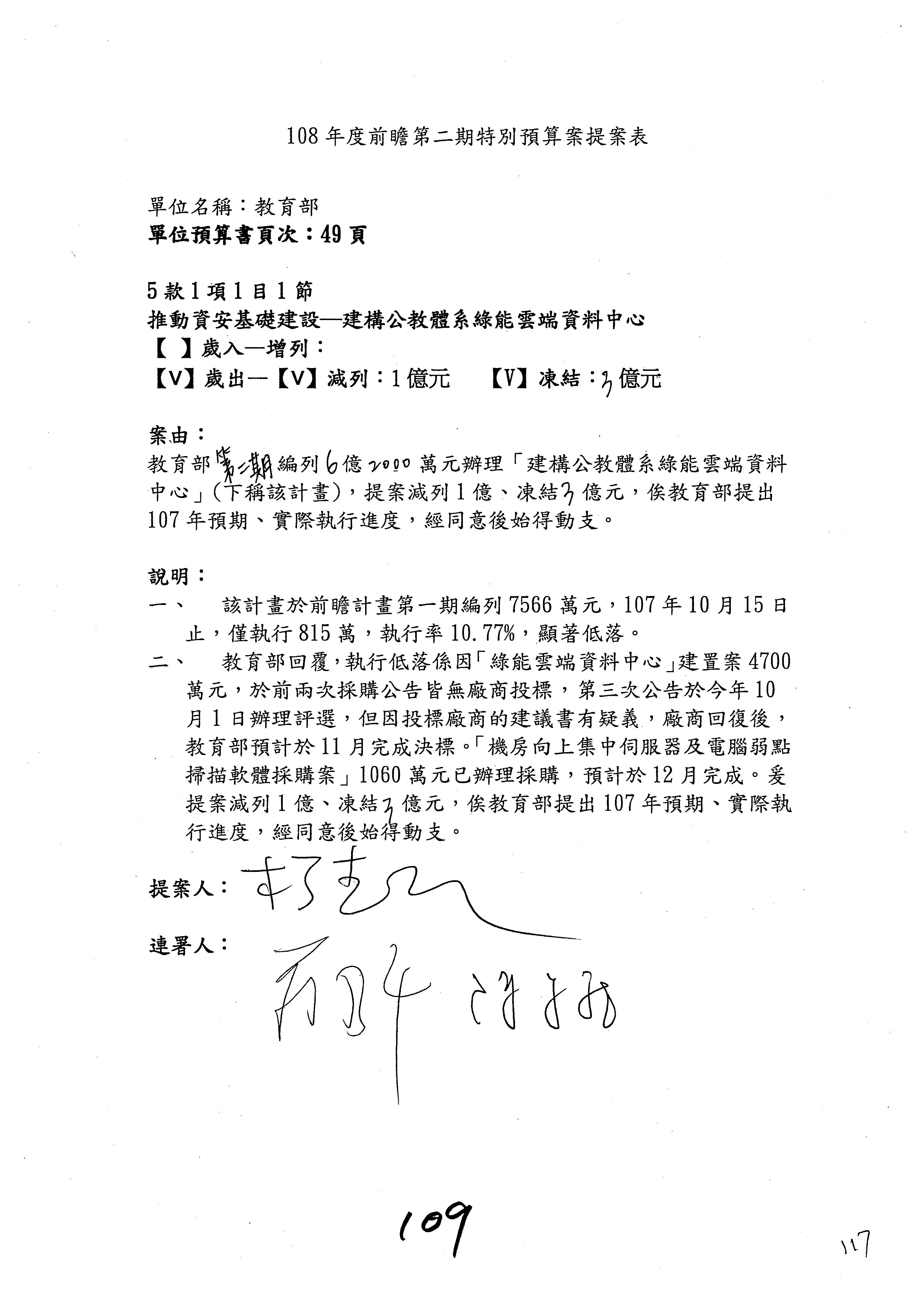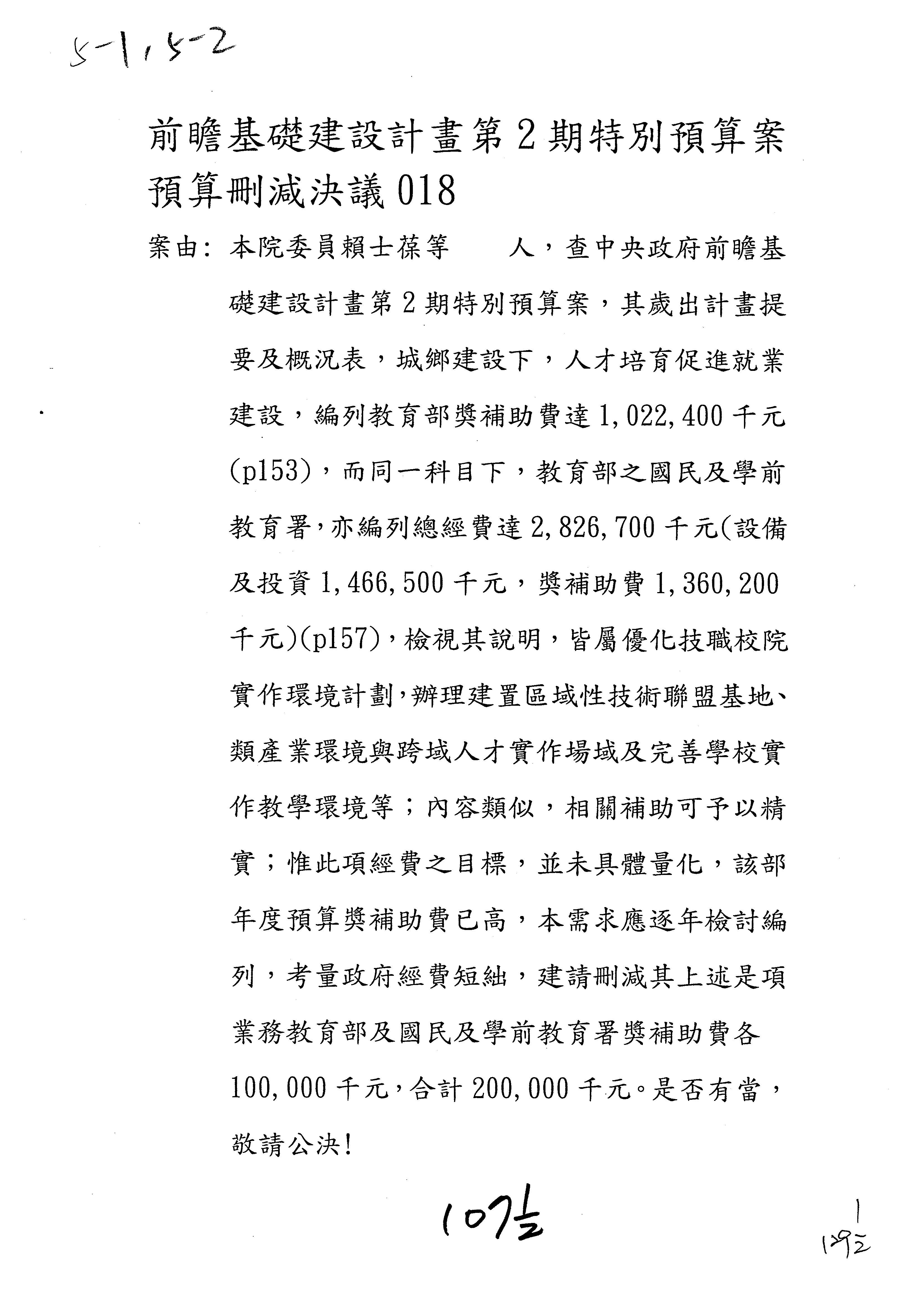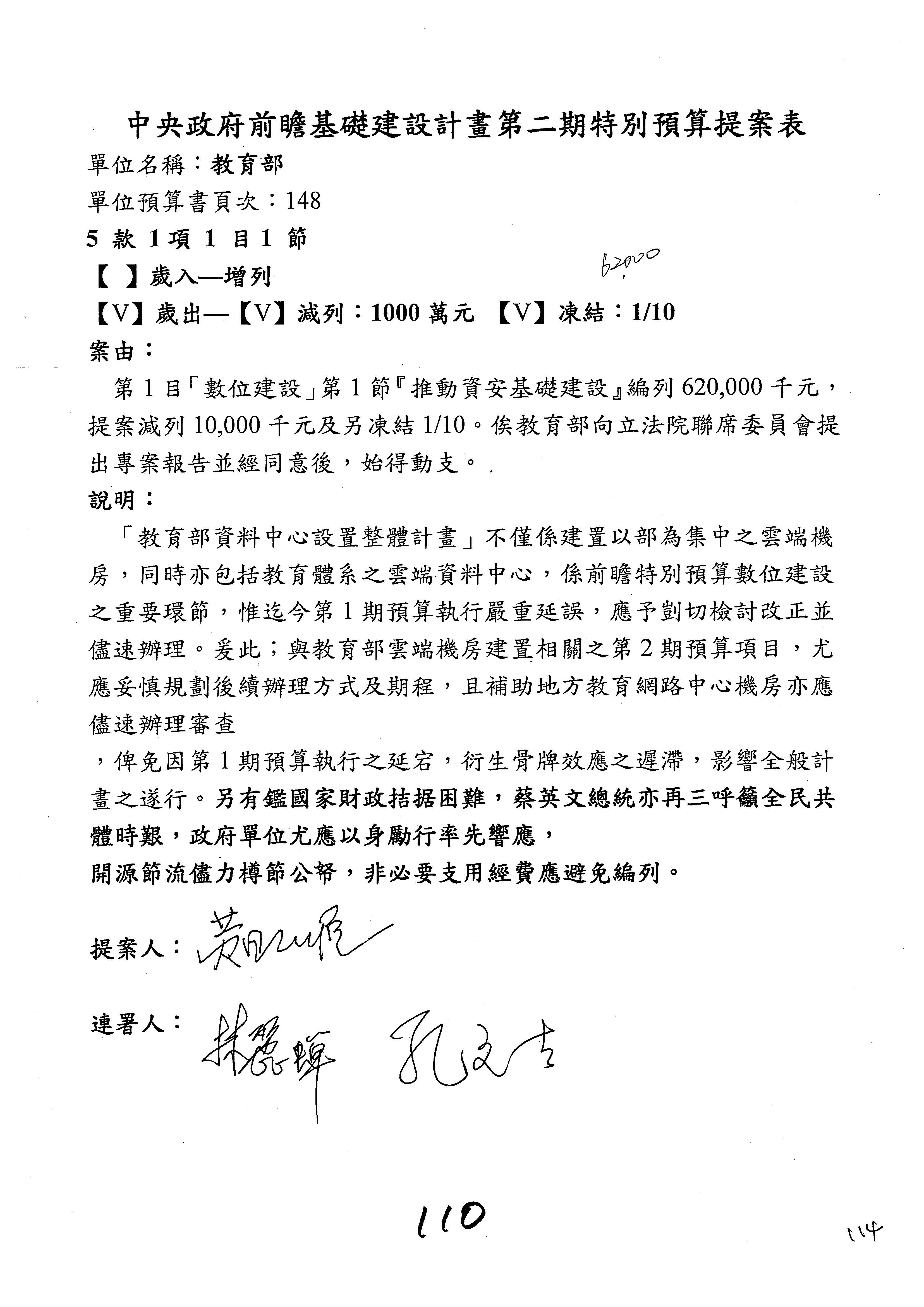 第107案刪減2,000萬元,教育部跟國教署各刪減1,000萬元。
