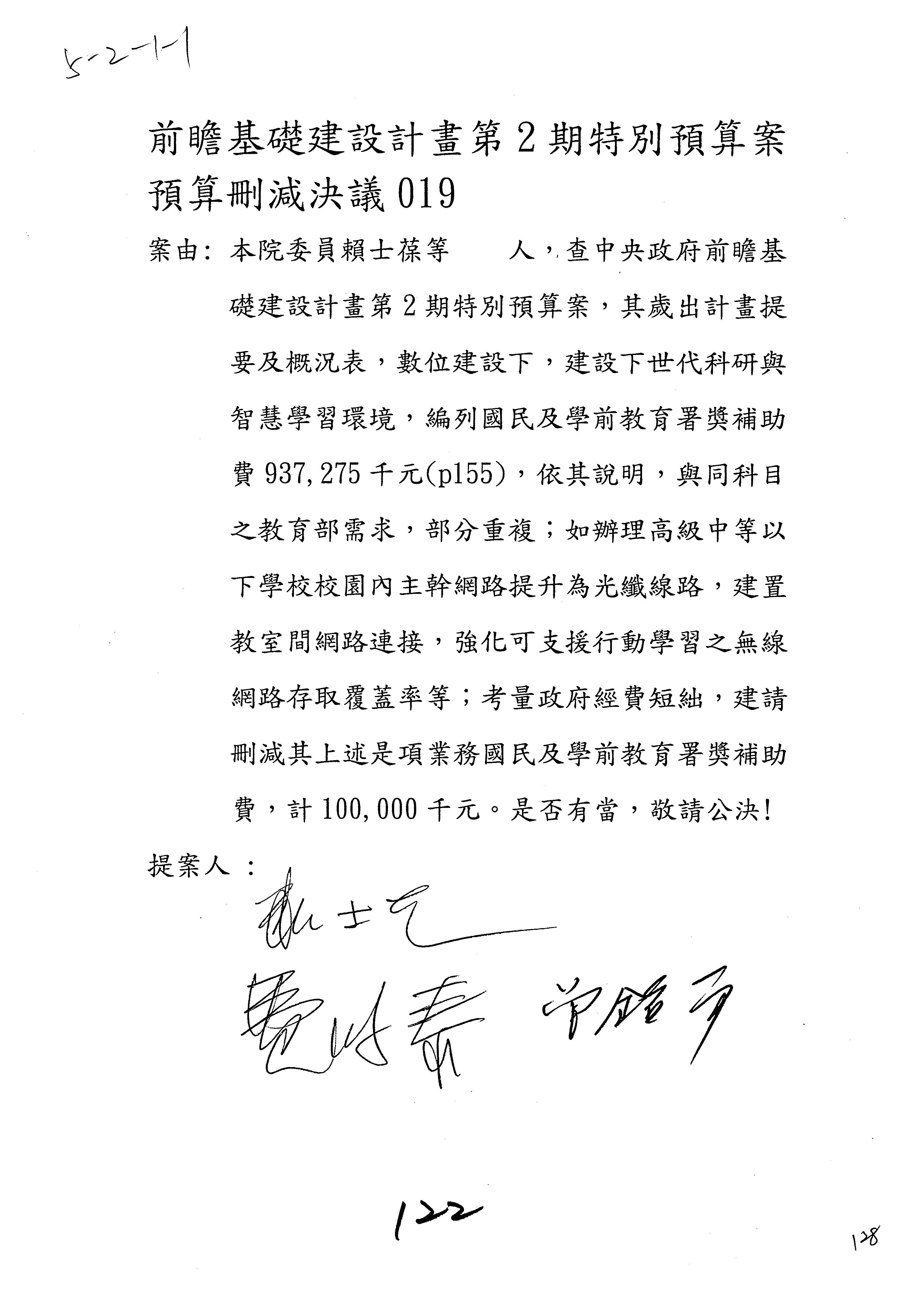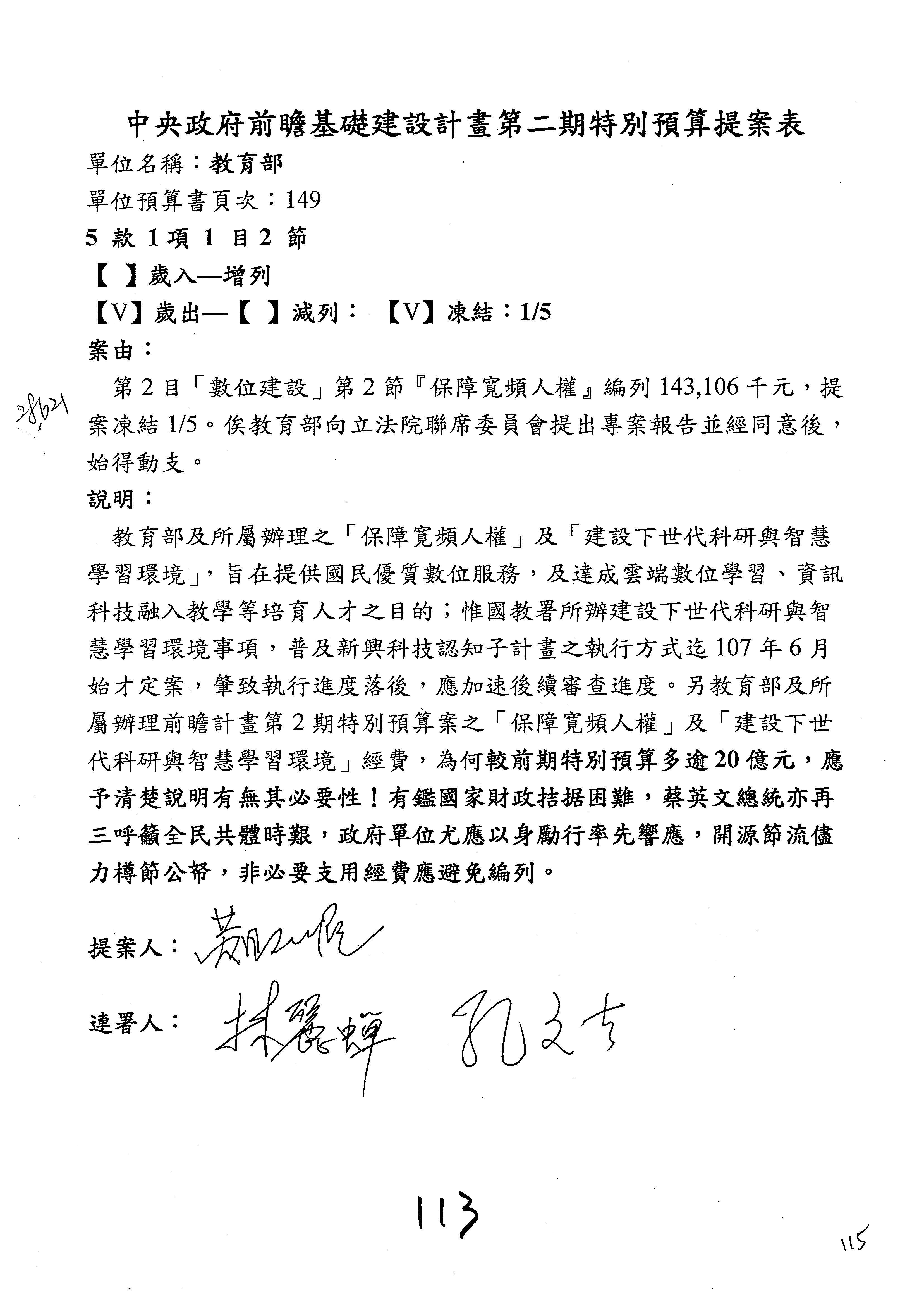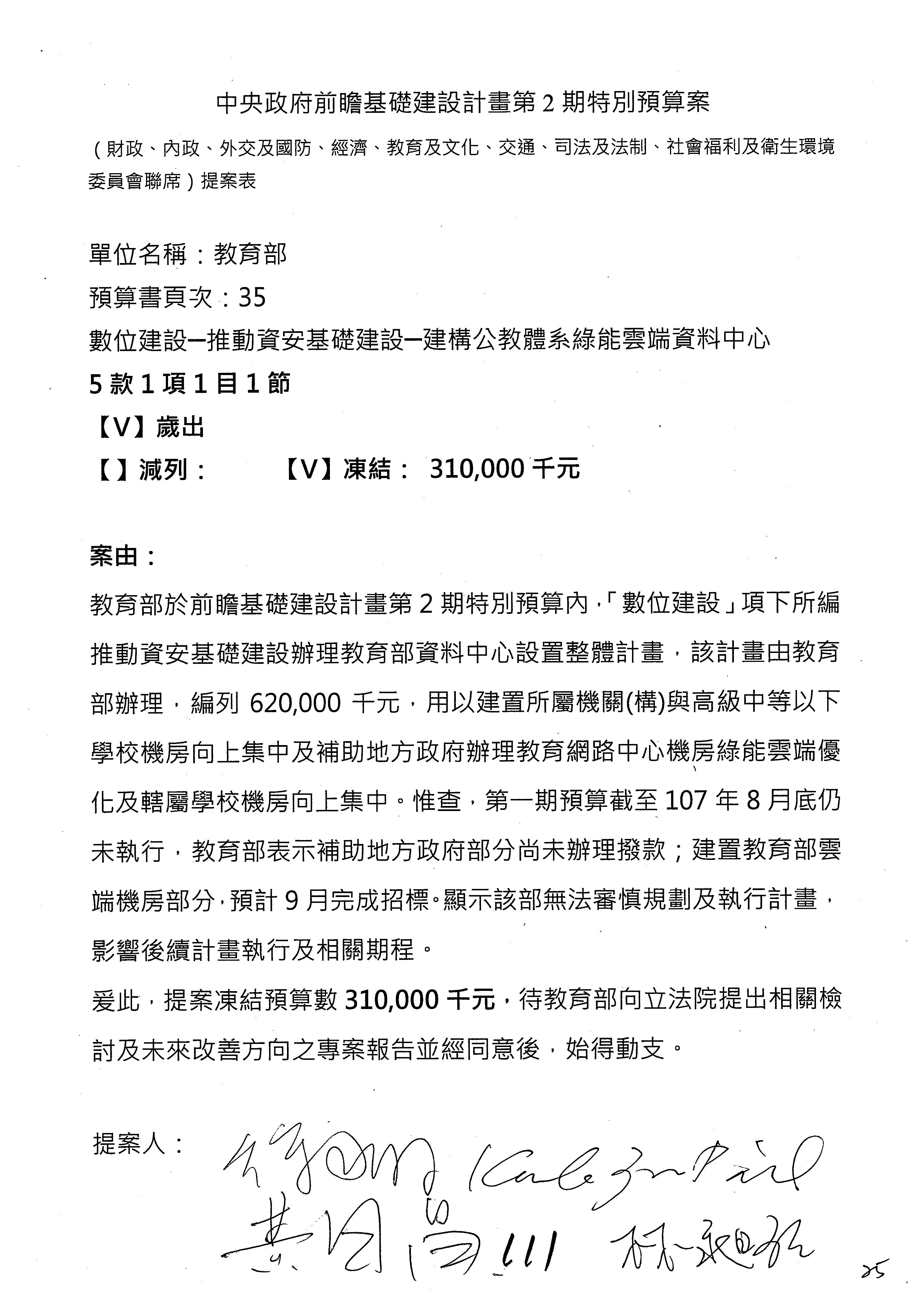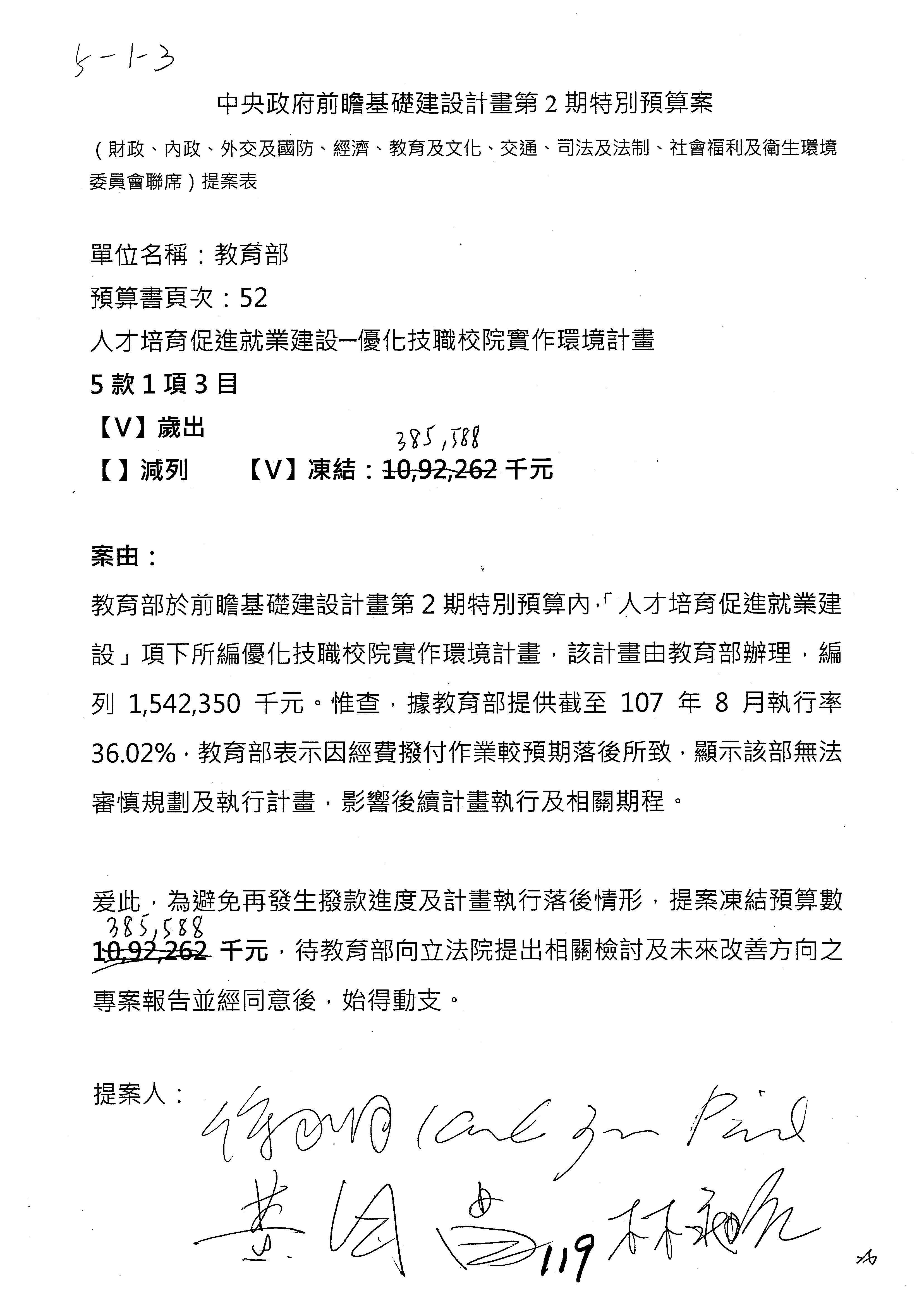 第107案刪減2,000萬元,教育部跟國教署各刪減1,000萬元。