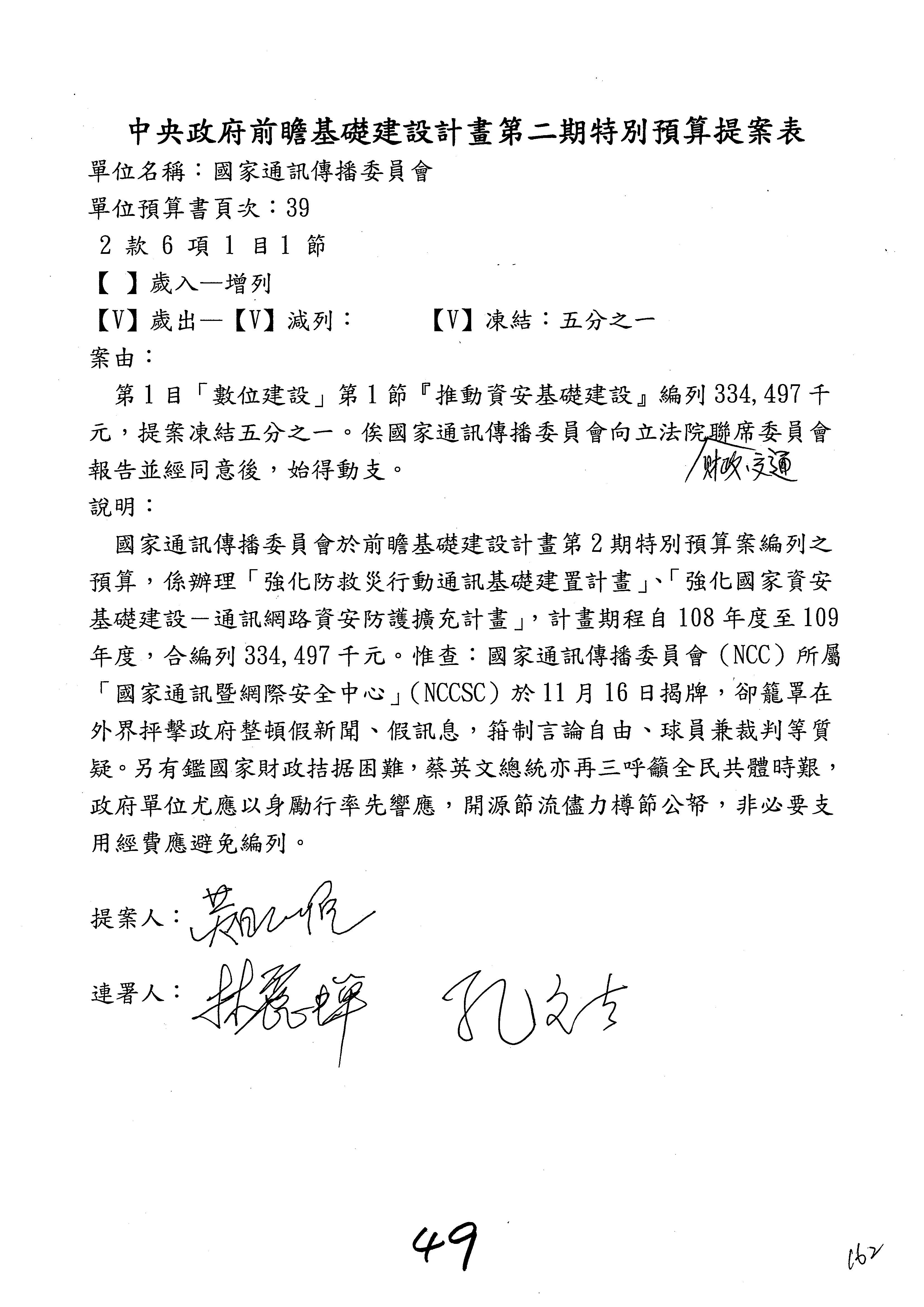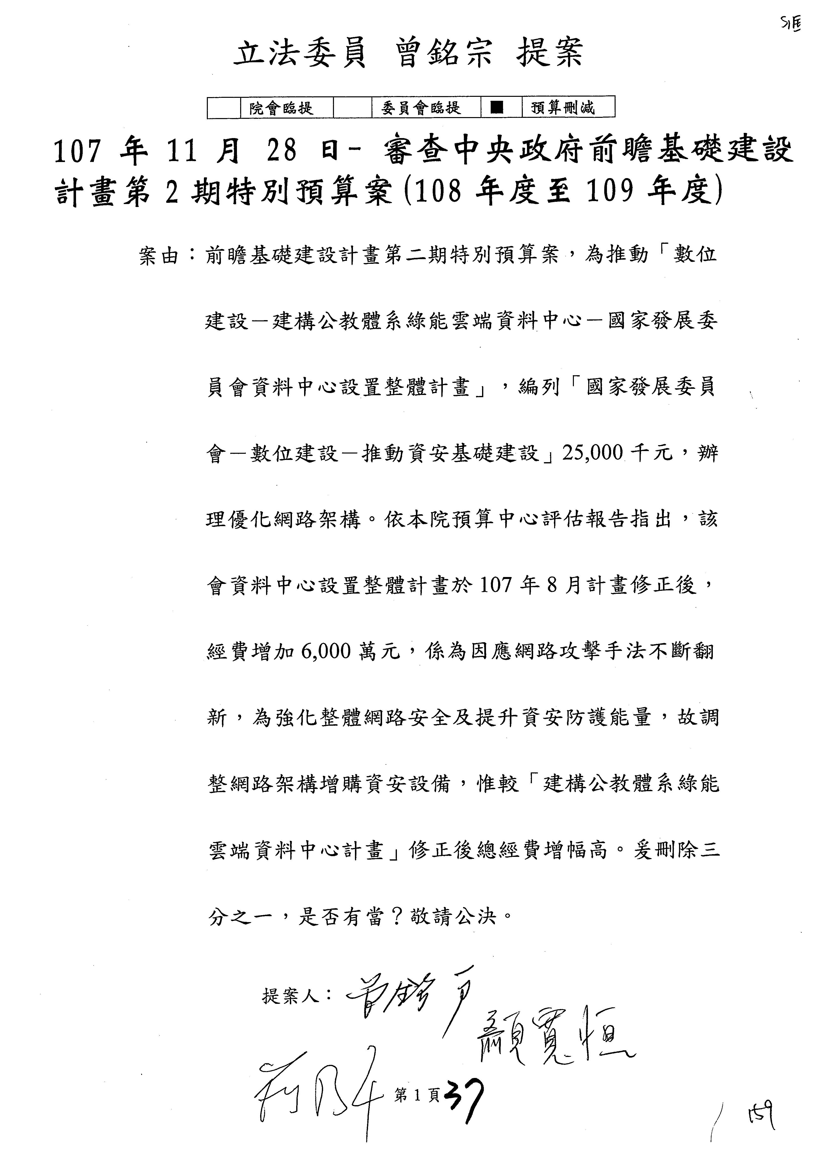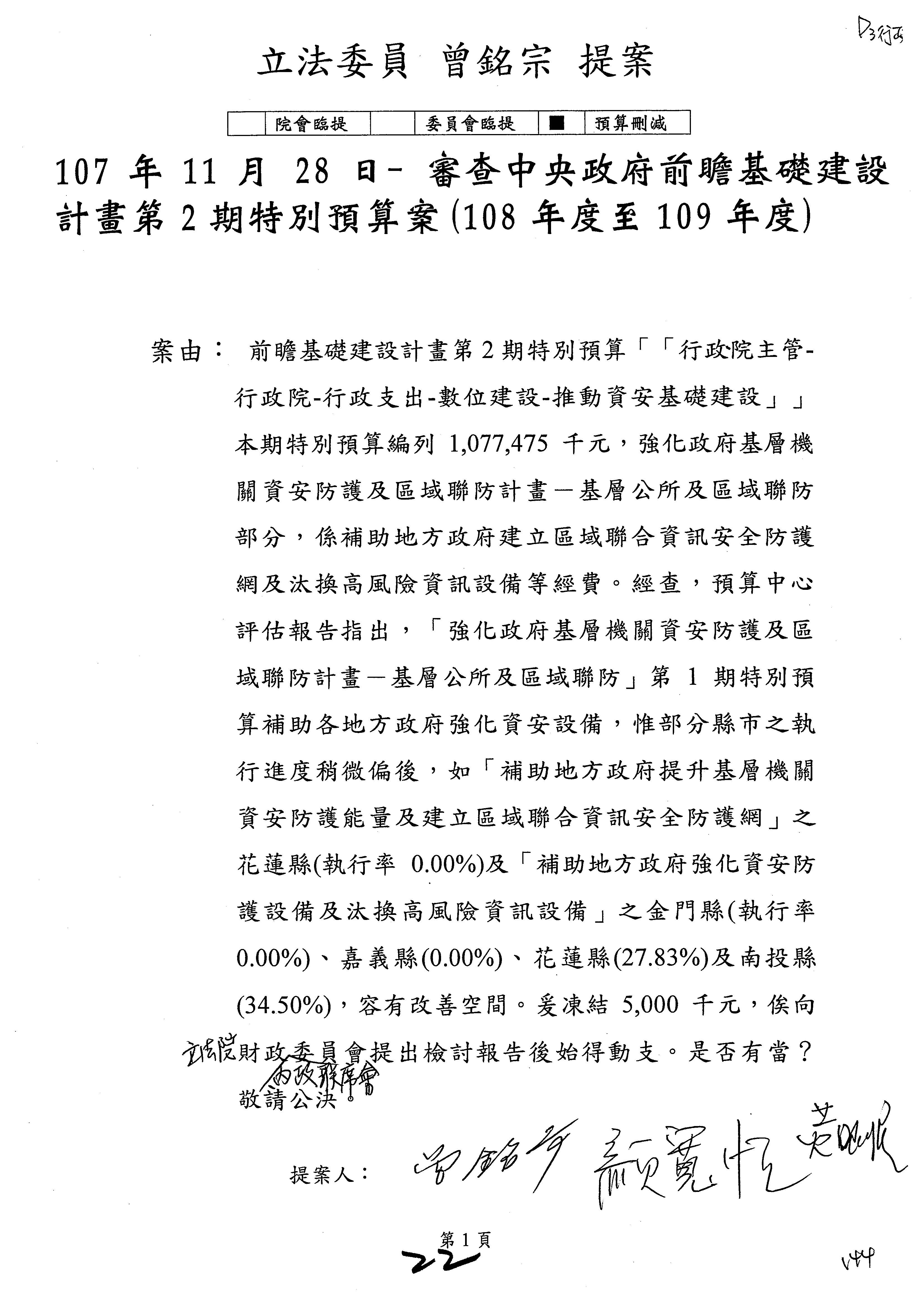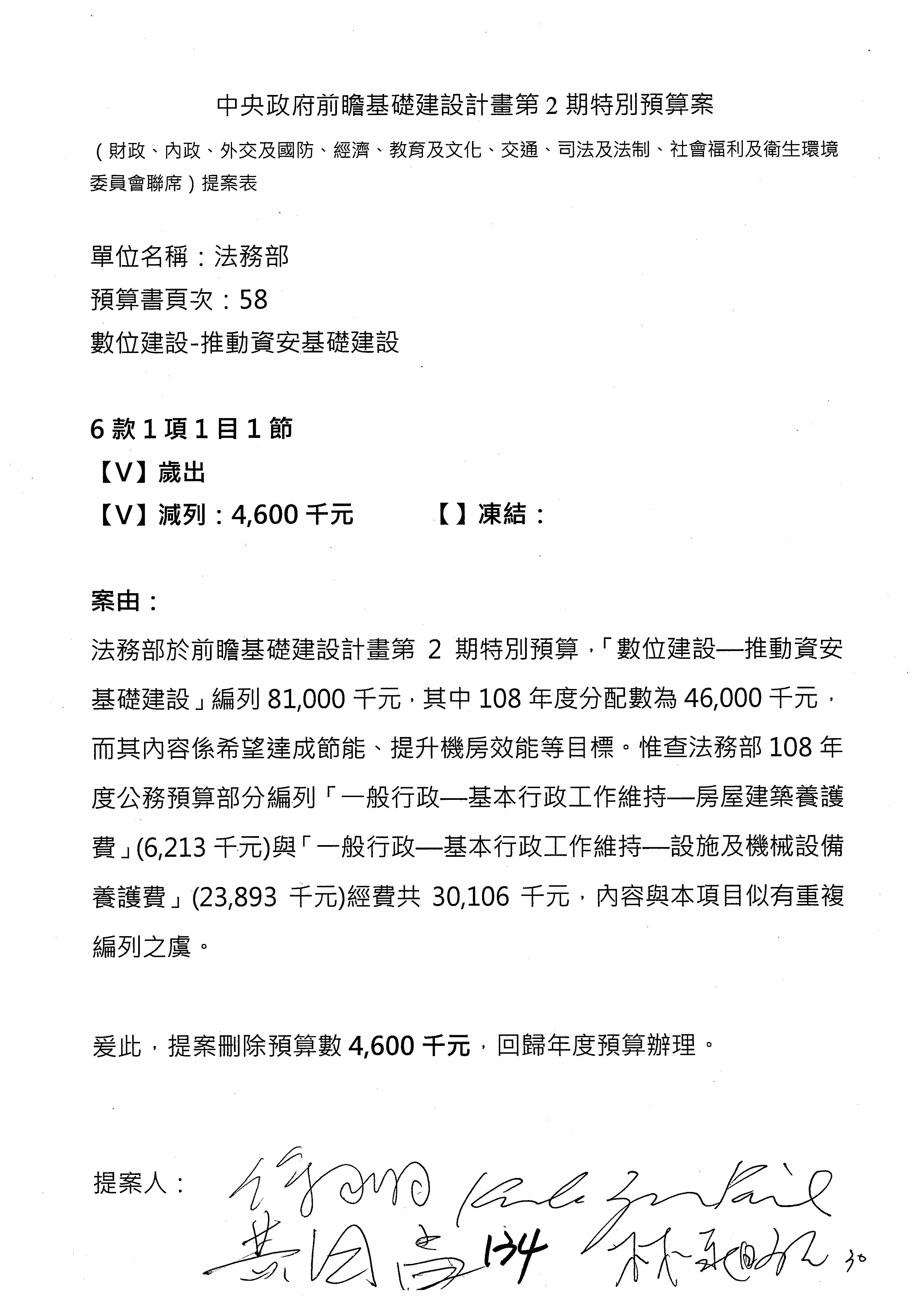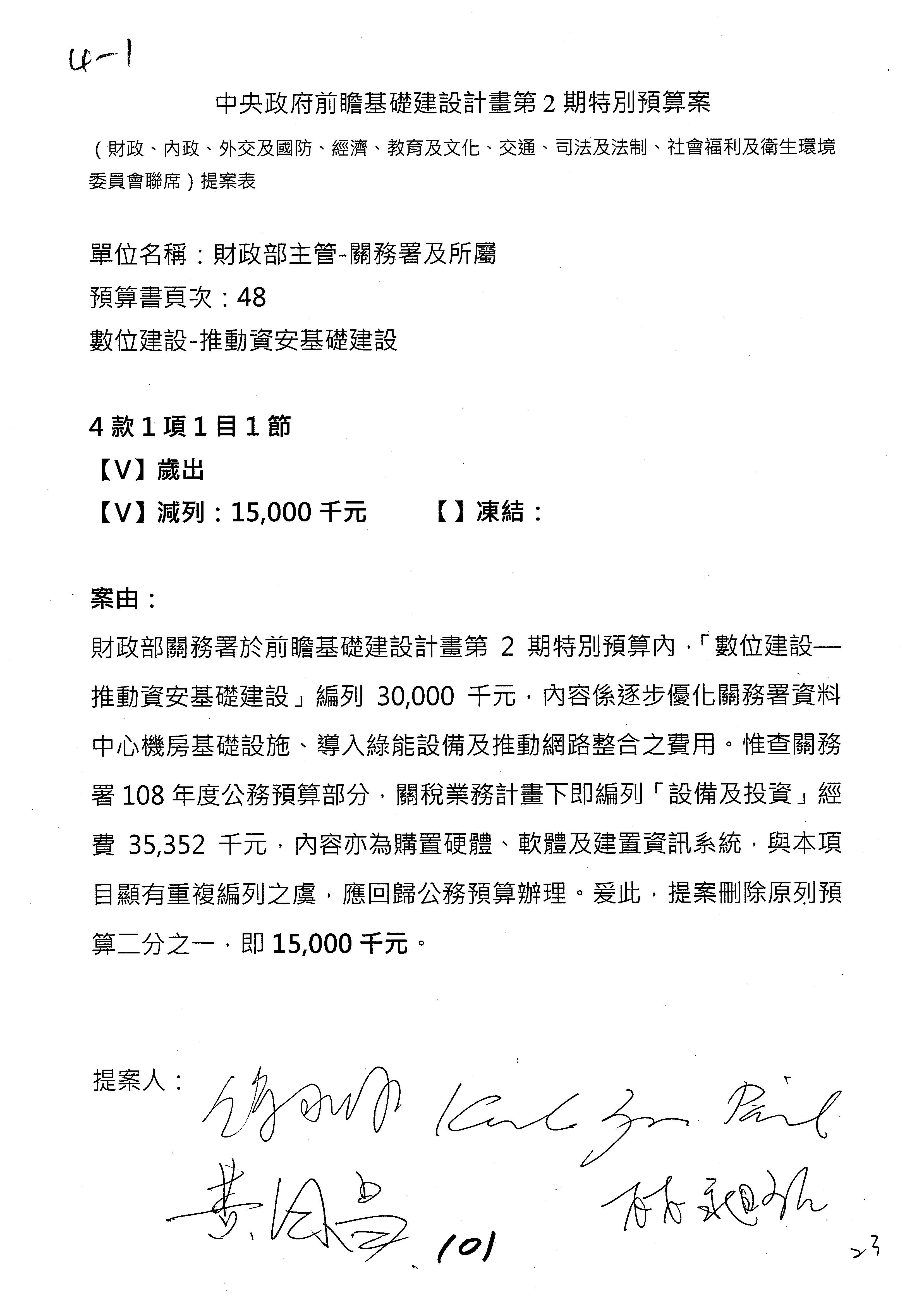 第108案至第111案合併處理,刪減500萬元,刪減資安基礎建設費用。