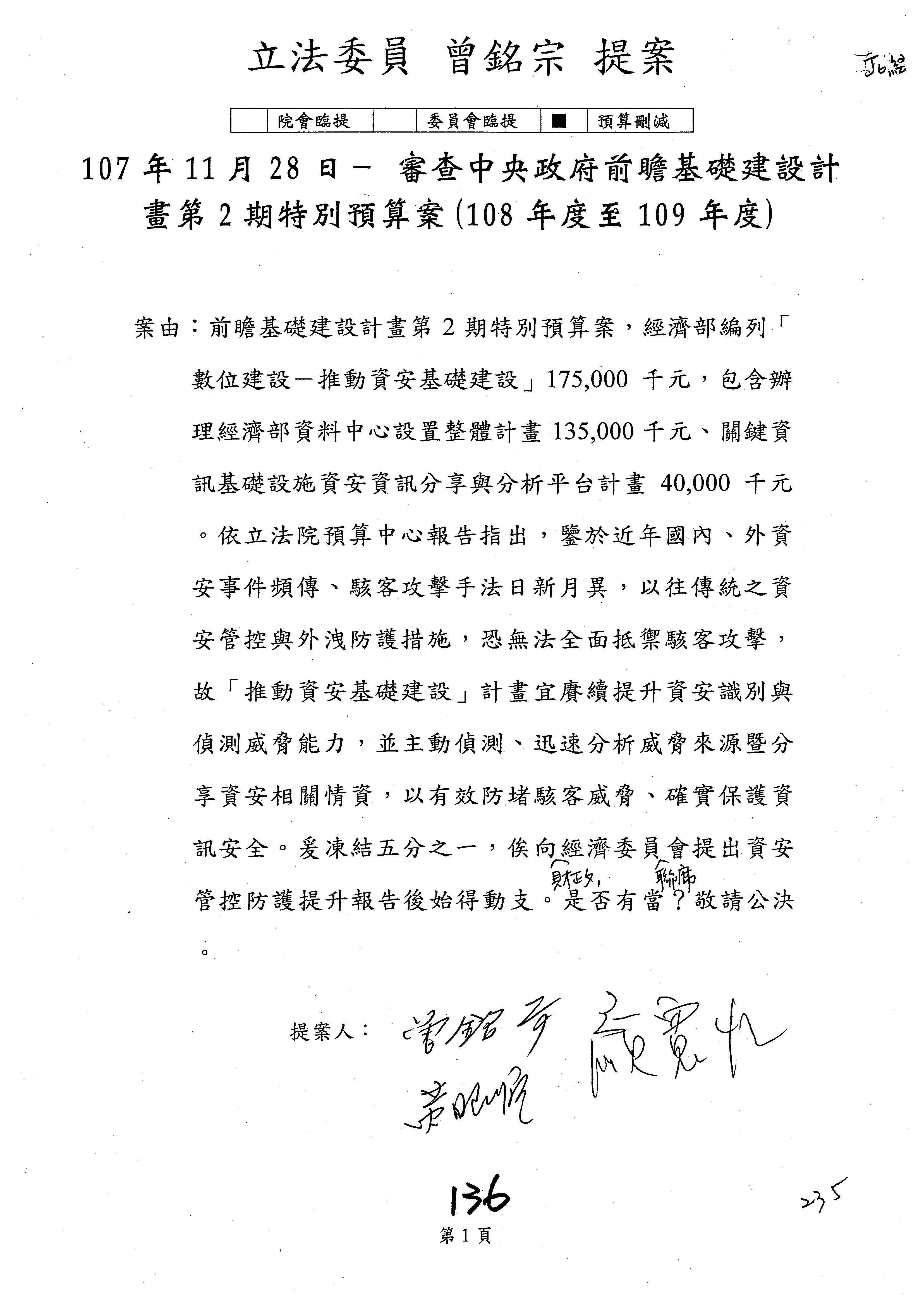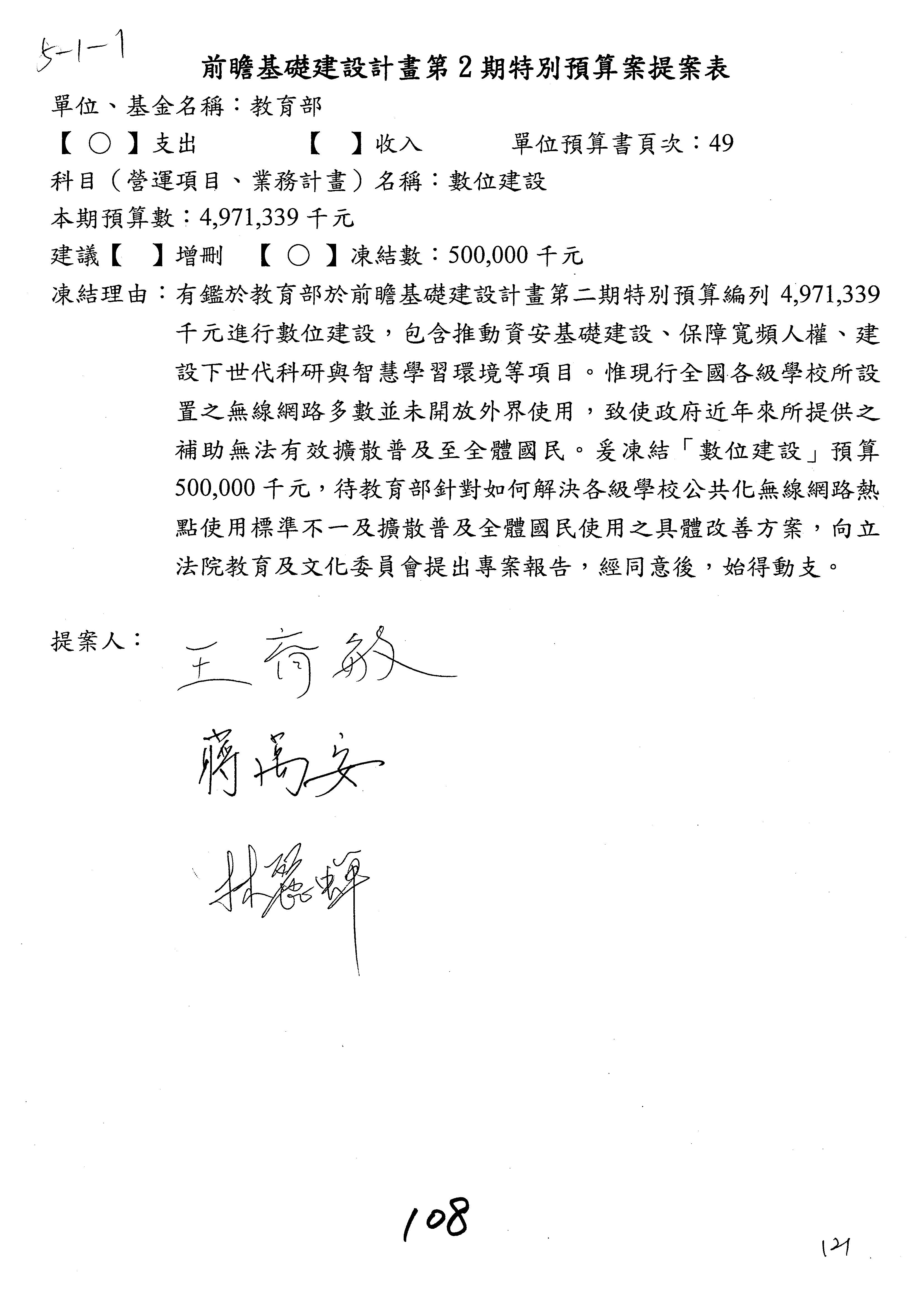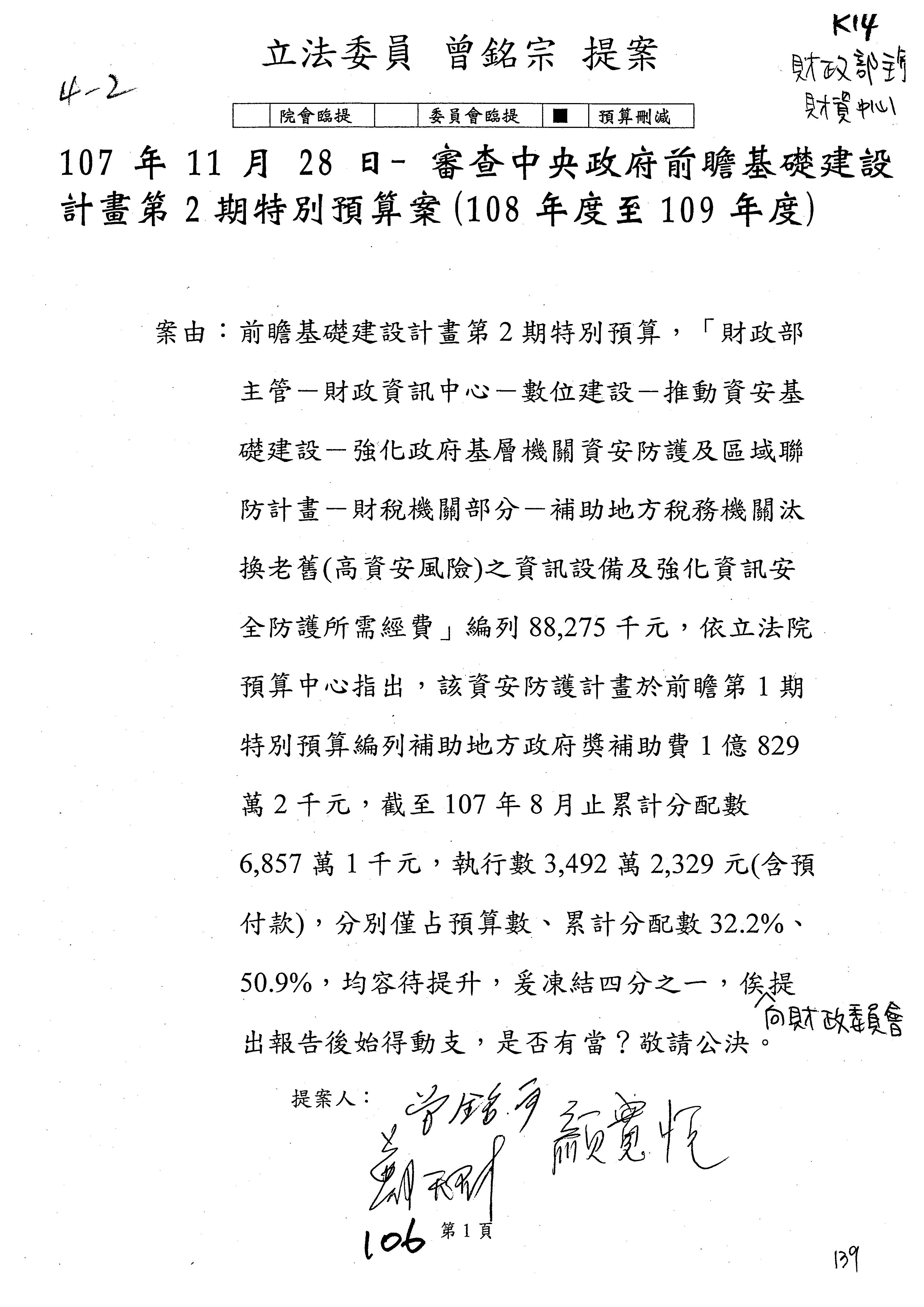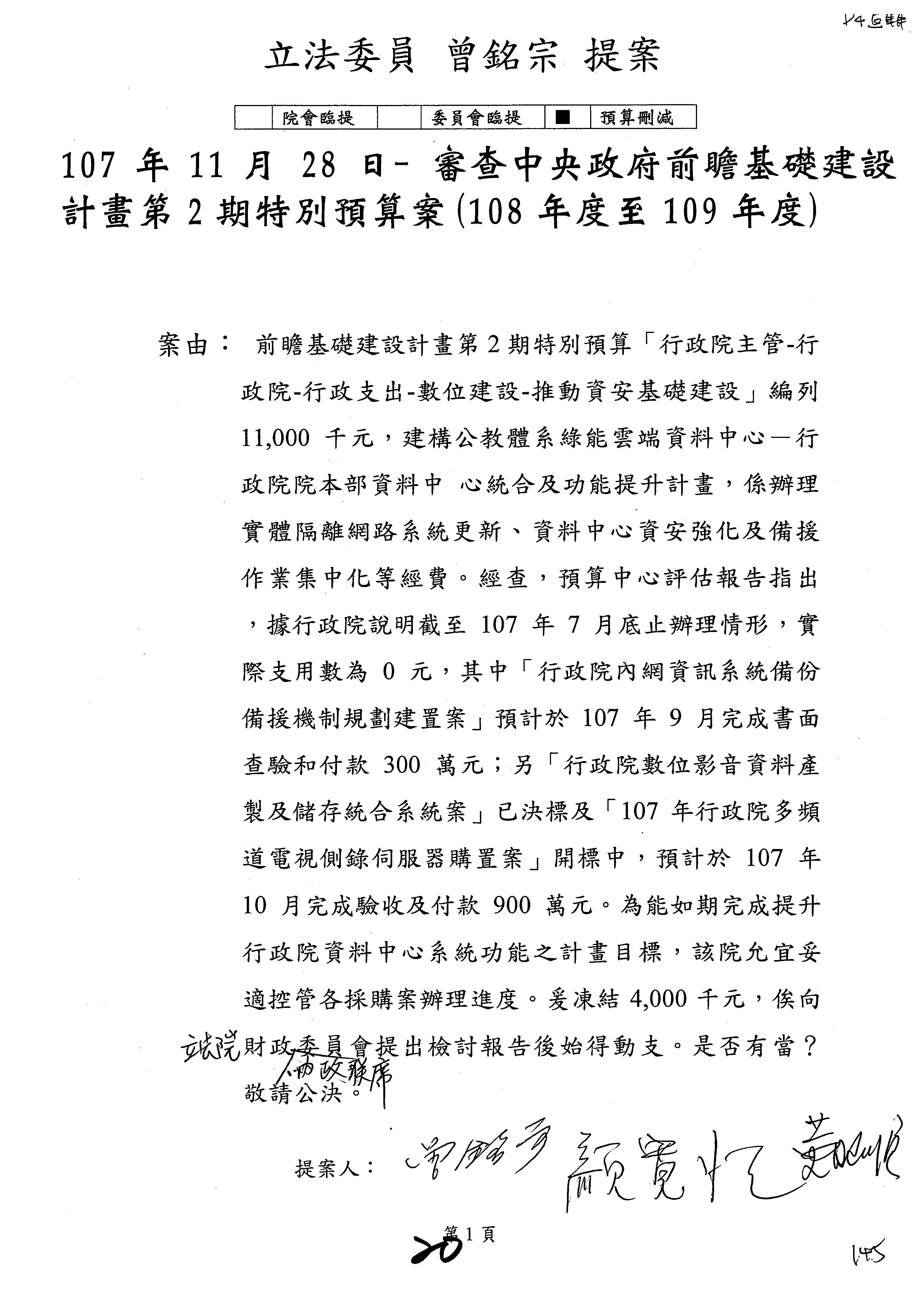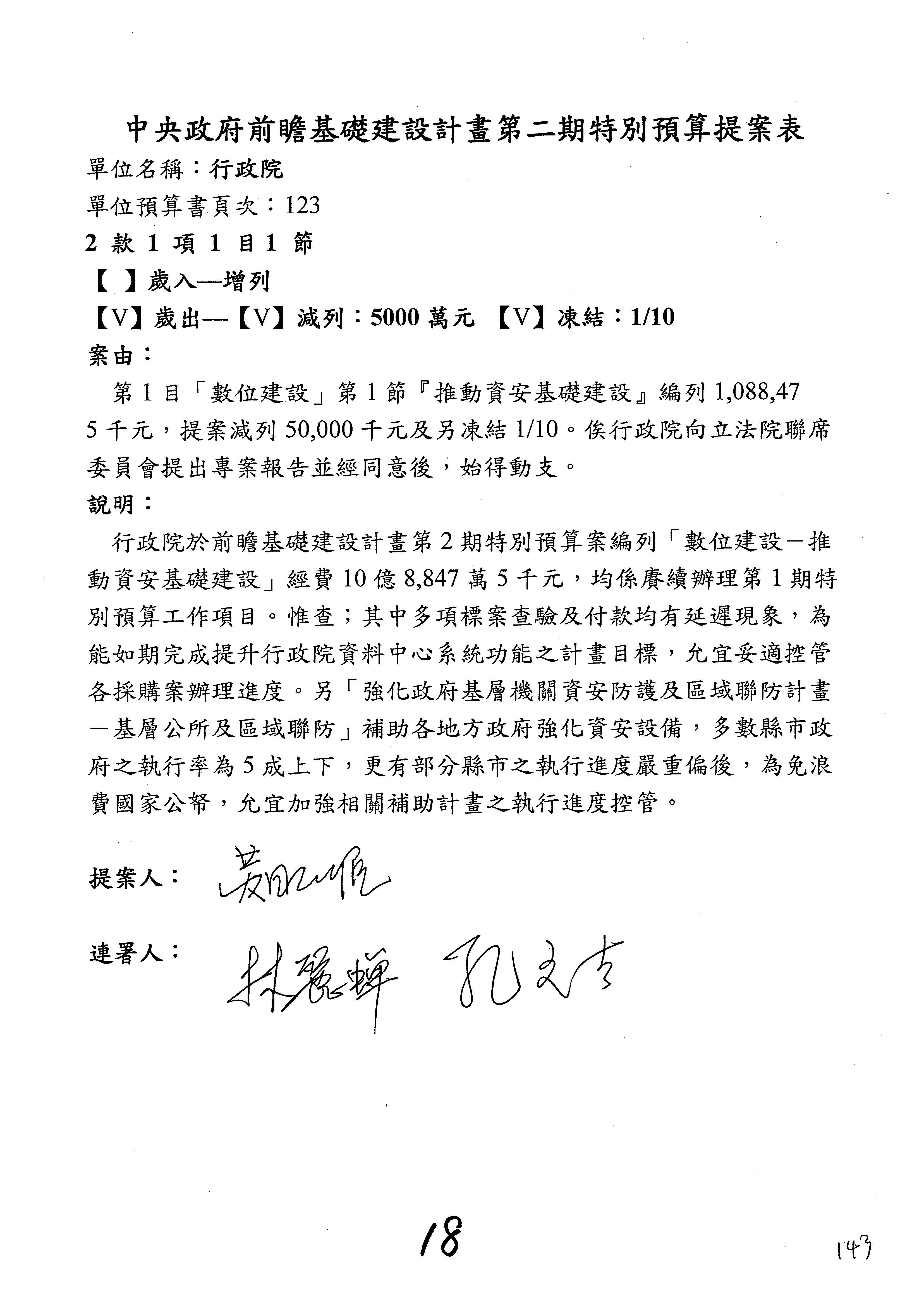 第108案至第111案合併處理,刪減500萬元,刪減資安基礎建設費用。