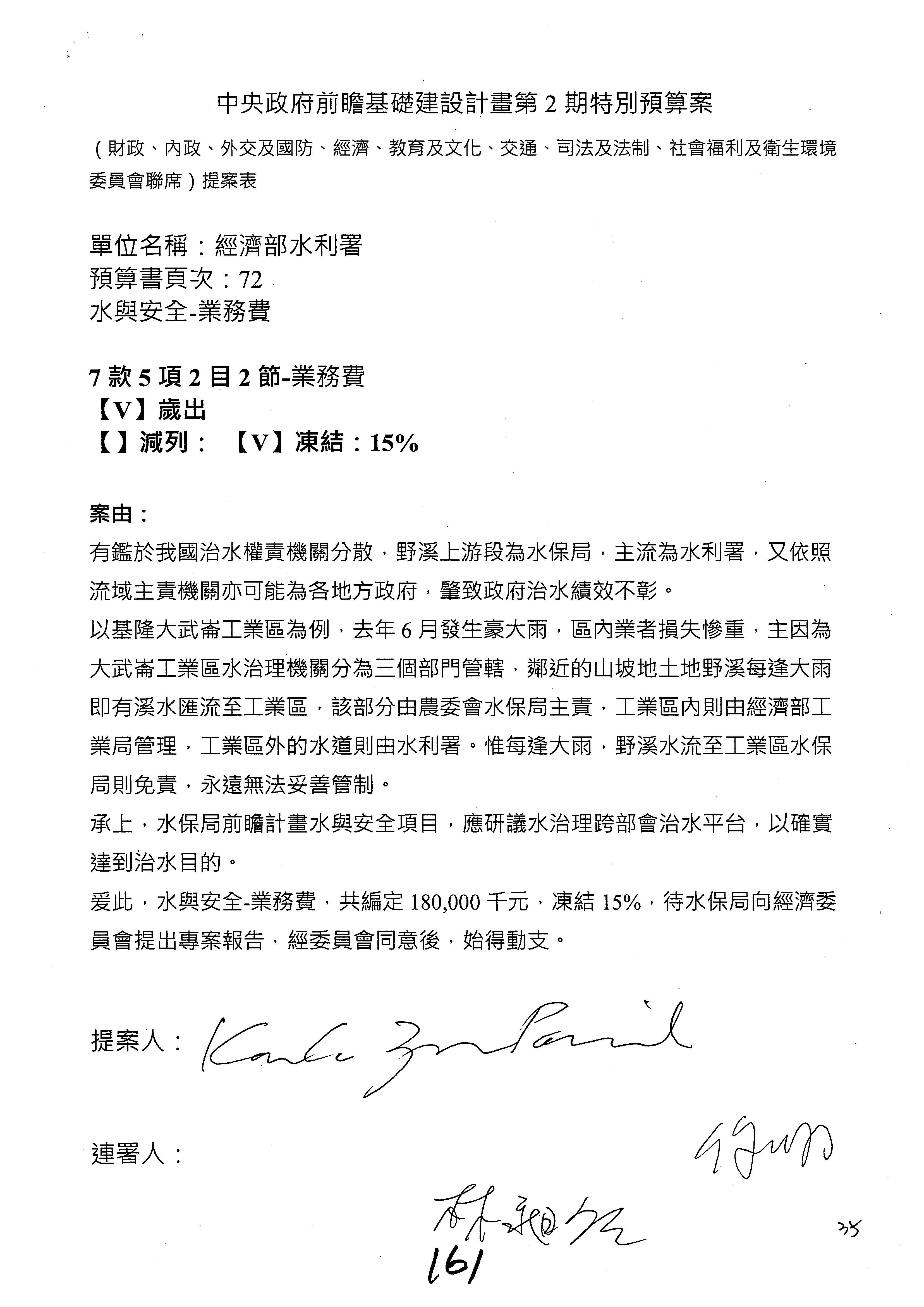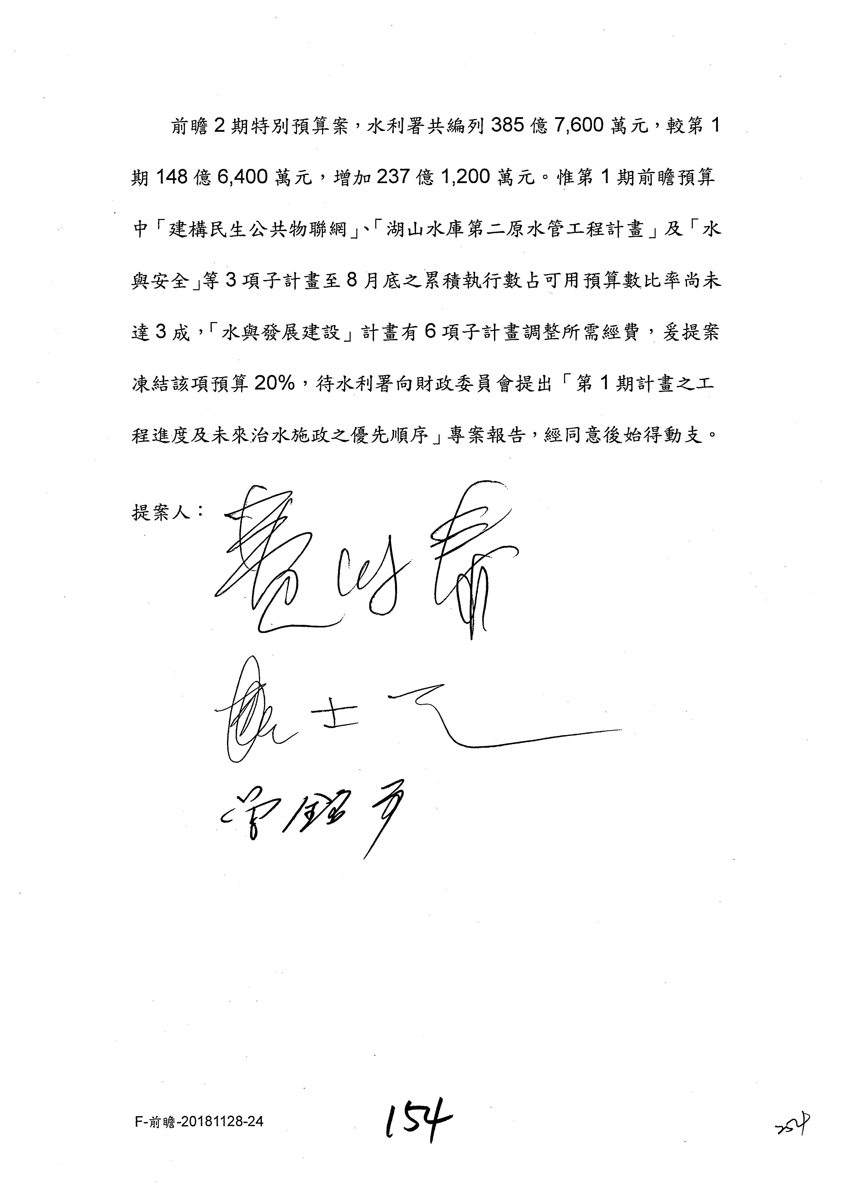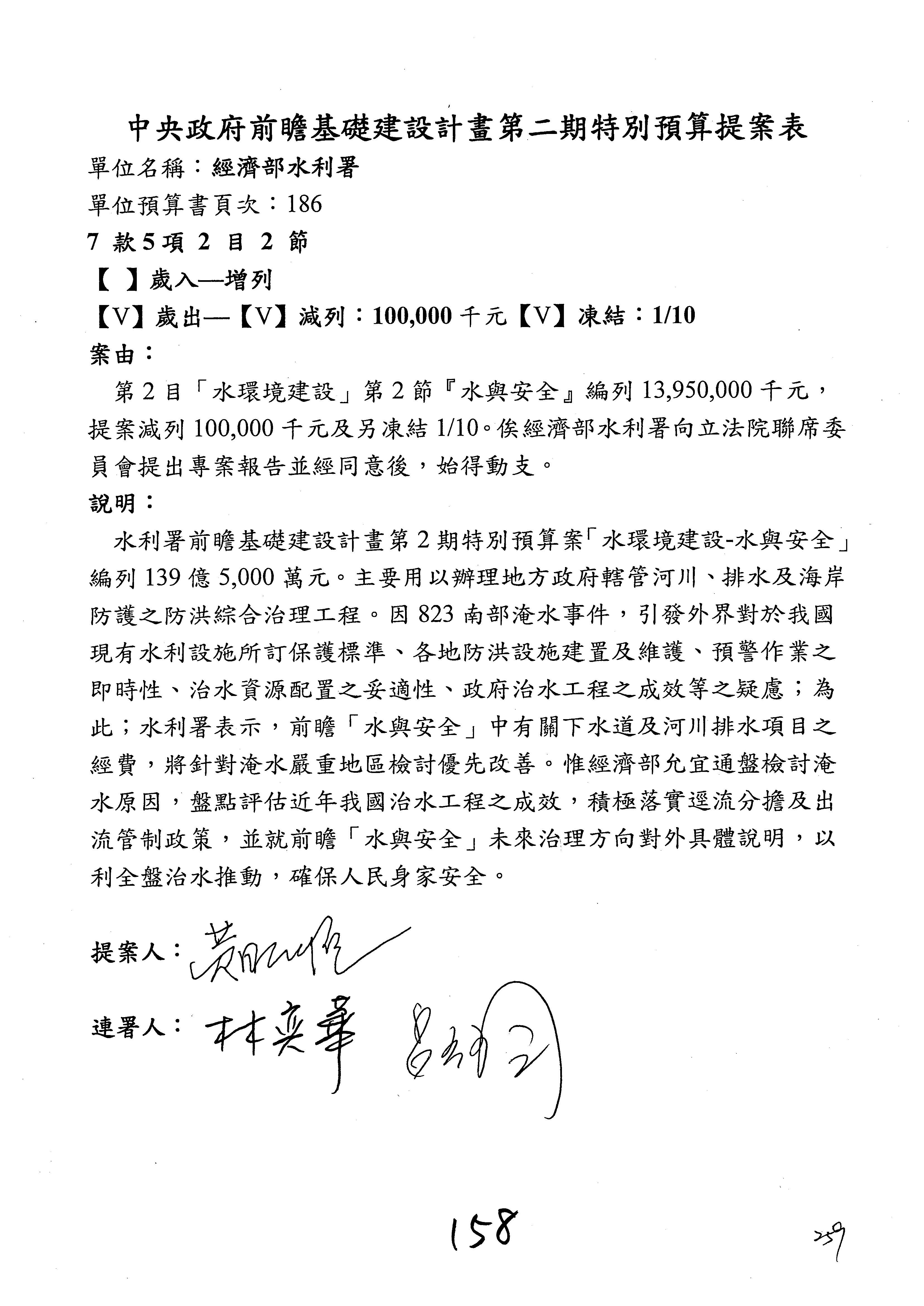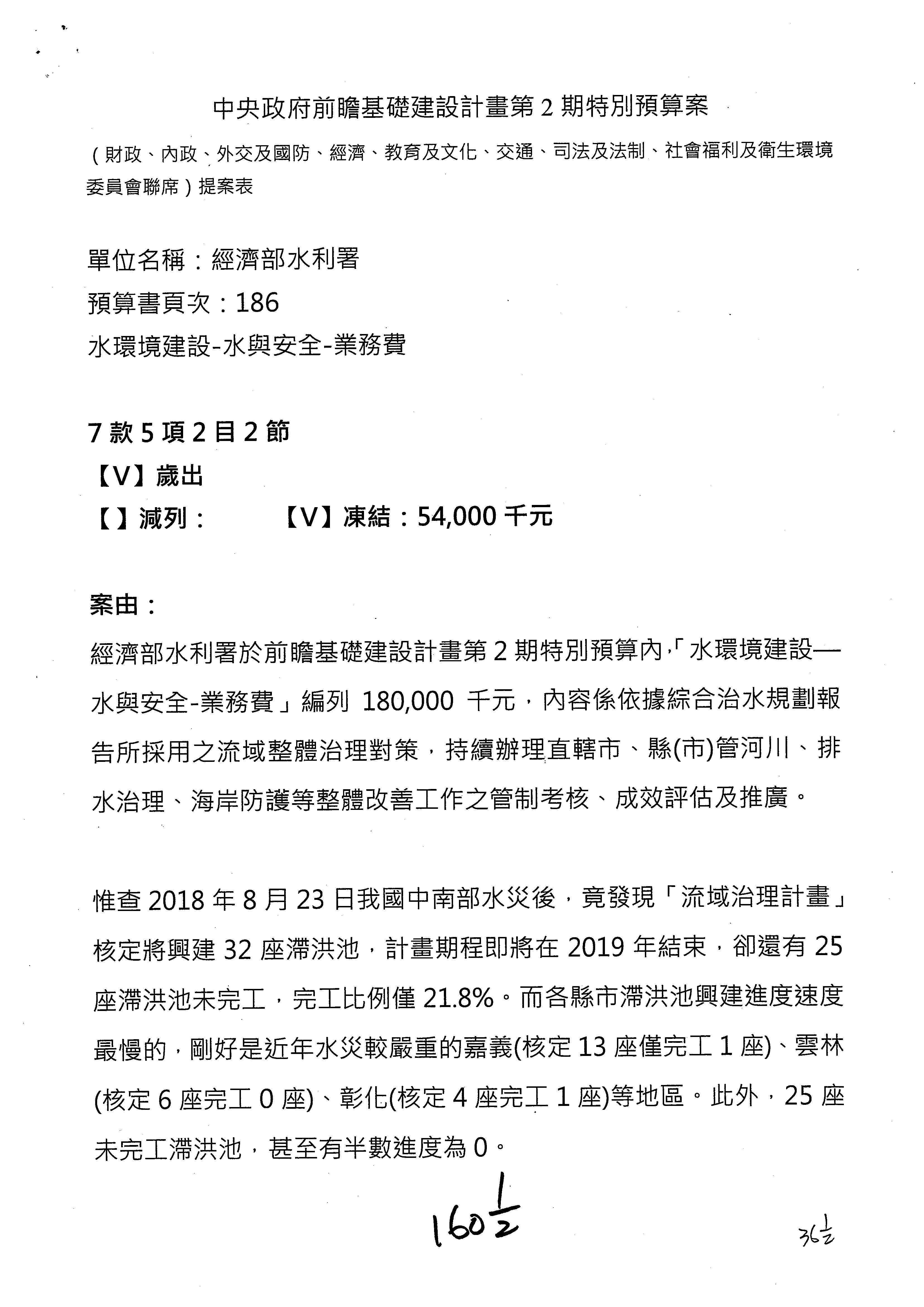 第154案至第164案合併處理,其中第162案、第163案合併獎補助費凍結20%,專案報告;另其餘水環境等相關經費凍結10%,專案報告。