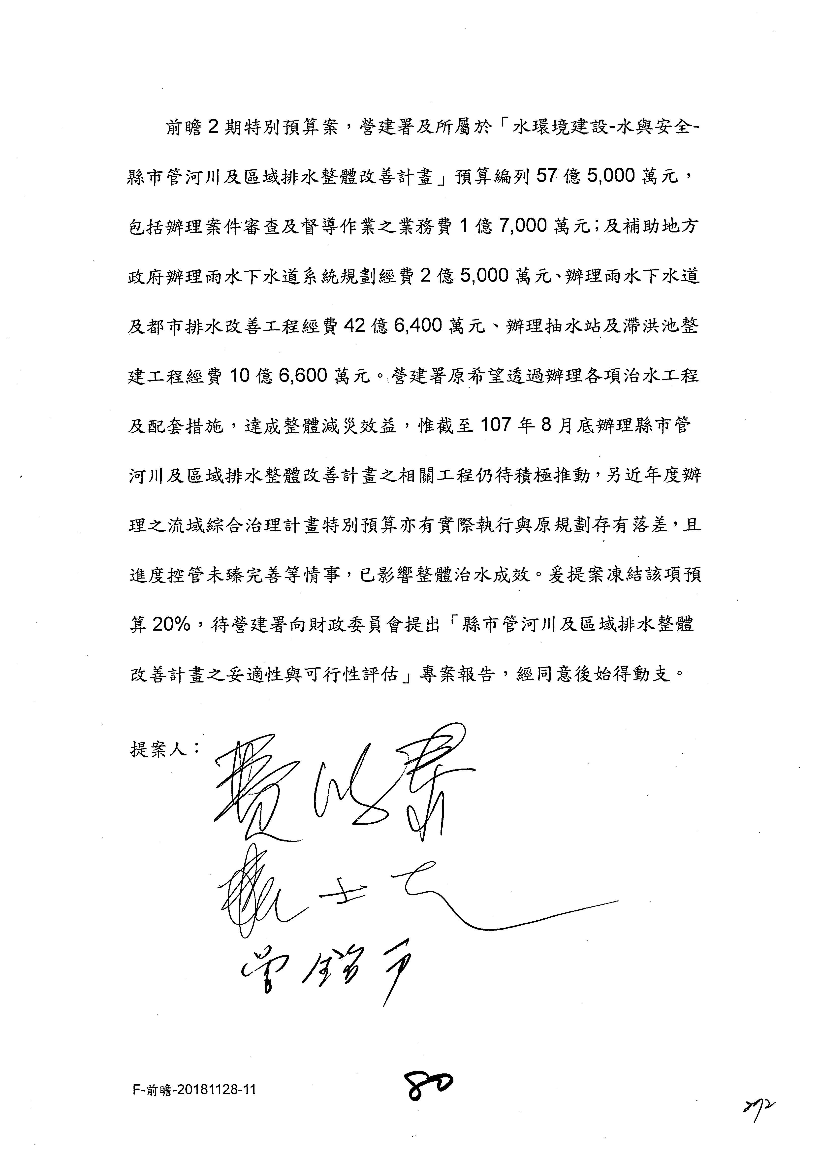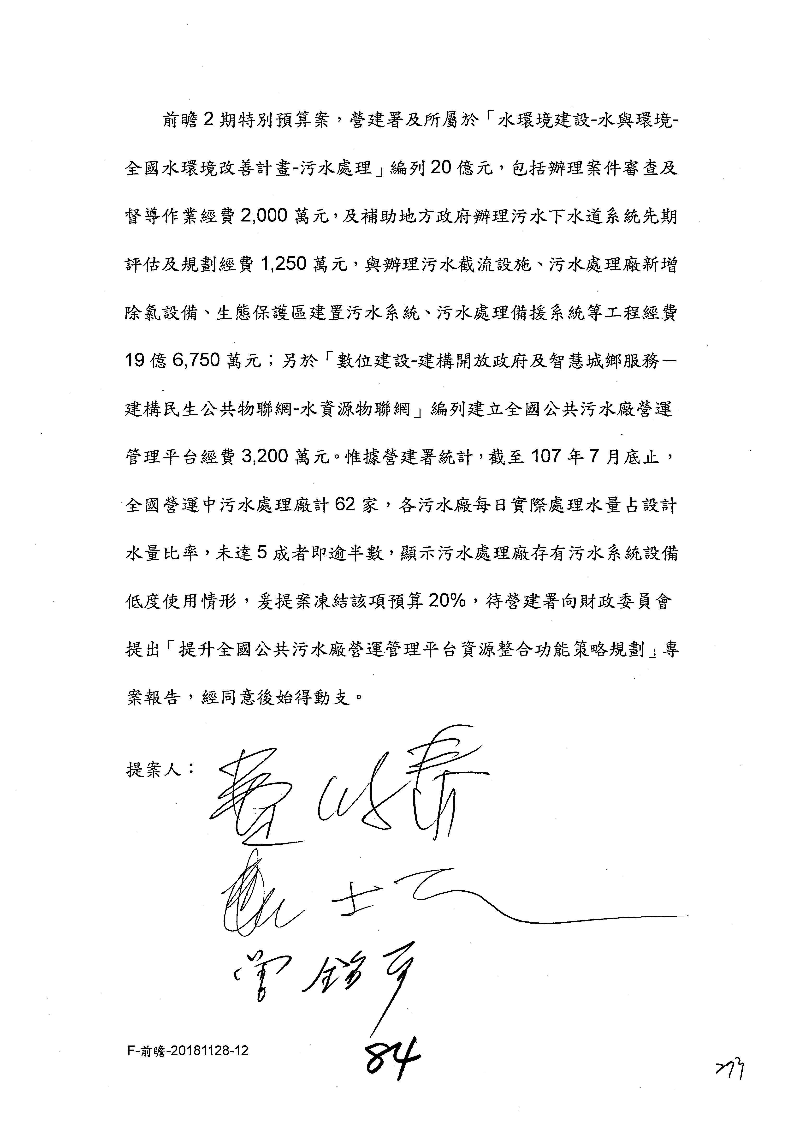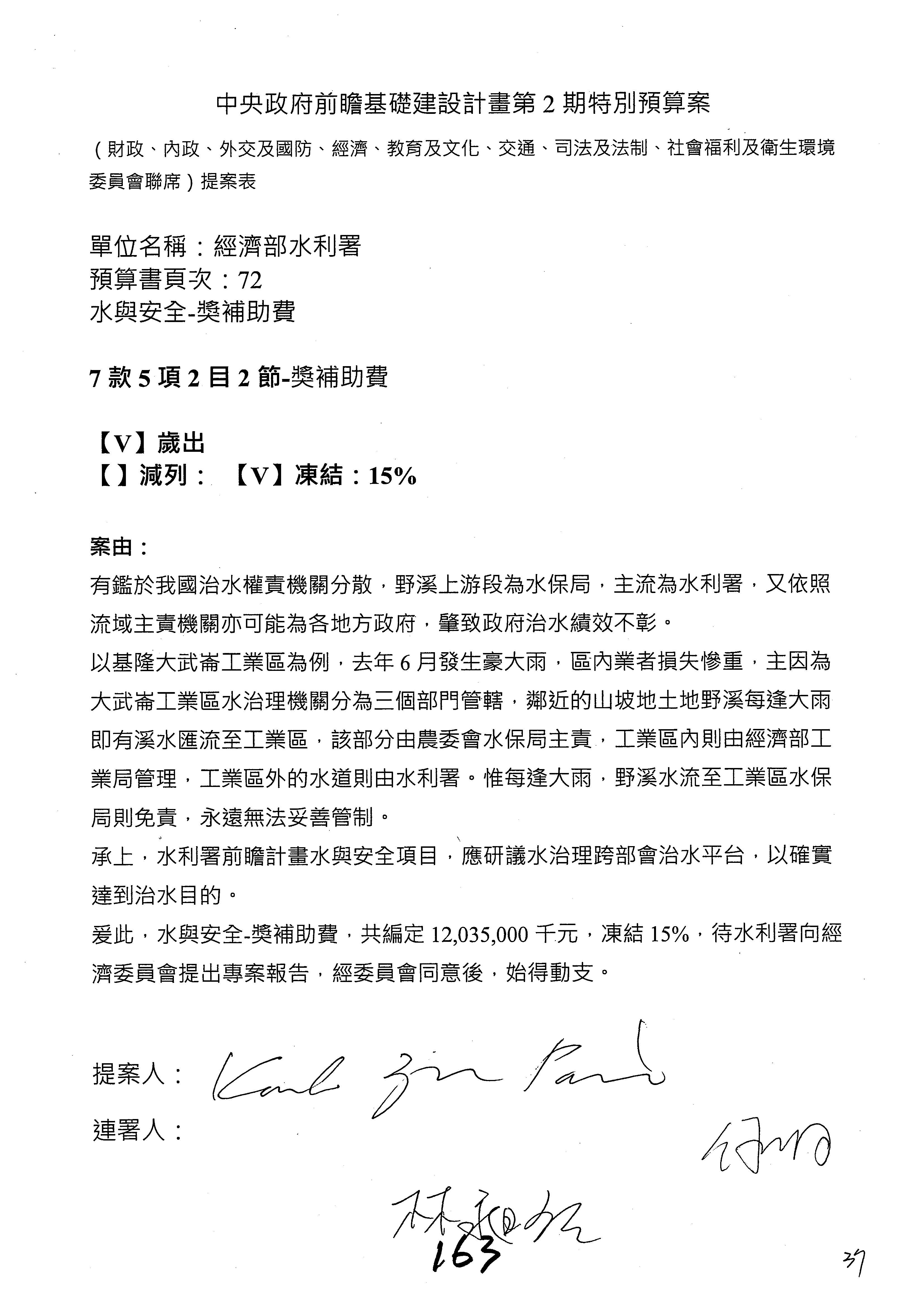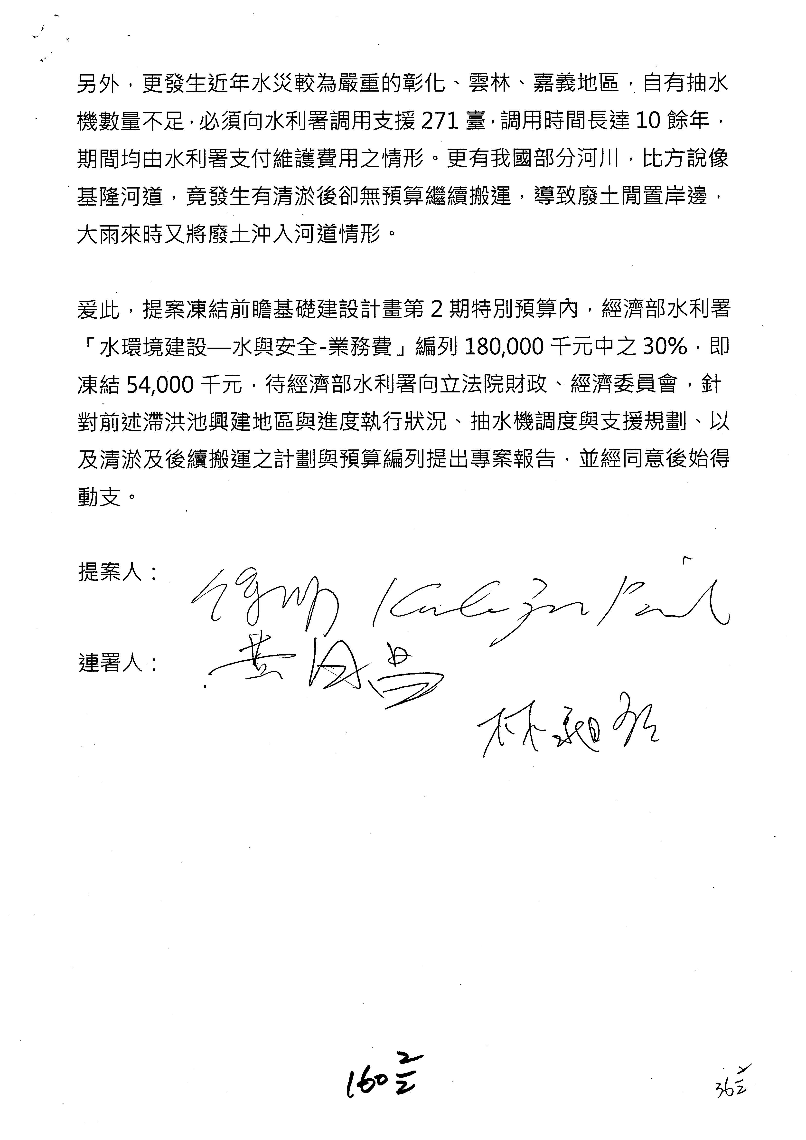第154案至第164案合併處理,其中第162案、第163案合併獎補助費凍結20%,專案報告;另其餘水環境等相關經費凍結10%,專案報告。