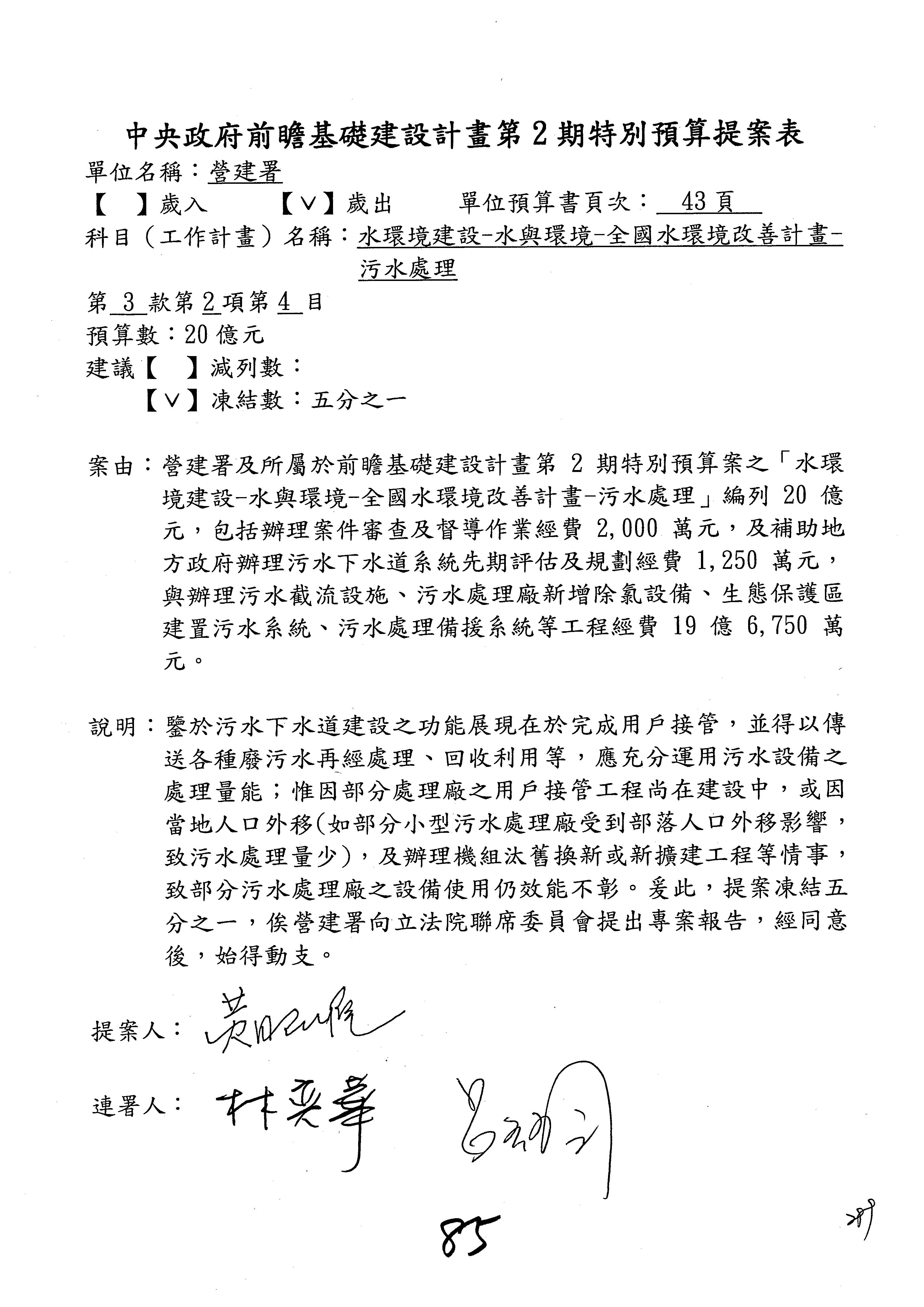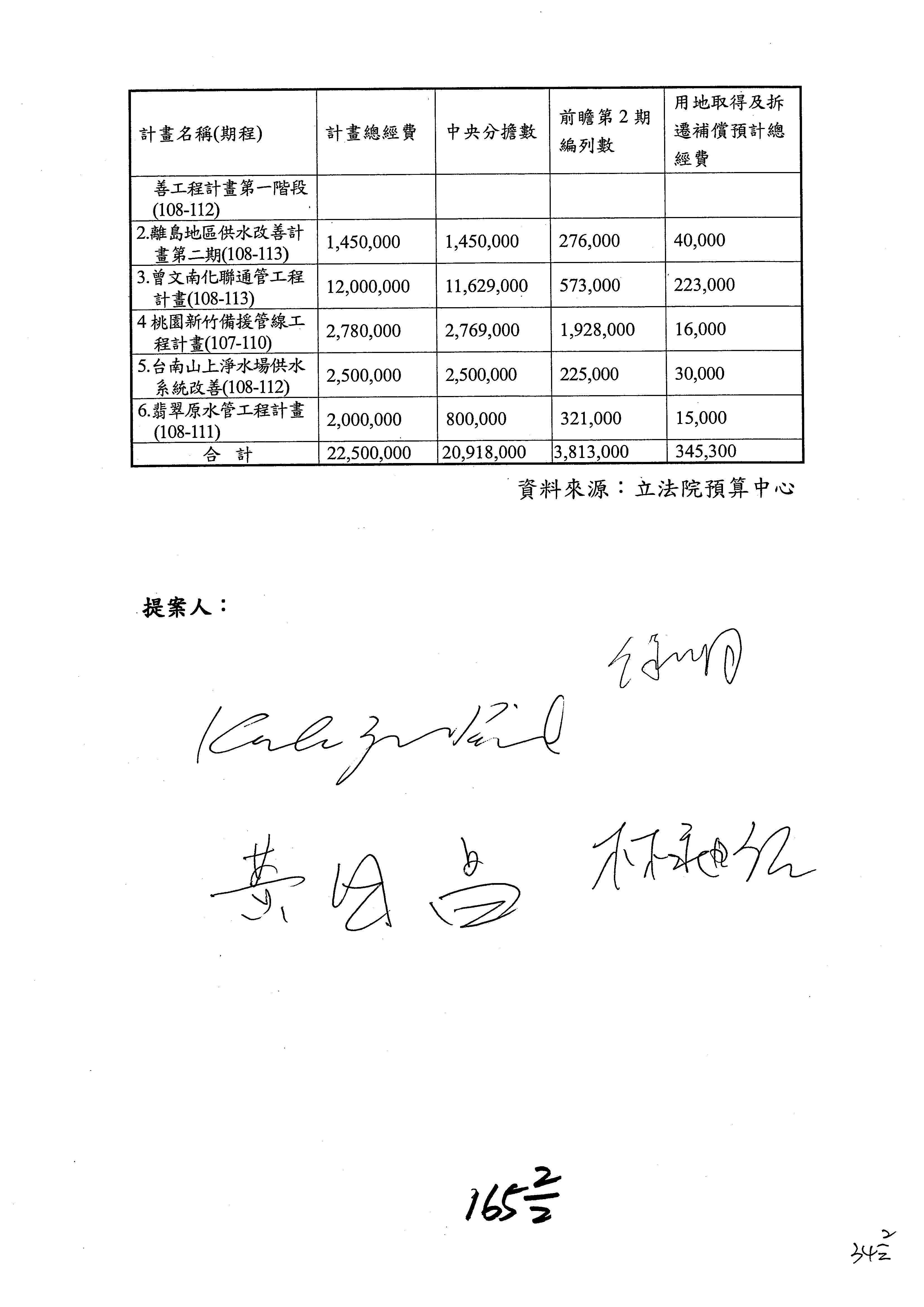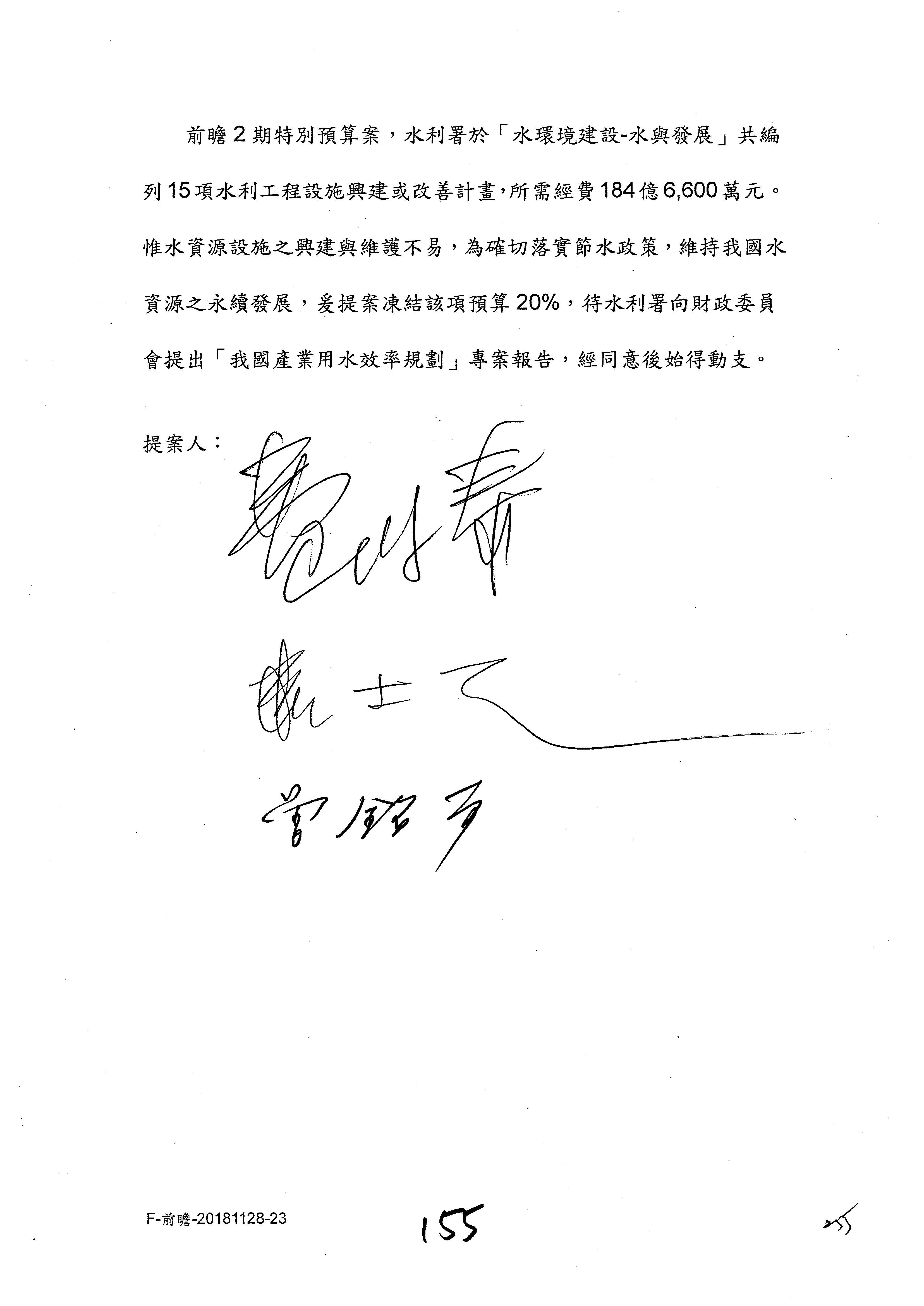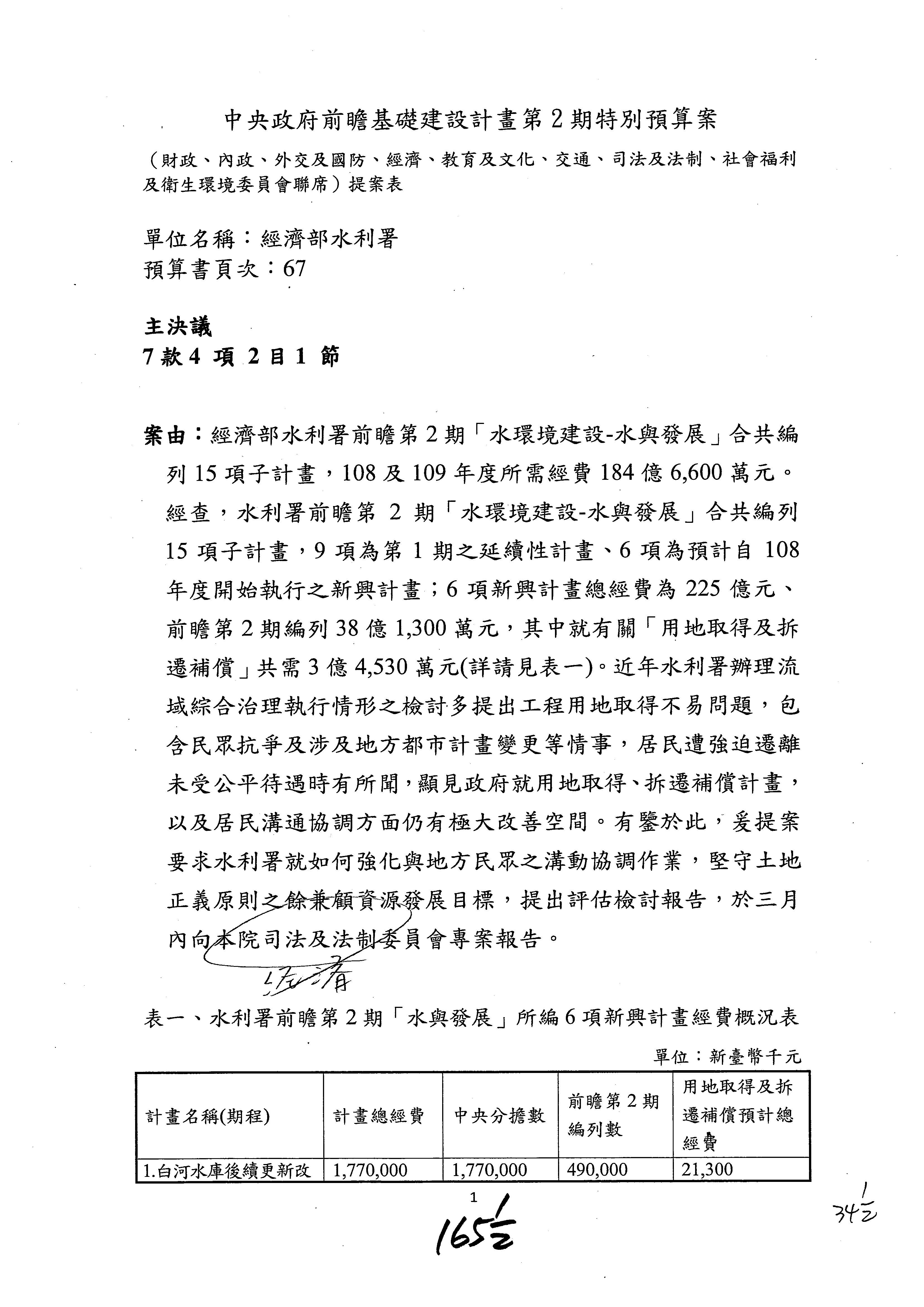 第154案至第164案合併處理,其中第162案、第163案合併獎補助費凍結20%,專案報告;另其餘水環境等相關經費凍結10%,專案報告。