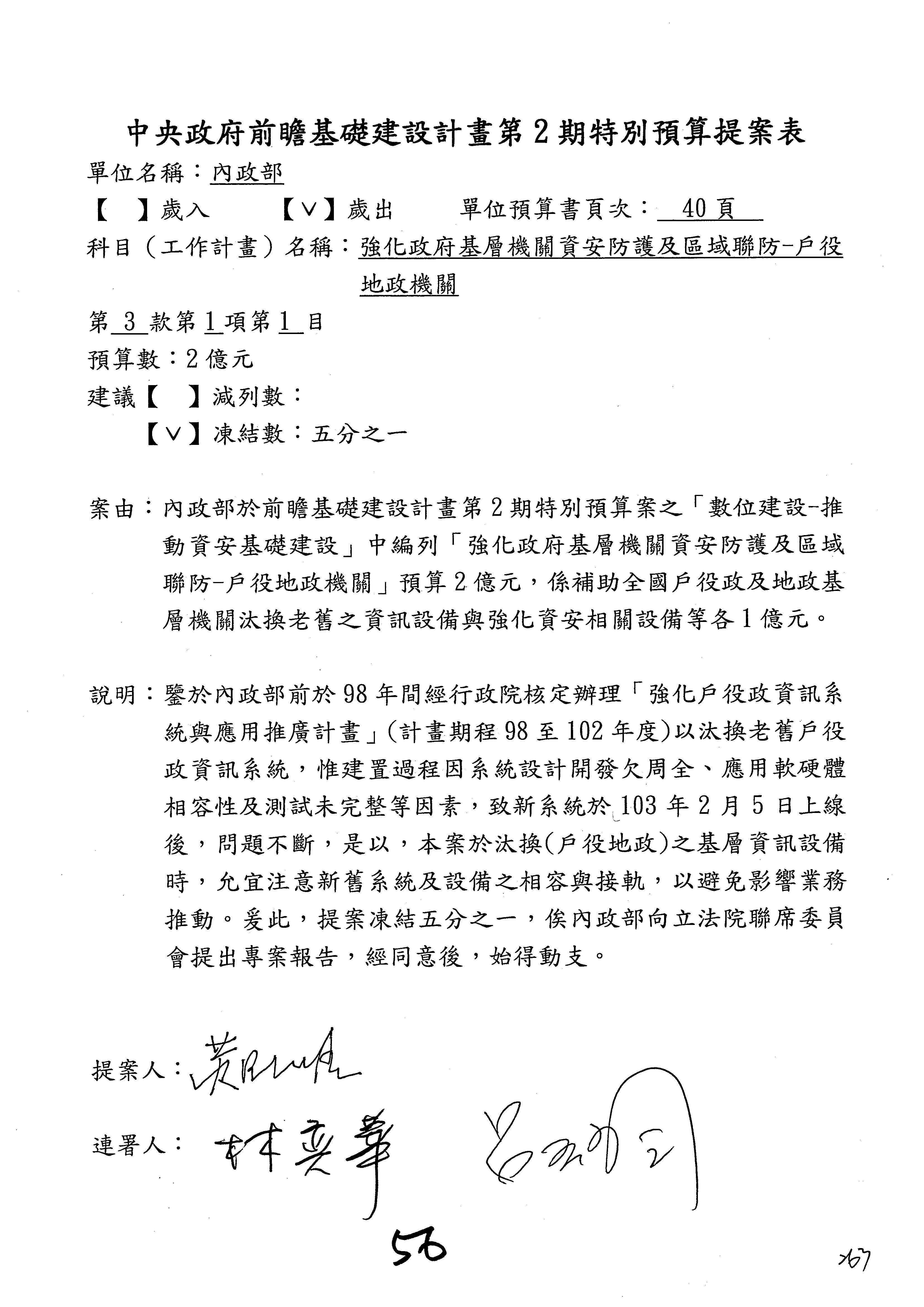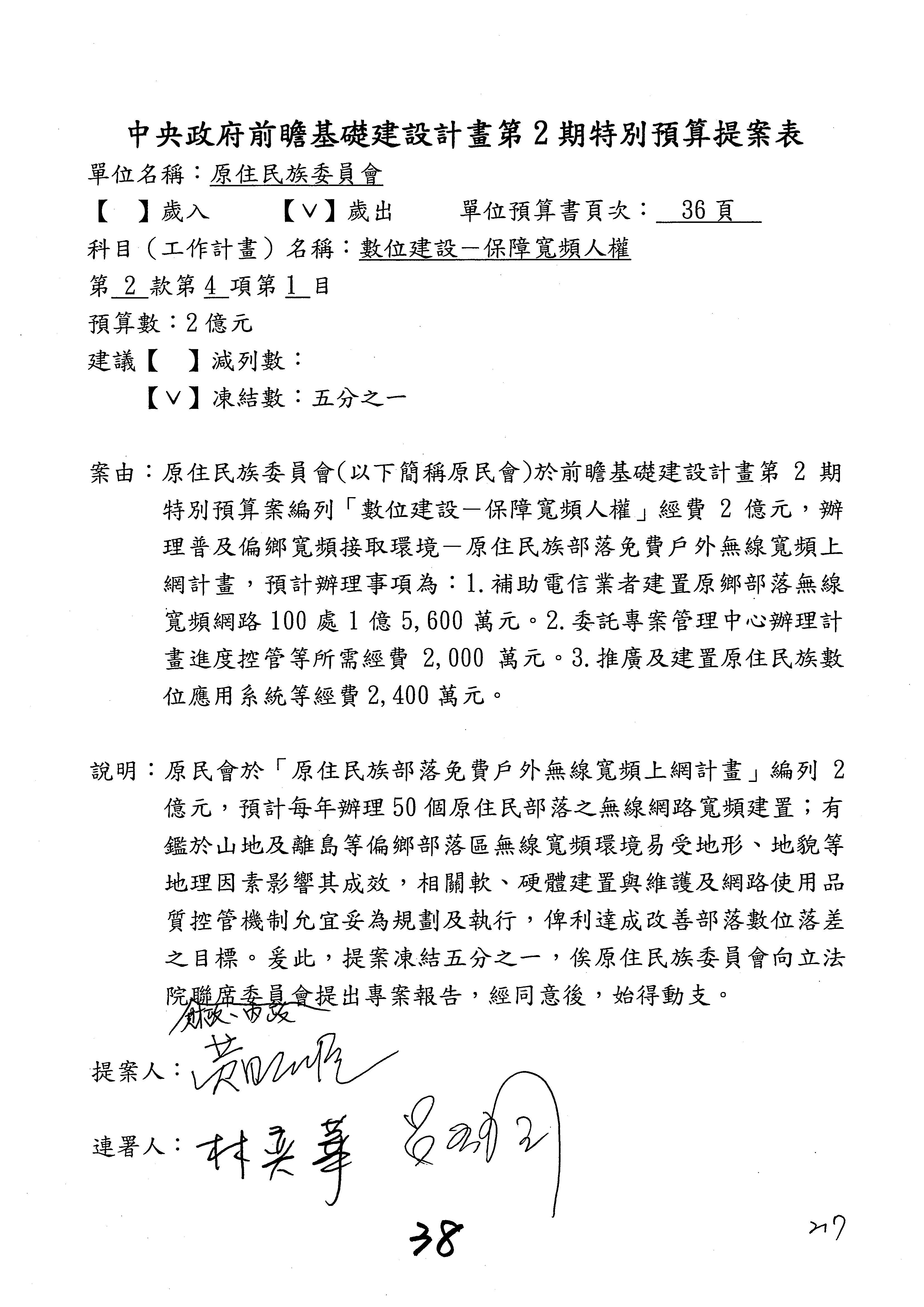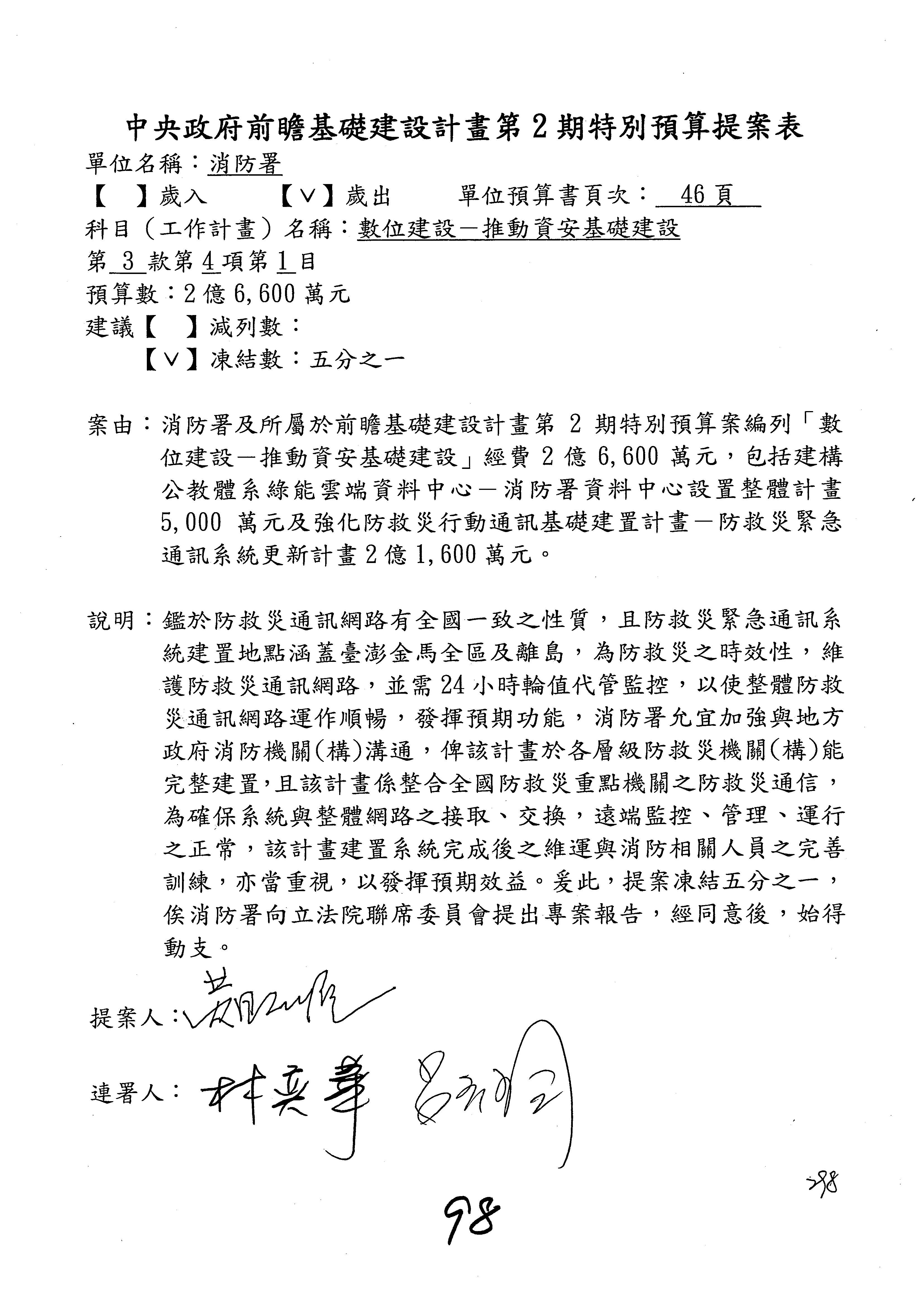 現在處理第100案,有關移民署新住民寬頻上網計畫,一共4,688萬5,000元。黃昭順委員提案凍結五分之一,林麗蟬委員同不同意?