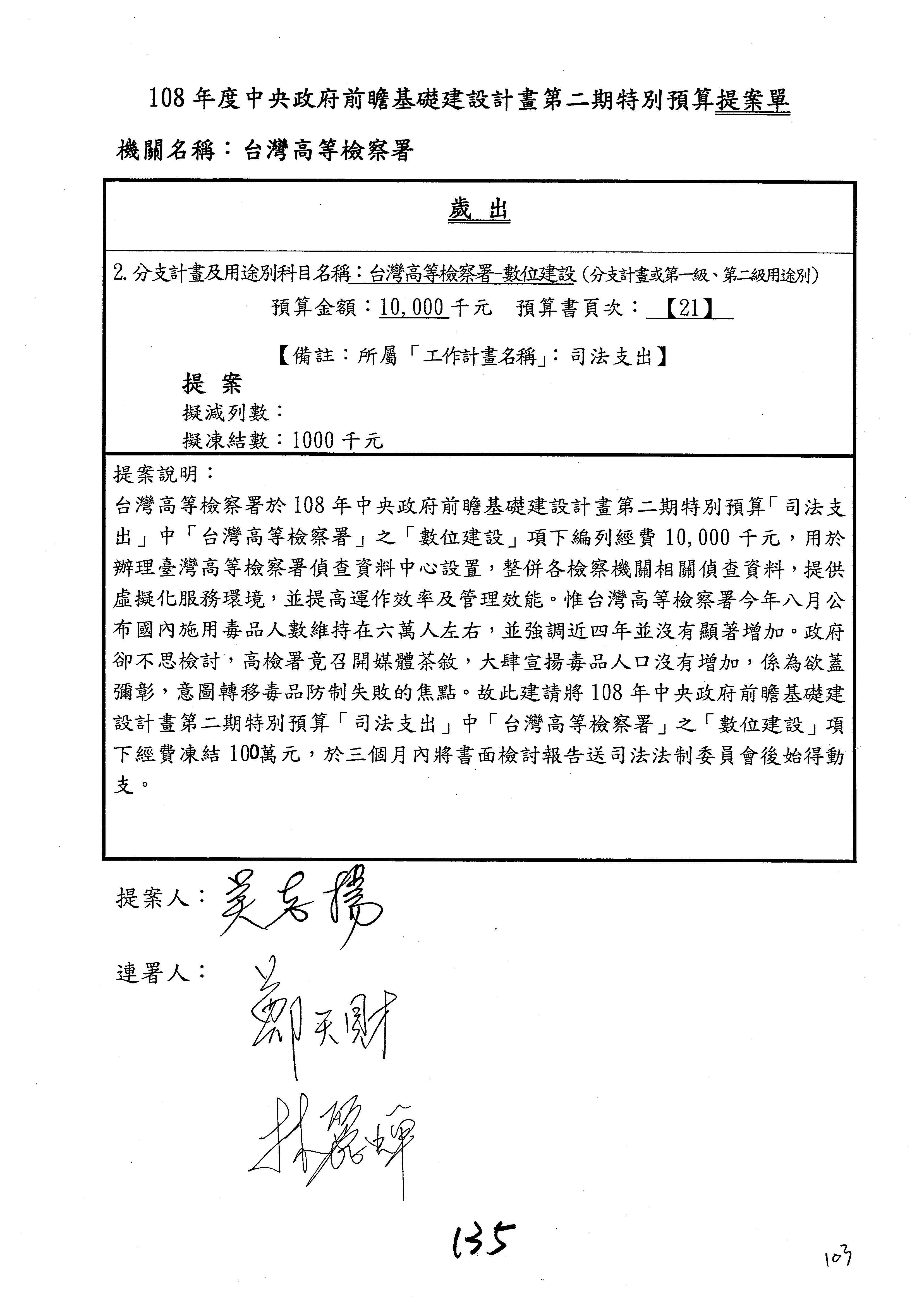 法務部於108年中央政府前瞻基礎建設計畫第二期特別預算編列經費8,100萬元,惟查法務部在第1期計畫於107年度編列經費1,980萬元,用於建置主機虛擬化平台及高速網路架構,截至107年8月底尚未有執行數,迄未見執行成果。又上述第2期特別預算中,108年度分配數為46,000千元,與法務部108年度公務預算部分編列「一般行政─基本行政工作維持─房屋建築養護費」(6,213千元)與「一般行政─基本行政工作維持─設施及機械設備養護費」(23,893千元)經費共30,106千元,內容似有重複編列之虞。另臺灣高等檢察署於108年中央政府前瞻基礎建設計畫第2期特別預算「司法支出」中「臺灣高等檢察署」之「數位建設」項下編列經費10,000千元,用於辦理臺灣高等檢察署偵查資料中心設置,整併各檢察機關相關偵查資料,提供虛擬化服務環境,並提高運作效率及管理效能。惟查臺灣高等檢察署今年八月竟召開媒體茶敘,公布國內施用毒品人數維持在六萬人左右,並強調近四年並沒有顯著增加云云。可見政府不思檢討,大肆宣揚毒品人口沒有增加,有欲蓋彌彰,意圖轉移毒品防制失敗的焦點疑慮。爰要求法務部應於三個月內提出書面報告。