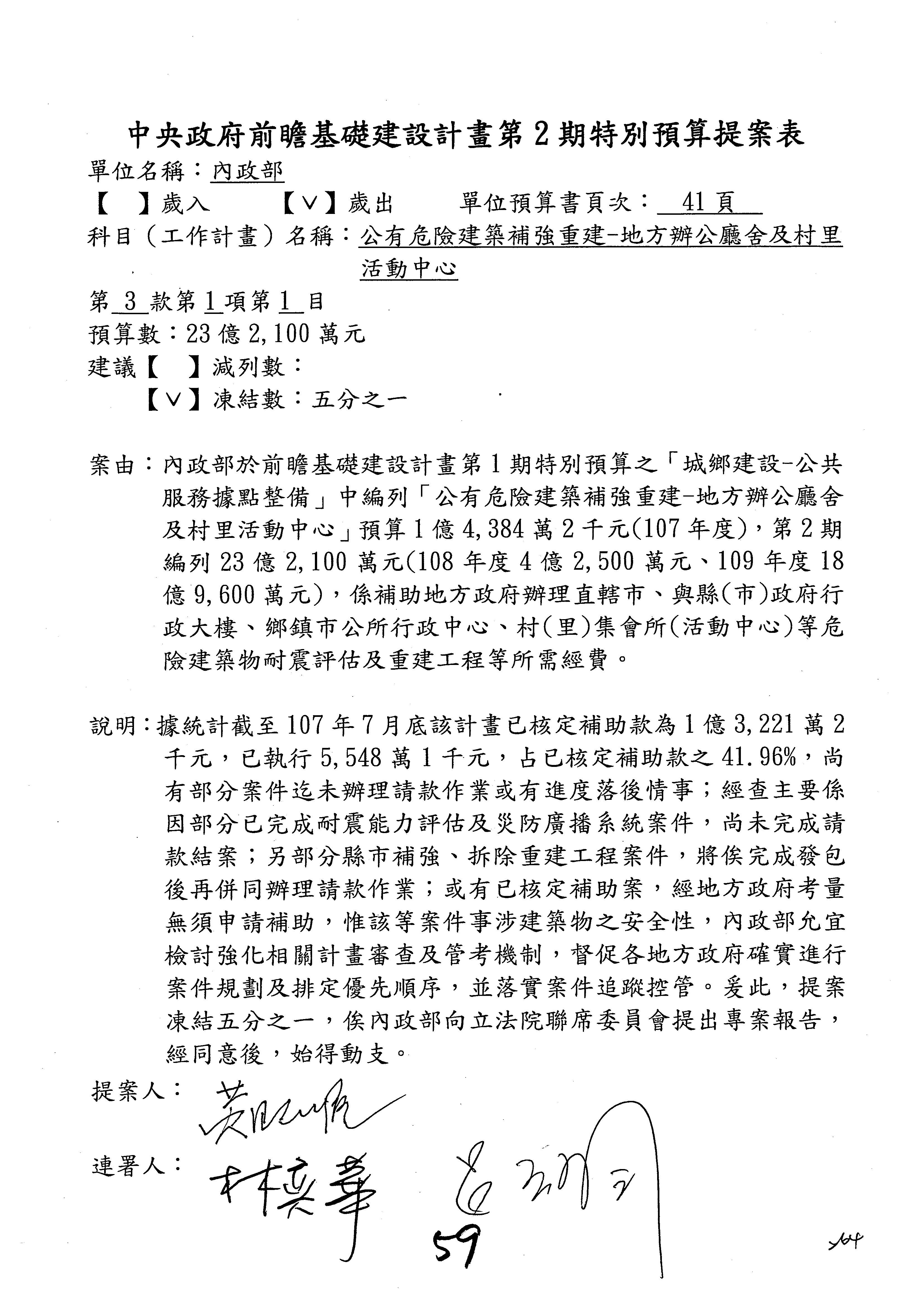 接下來處理第58案至第62案有關公共服務據點整備的部分,也是公有危險建築物補強,包括地方辦公廳舍及村里活動中心。