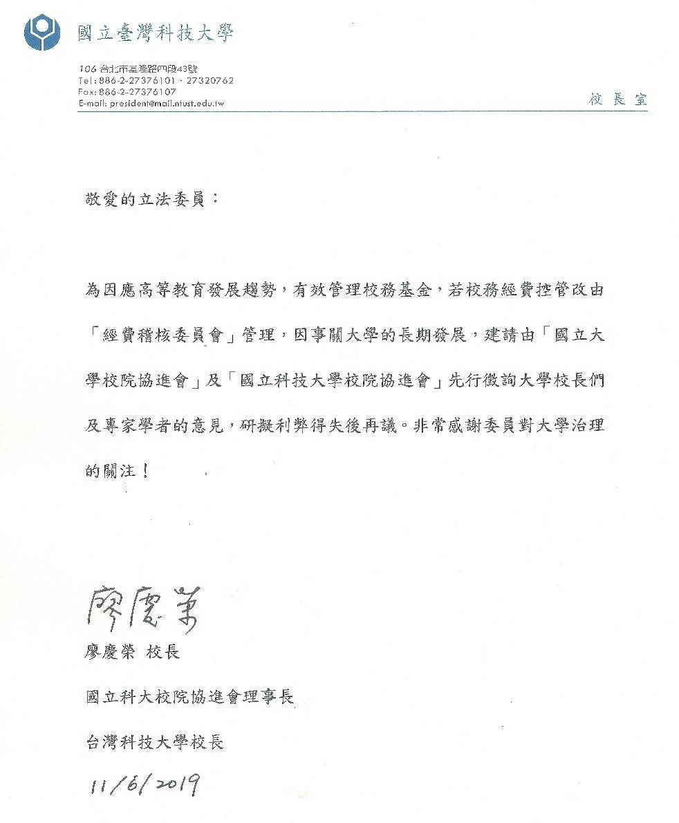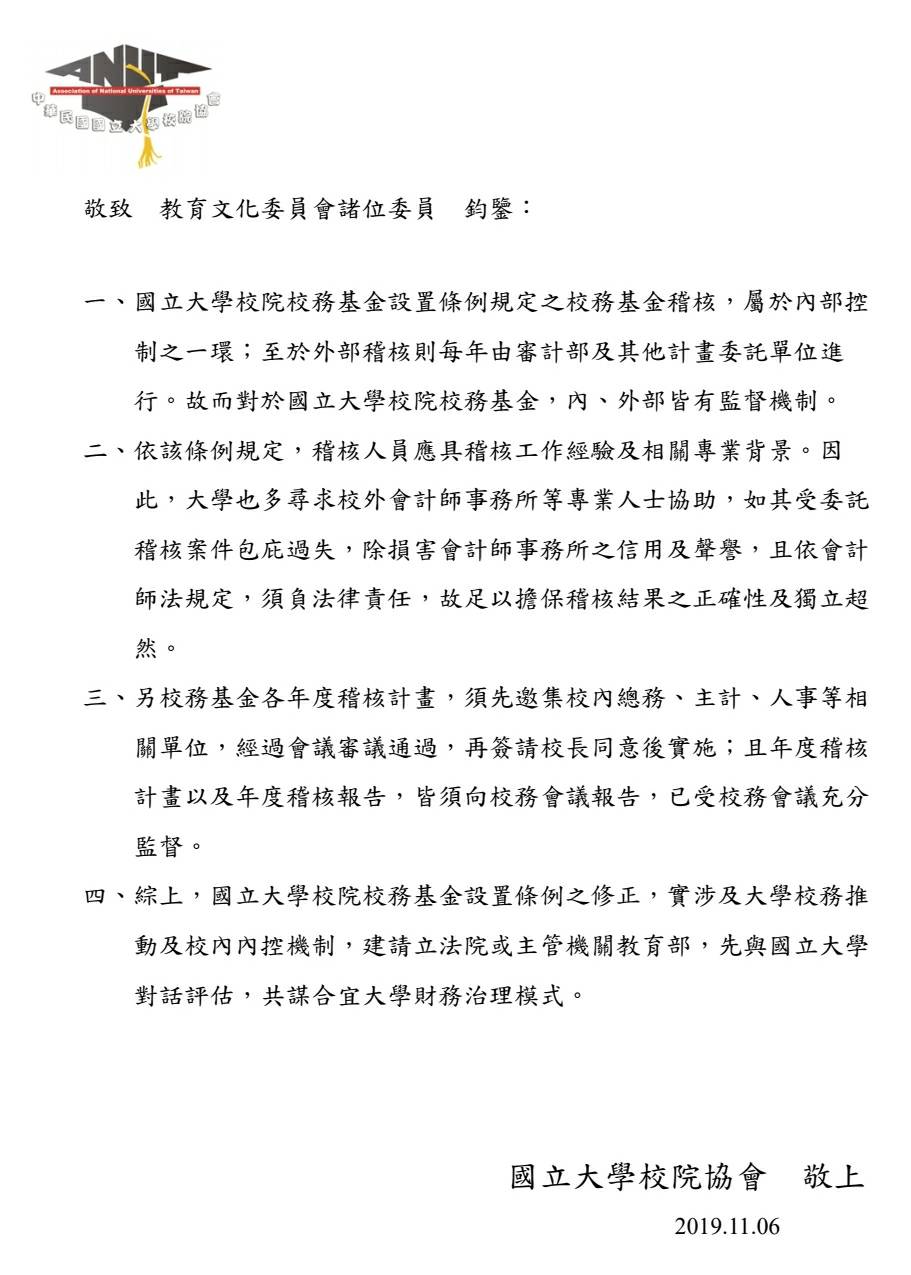 1.有關時代力量黨團提案於本條例第5條新增由校務會議設置經費稽核委員會,並修訂第7條將稽核人員隸屬於經費稽核委員會,因涉及學校稽核制度運作,國立大學校院協會、國立科技大學校院協進會前於108年11月6日分別發表聲明(如附件)。