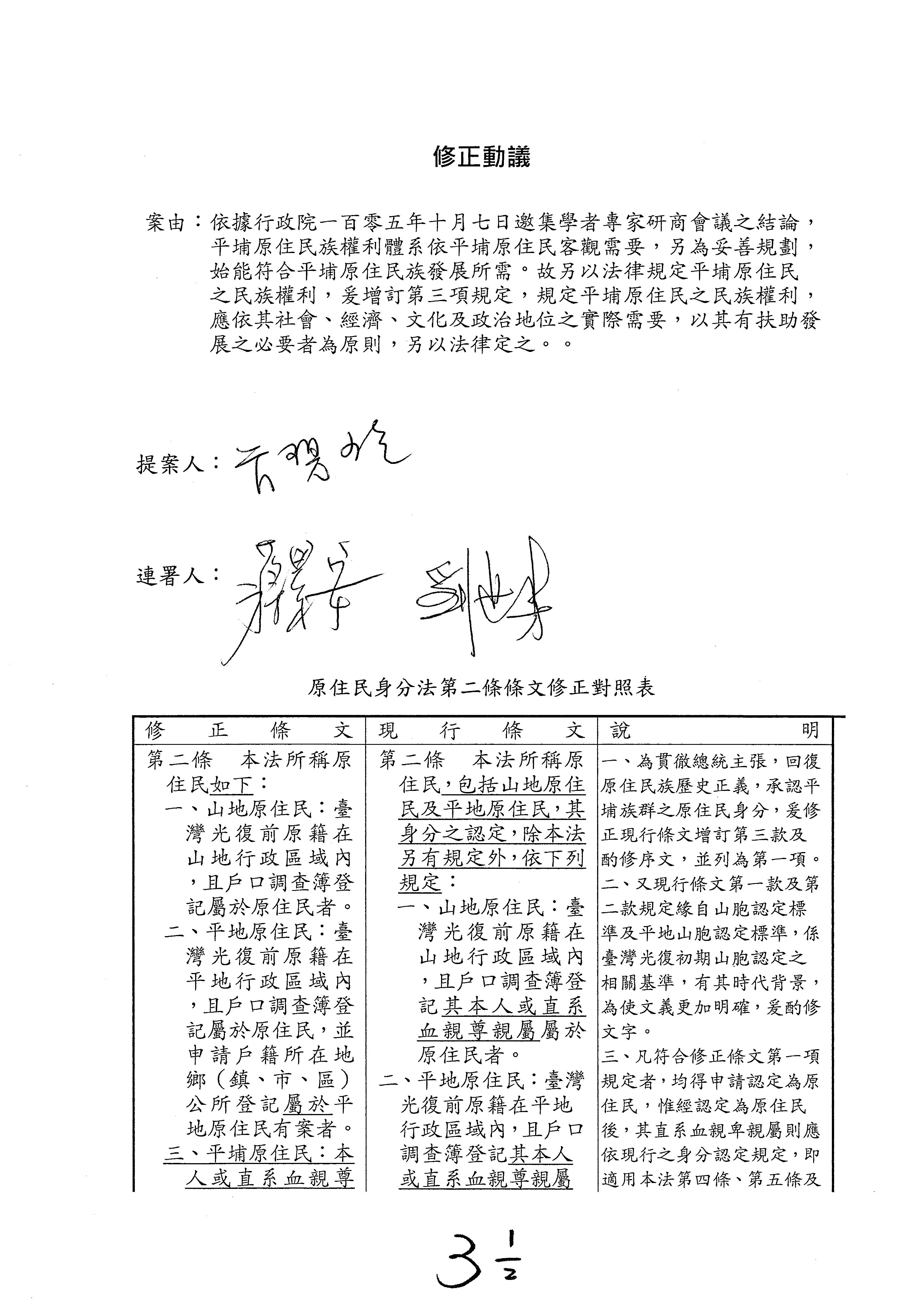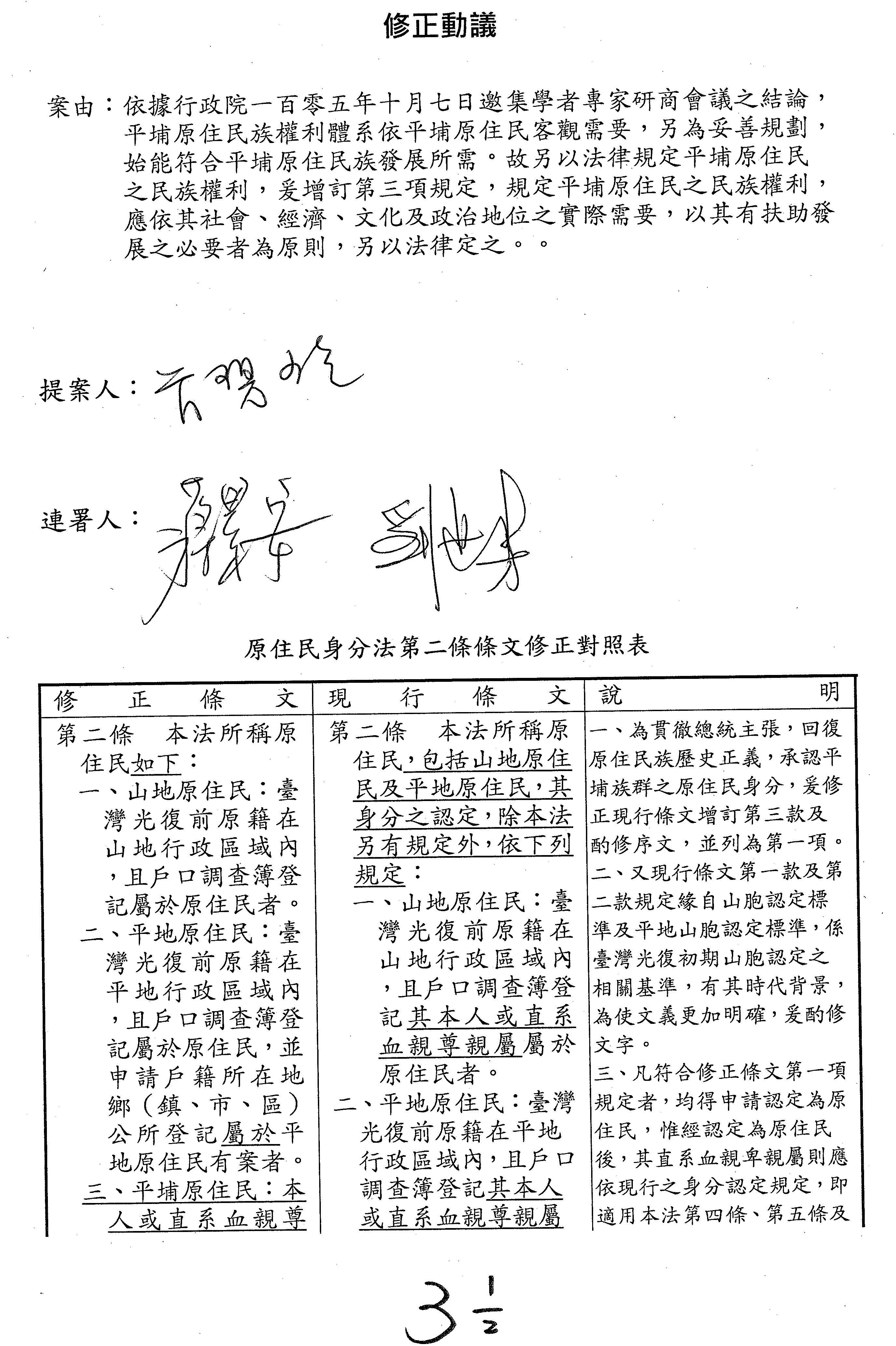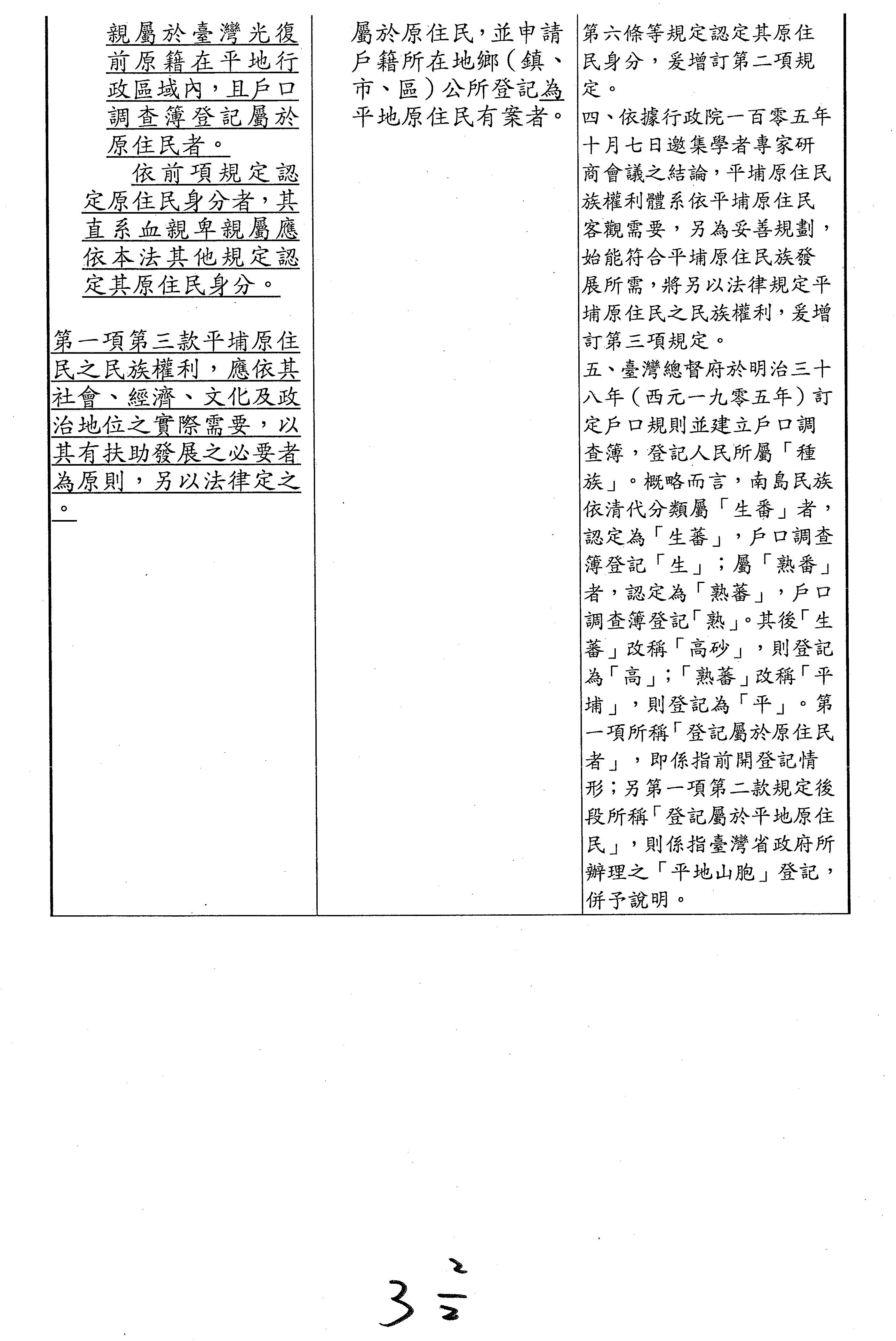 主席:謝謝孔委員談到配套措施,那我就拿我的修正提案來跟委員討論,我的修正提案就是考慮到配套措施,因為現有院版的文字是「平埔原住民族之權益,另以法律定之」,如果另以法律定之,就是用這麼概括性的文字定下去的話,未來要修法的時候,因為我們在民族權益的處理上現有兩百八十幾項法令相關的權利保障,則哪一項要排除、哪一項不要排除,恐怕未來修法的時候,要予以排除都很難找到得以服人的理由,所以配套措施在這次修法的時候就應該納入並予以考量,因此我嘗試提出一個修正提案,這個提案就是把配套措施在這次立法的時候就一併修進來,所以就是在第二項本席提出以下跟院版不一樣的文字,即「第一項第三款平埔原住民之民族權利,應依其社會、經濟、文化及政治地位之實際需要,以其有扶助發展之必要者為原則,另以法律定之。」換句話說,未來我們對於平埔族民族權利的立法,在經濟的考量上由於人數非常的龐大或是漢化非常澈底,然後經濟上已經十分優勢,像這樣的平埔族族人,我們未來在立法的時候假設絕大範圍都要排富,相較於現有山原跟平原的權益又沒有排富,為何到平埔族的時候又要排富呢?將來在考慮的時候,容或會找不出令平埔族人心服的理由,所以是否應該在這次修法的時候,就把未來可能還是著眼、聚焦在有扶助發展之必要者的身上去做修法,這樣的話就會不太需要去擔心這個族群人口規模過於龐大的問題,因為加上這個原則性的規定後,未來法律修法時要去考量種種現有的因素以及政府資源運用可能性的時候,都會有一個基礎可以來使用,所以本席提出這樣一個修正提案給各位委員做為一個討論的可能,不知委員、行政單位或者法制單位有何看法?