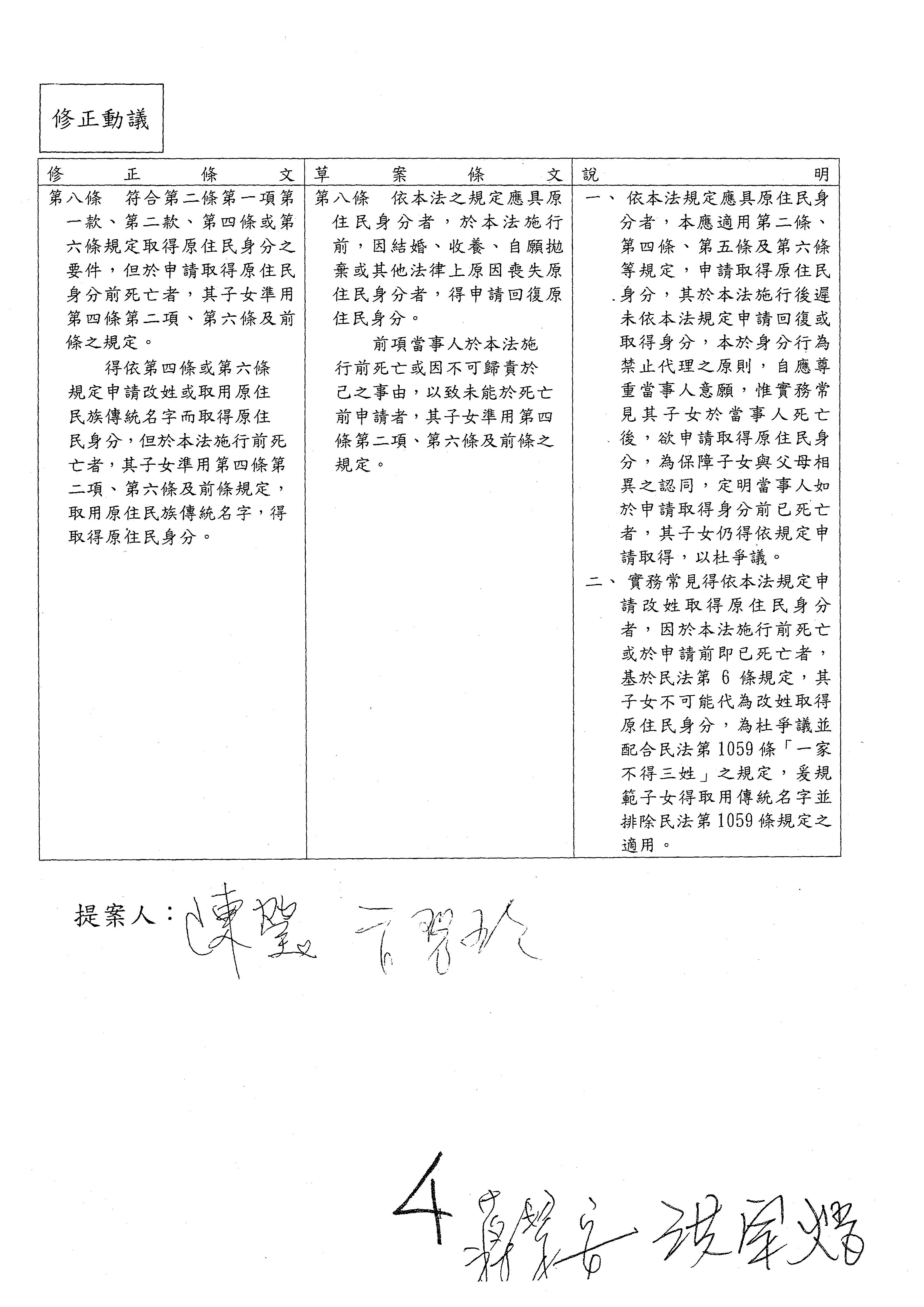 原住民身分法修正草案,第一條照行政院提案通過;第二條保留協商,行政院版、林俊憲委員版、管碧玲委員修正提案以及張宏陸委員修正提案等4個版本保留協商;第三條之各提案均不予採納,維持現行法條文;第四條照行政院提案通過;第五條第二項句末增列「但依中華民國○年○月○日本法修正前第五條第二項、第三項規定取得原住民身分者不在此限」,其餘文字與行政院提案文字相同;第六條照行政院提案通過;第七條第二項句末增列「但依中華民國○年○月○日修正前之第四條第三項取得原住民身分者不在此限」,第三項予以刪除,其餘文字與行政院提案文字相同;第八條第一項將「除法律上原因」修正為「法令上原因」外,其餘文字與行政院提案第一項文字相同。第二項修正為「前項當事人已死亡者,或因不可歸責於己之事由以致未能於死亡前申請者,其子女准用第四條第二項、第六條及前條之規定,亦得從具原住民身分之直系血親尊親屬之姓,或取用原住民傳統名字,申請取得原住民身分」。第三項依陳瑩委員修正動議第二項修正通過,修正文字為「得依本法之規定,申請取得原住民身分,但於本法施行前死亡者,其子女得準用第四條第二項、第六條及前條規定,取用原住民族傳統名字,取得原住民身分」;第九條照案通過,維持現行法;廖委員提案第九條之一不予採納;第十條保留協商;第十一條照行政院提案通過;現行法第十二條照案通過,予以刪除;現行法第十三條改列為第十二條,內容照行政院提案通過。