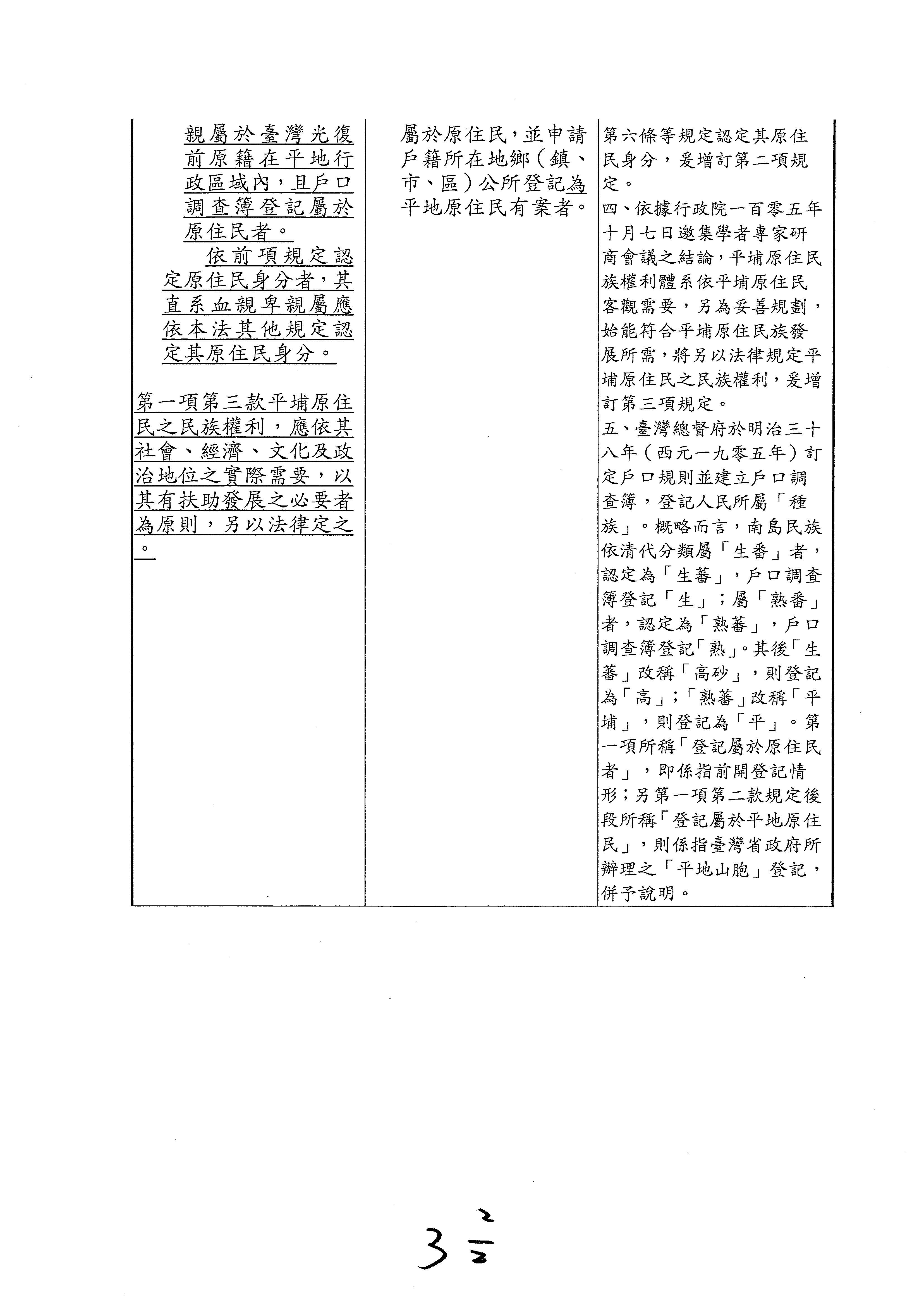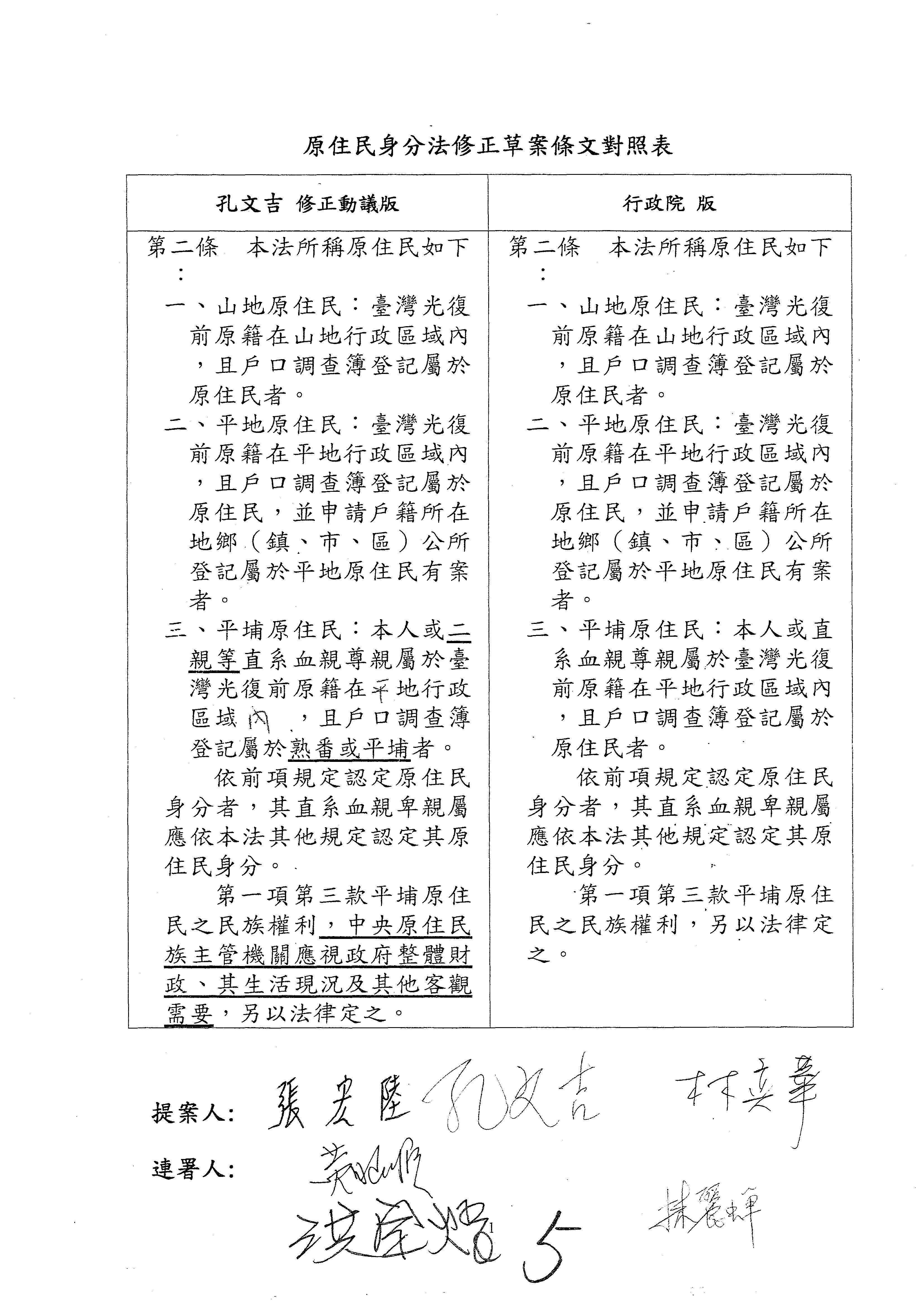 孔委員文吉:因為這一條很重要,大家應該花一點時間討論一下。我剛剛好像聽到最高行政法院已經發回更審,如果不透過這個機會來修法的話,平埔族群很可能就會被納為平地原住民。本席認為這是萬萬不可的!平埔族群是平埔族群,平地原住民是平地原住民,如果平埔族群被歸類為平地原住民的話,我看廖國棟委員和鄭天財委員就不用玩了!因為人數也不曉得,要怎麼推估?所以我的建議還是跟剛才一樣─原民會應該提出推估的數據。因為平埔族並不是一個抽象、空泛的名詞,平埔族群在歷史上很早就喪失他們的身分,沒有辦法成為原住民,我們現在要讓他們可以登記取得原住民的身分。可是要成為平埔原住民的話,配套措施還是要先想好,並不是給他們身分就好了!
