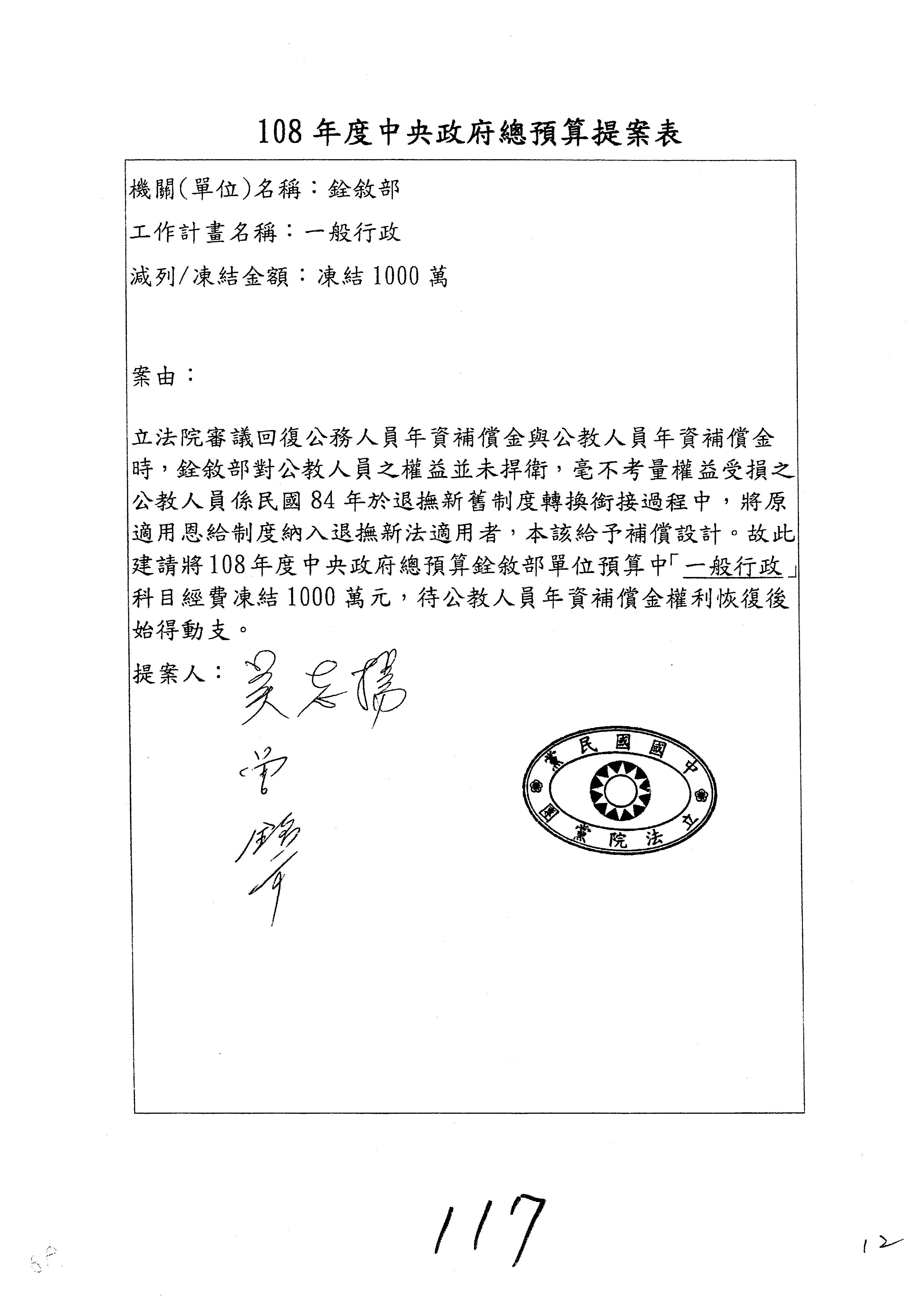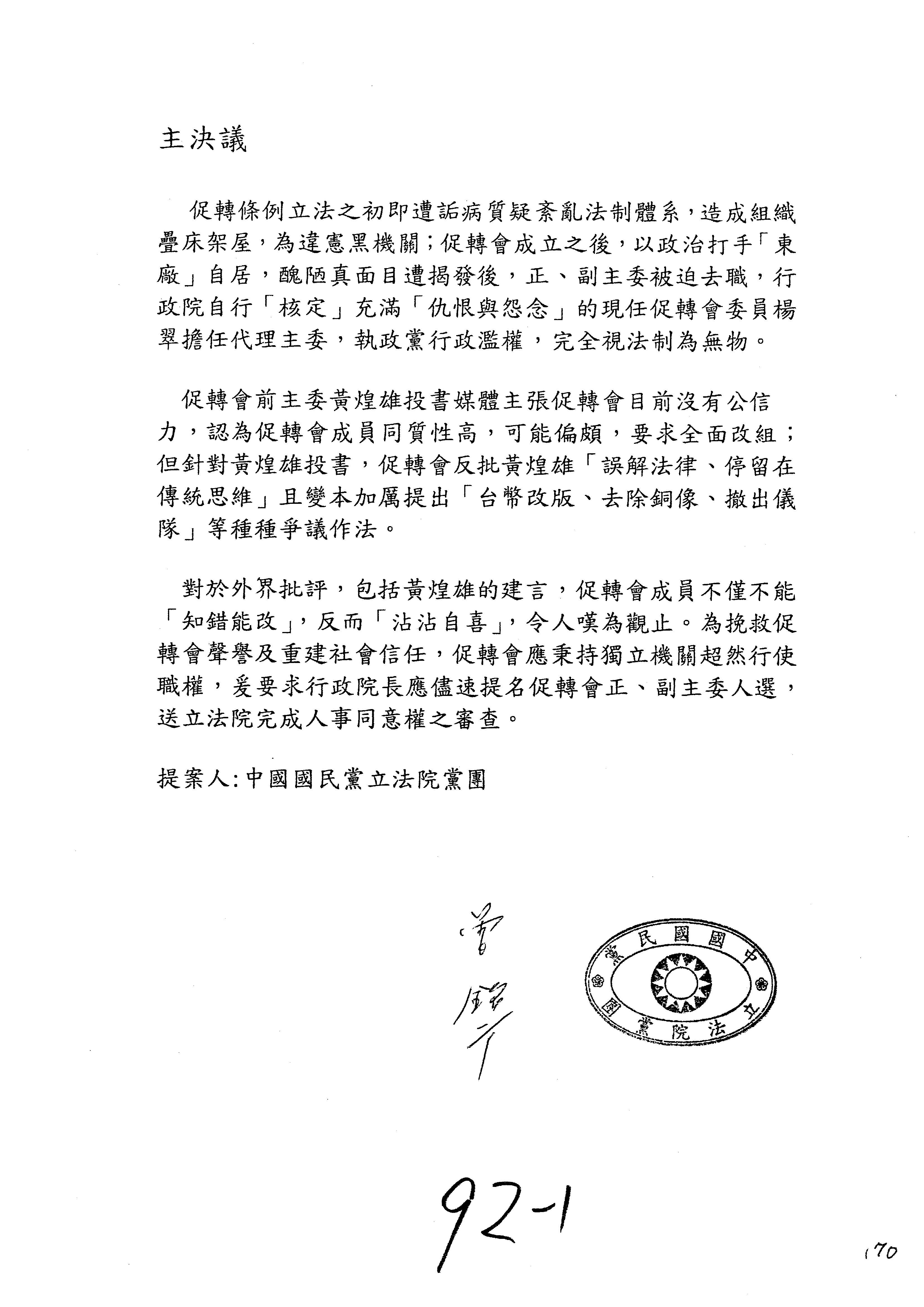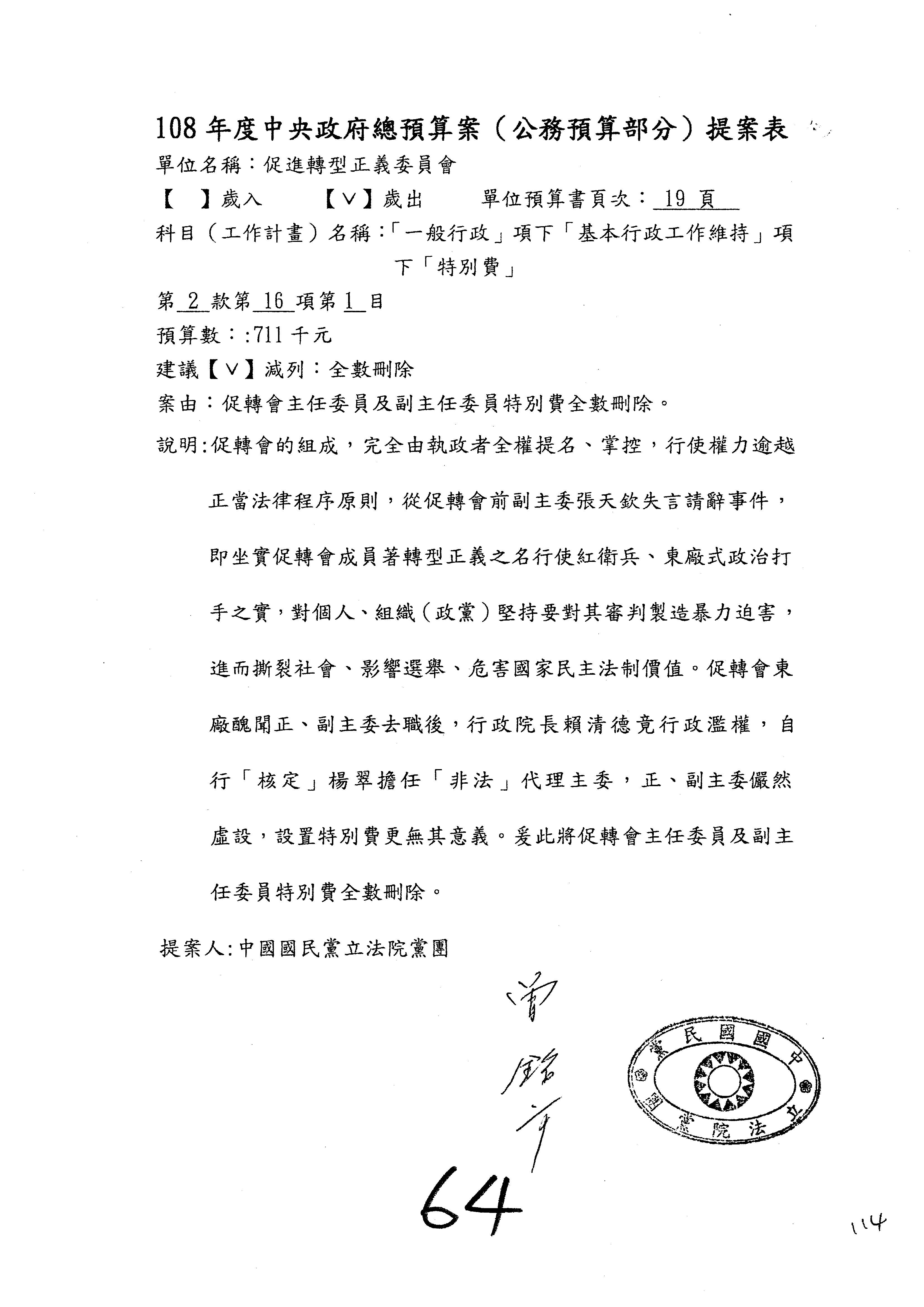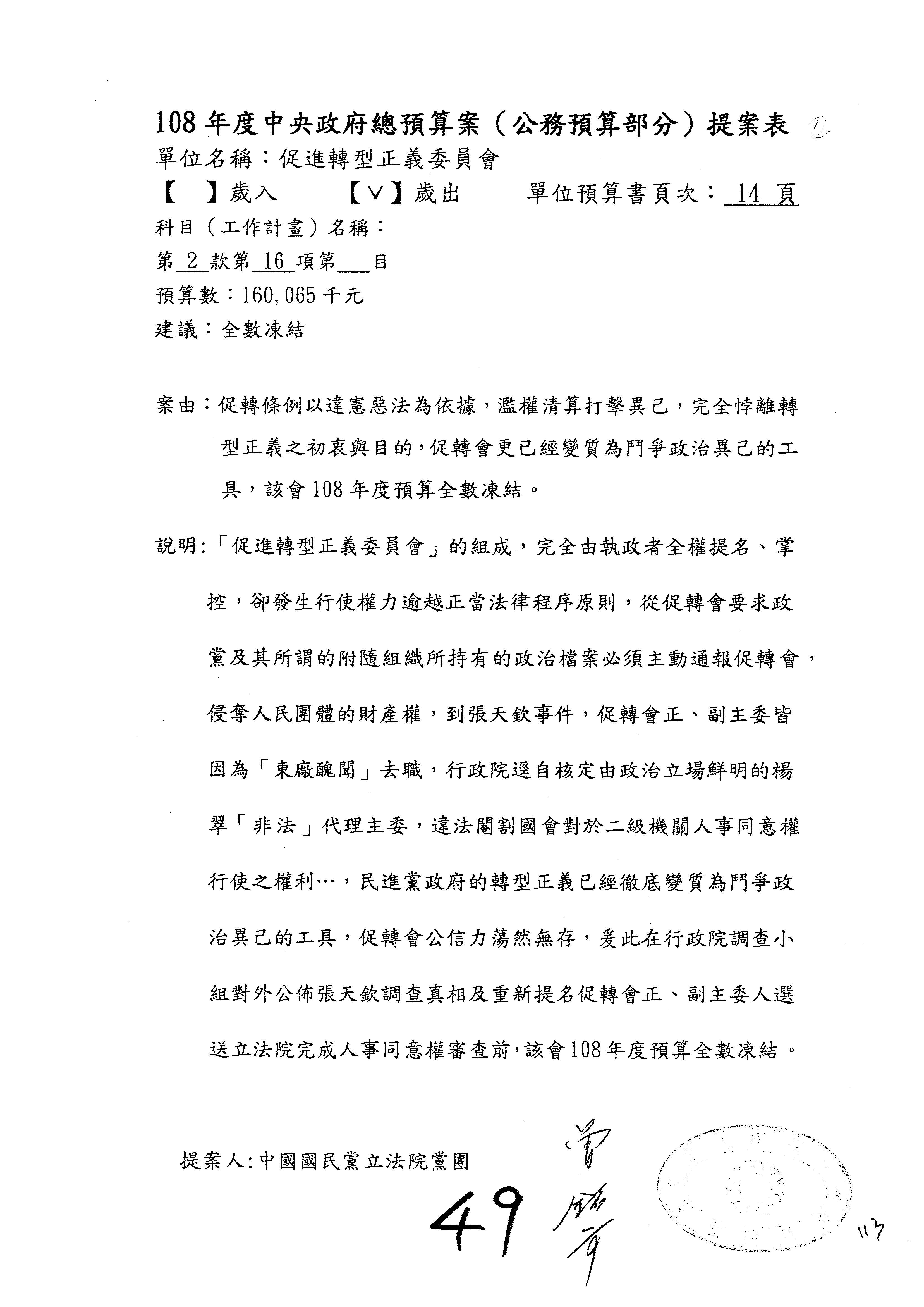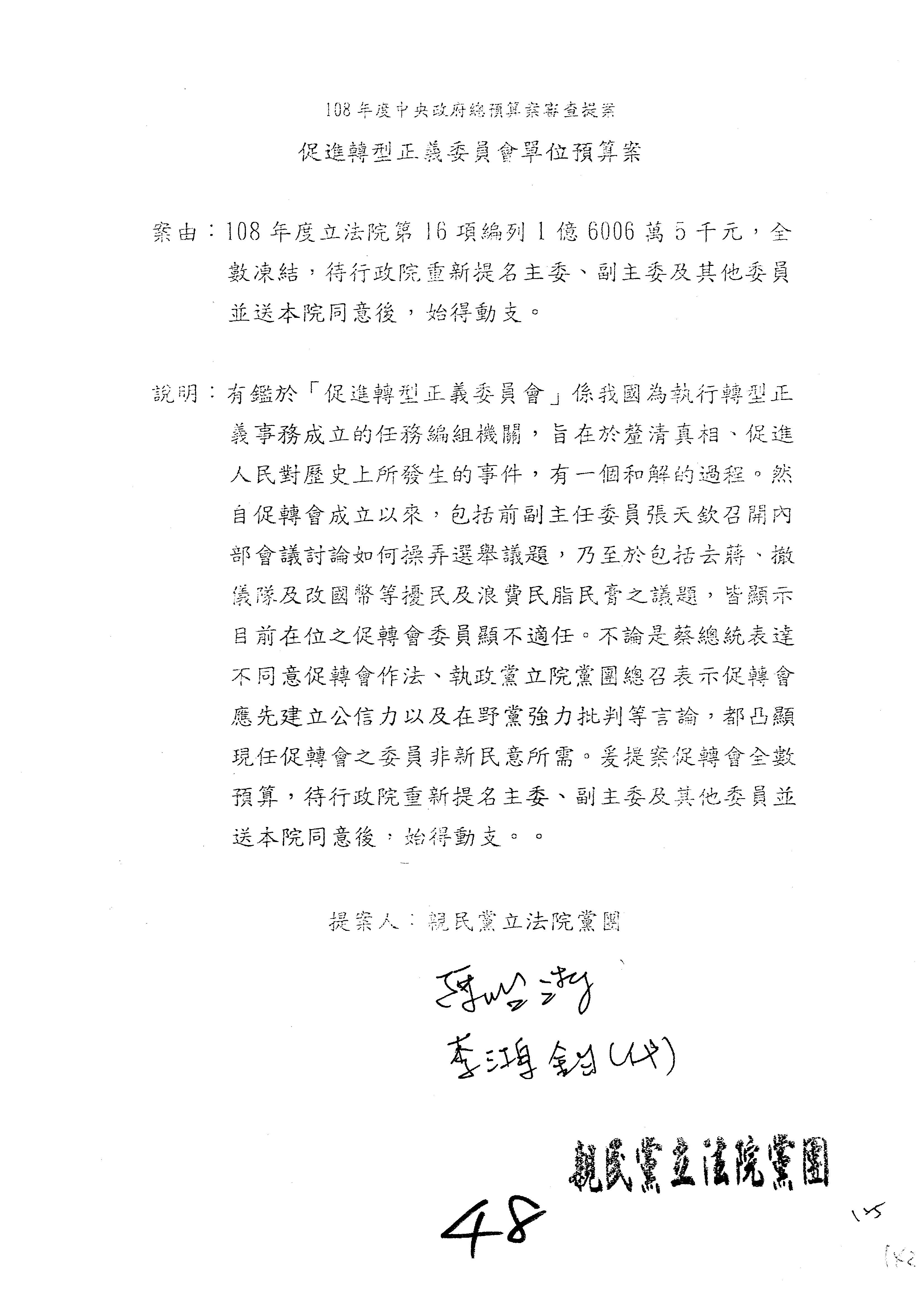 促轉會因為已經成為東廠,而且最諷刺的事情是,這個東廠的名稱不是外界強加於促轉會身上,而是前促轉會副主委自封為東廠,多麼諷刺啊!對於這樣的東廠,還要讓它來執行促轉會所被賦予的任務嗎?所以我們要求全數凍結促轉會的所有預算,以及全數刪除主委及副主委的特別費。
