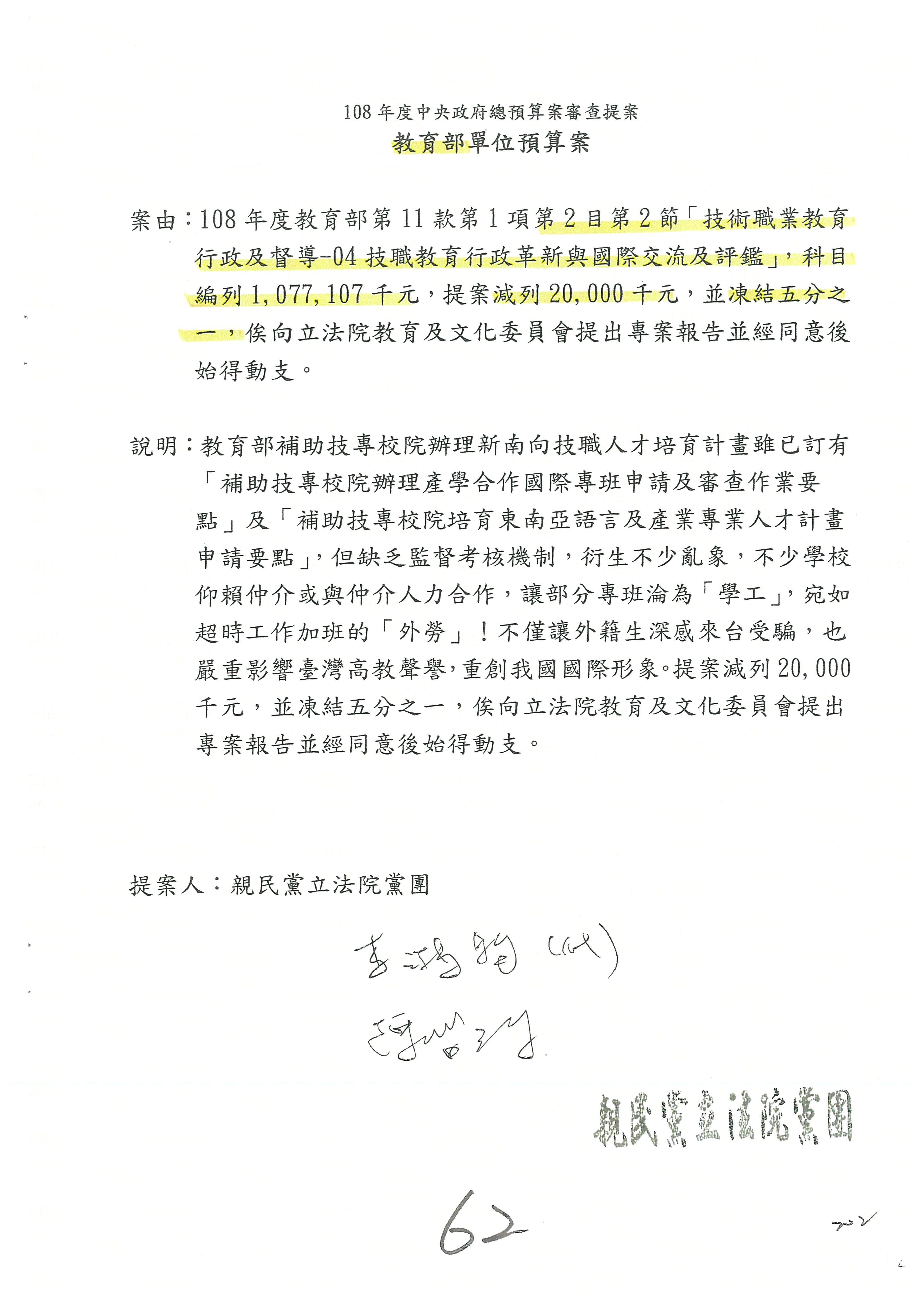 首先,有關教育部技職教育行政督導項下「技職教育行政革新與國際交流及評鑑」之預算,民進黨黨團認為現有補助各新南向產學合作專班如果發生執行疏漏,經檢討若是因為制度面不足的話,那麼應當就制度面予以精進;若是制度已經完備,而是執行有所落差,當然就應該加以改善。經過教文會討論之後,我們已經要求教育部就以下面向嚴格加以落實:一、未來新南向產學合作專班每學期查核作業必須嚴格執行,包括課程規劃、教育安排、生活輔導、教育品質等等,都一定要嚴格查察。二、教育部應當強化與勞動部之跨部會合作,依現有就業服務法第五十條的法律授權,倘若查有疑似廠商剝削學生、違法超時打工情事,應積極移送勞動部依其權責辦理。若有違法情事遲遲未加以改善,那麼後續裁罰時,我們要求教育部必須即刻停止該校後續各班別之招生,扣減其招生名額並扣減相關獎補助款,同時也要加強罰則,只要違反招生規範,都必須將該校列入專案輔導學校,並且移送檢調查處。因為相關制度及執行相對完備,希望大會能夠支持民進黨黨團免予刪減、免予凍結該項預算之意見。