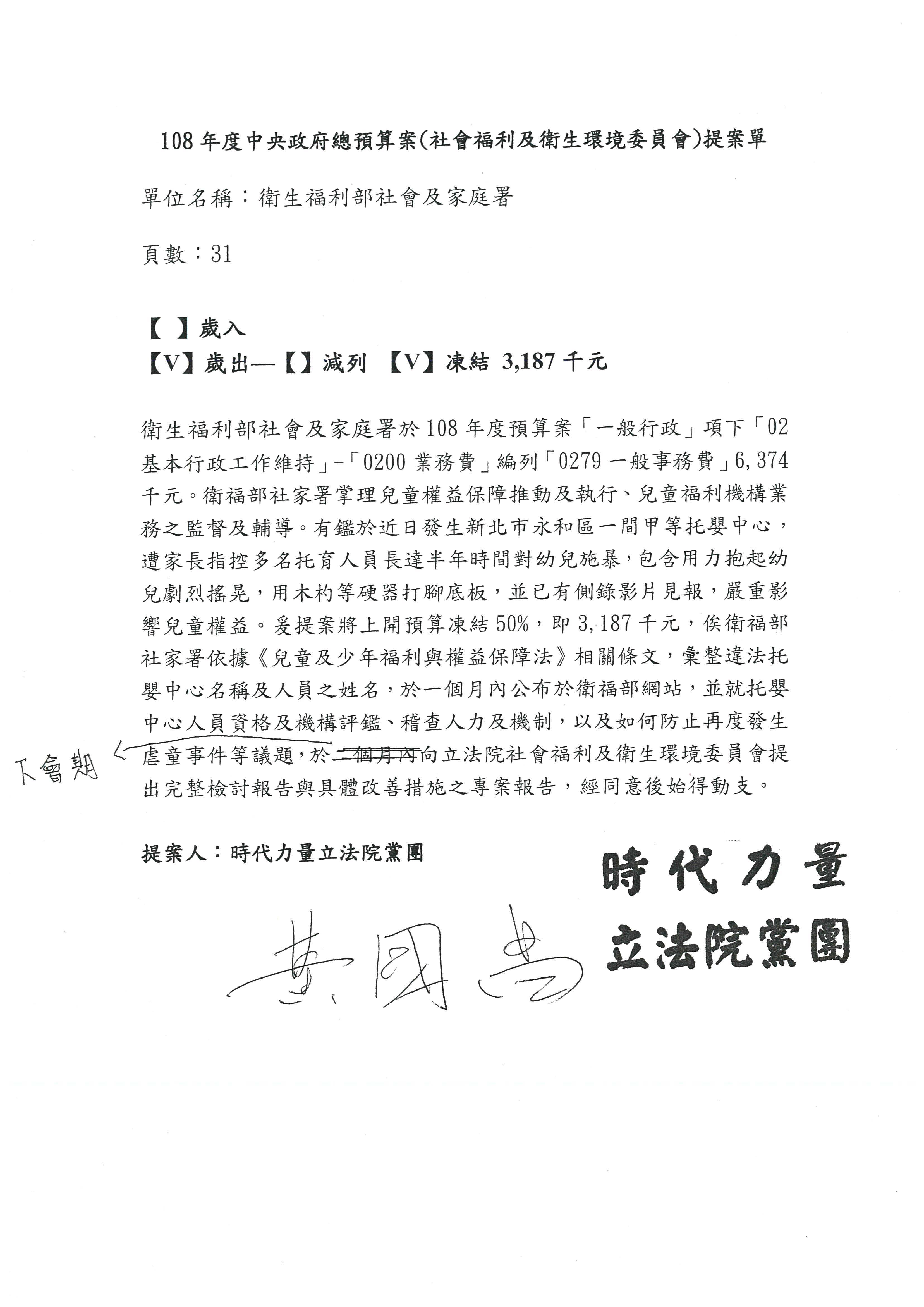 洪委員慈庸:(17時17分)主席、各位同仁。今天時代力量有新增一個提案,這個提案是針對衛生福利部社家署108年的預算,在一般行政項下的業務費「一般事務費」凍結318萬元。衛生福利部社家署是掌理兒童權益保障推動及執行、兒童福利機構業務之監督及輔導的主要機關。這兩天大家在媒體上都有看到新北市永和區一間甲等托嬰中心,遭家長指控多名托育人員長達半年時間對幼兒施暴,包含用力抱起幼兒劇烈搖晃,或用木杓等硬器打腳底板等,這些都有影片,此舉已嚴重影響幼兒的權益。所以我們特別提出這項預算凍結案,也要求衛福部社家署針對這樣的案件以及類似的案件,依照兒少權益保障法的相關條文,彙整違法托嬰中心名稱及人員之姓名,於1個月內公布於衛福部網站,並且針對托嬰中心人員的資格、機構評鑑、稽查人力、相關機制,以及未來如何避免再度發生相關事件等議題,於下會期向社福及衛環委員會進行完整的報告,之後才能夠動支這筆預算。我想這項議案應該沒有什麼爭議,所以希望大家稍後能夠支持,時代力量也在上一個會期提出刑法第二百八十六條修正草案,針對凌虐幼童的部分提出加重處罰規定,屆時也希望各位同仁能夠支持。