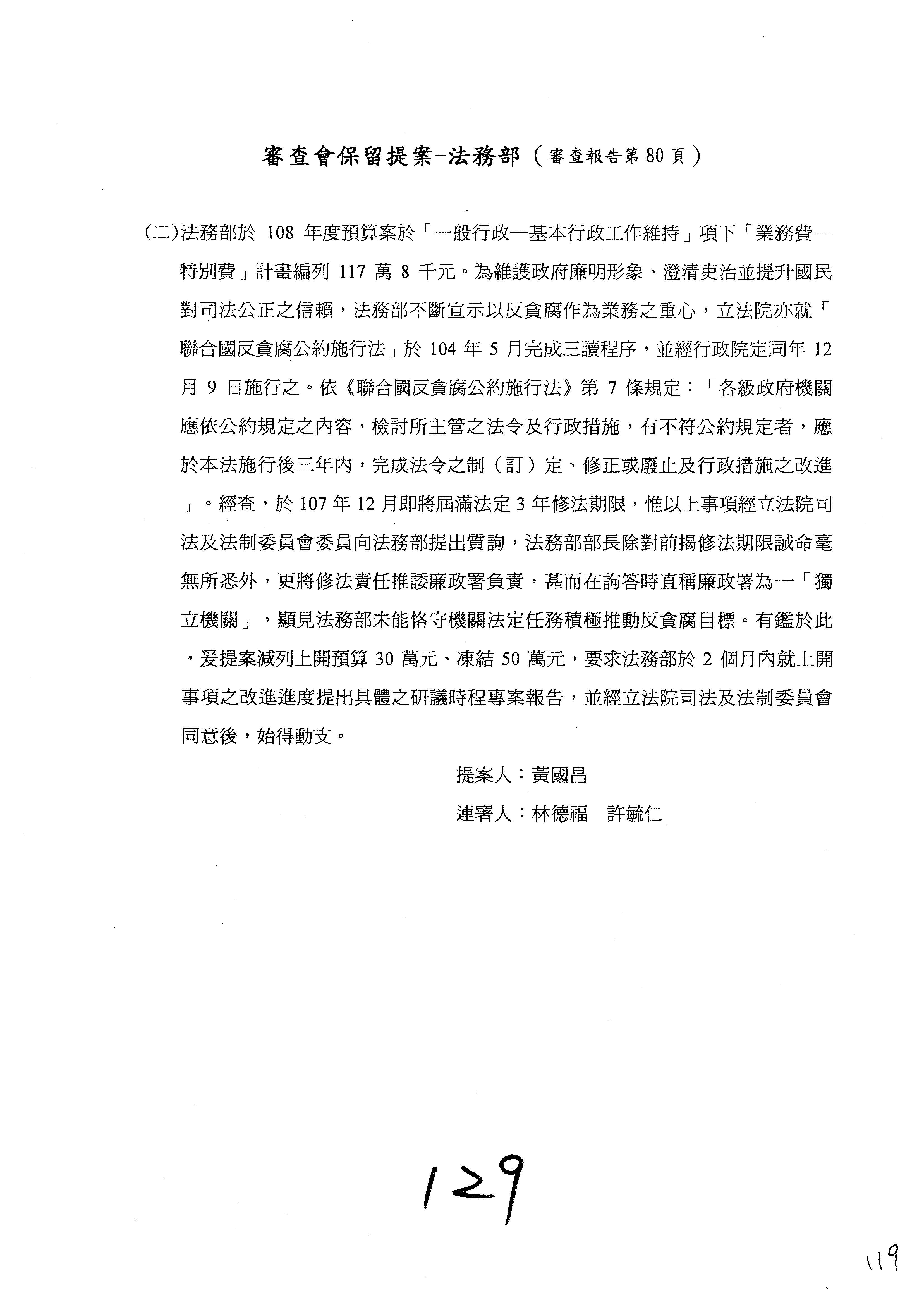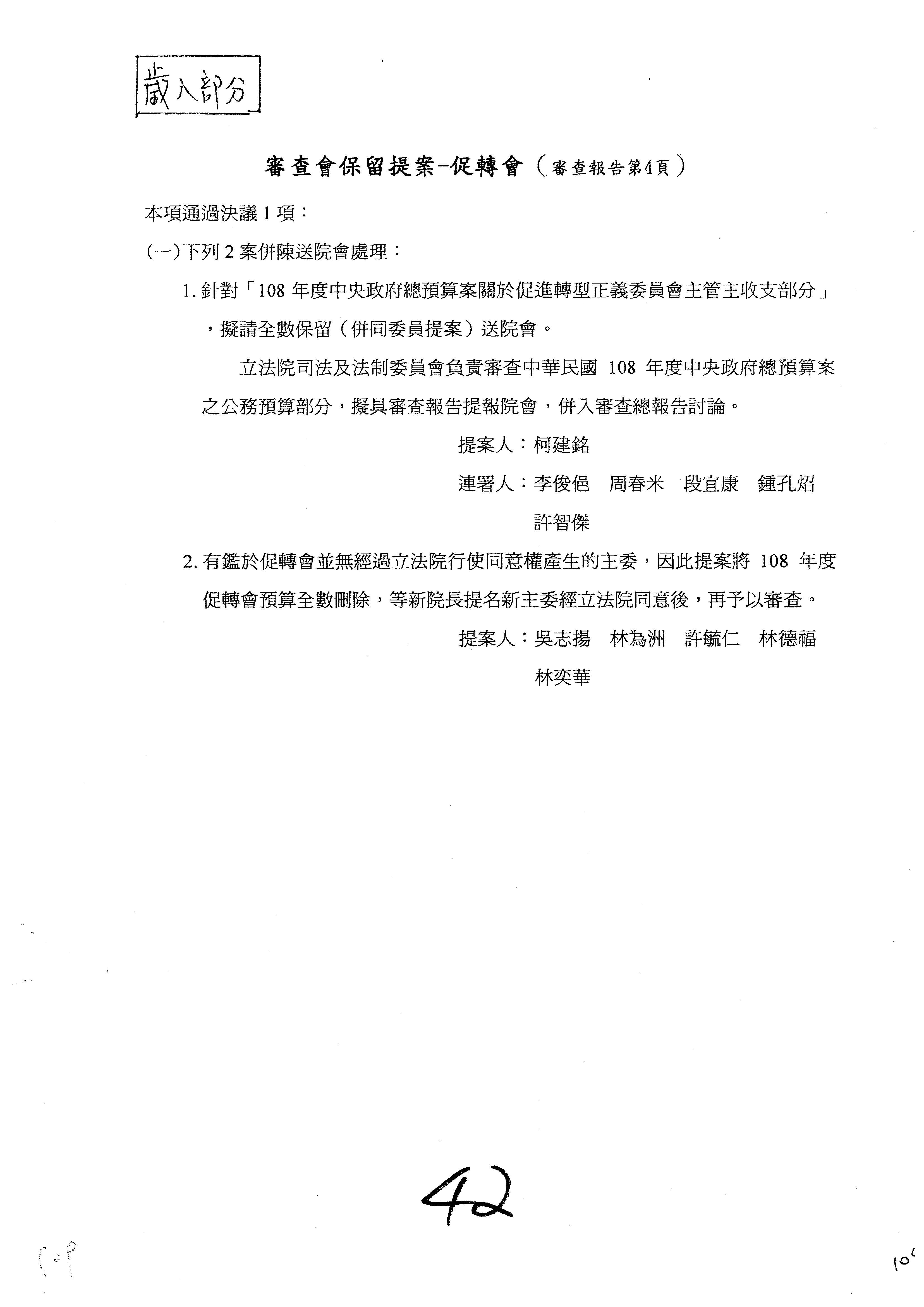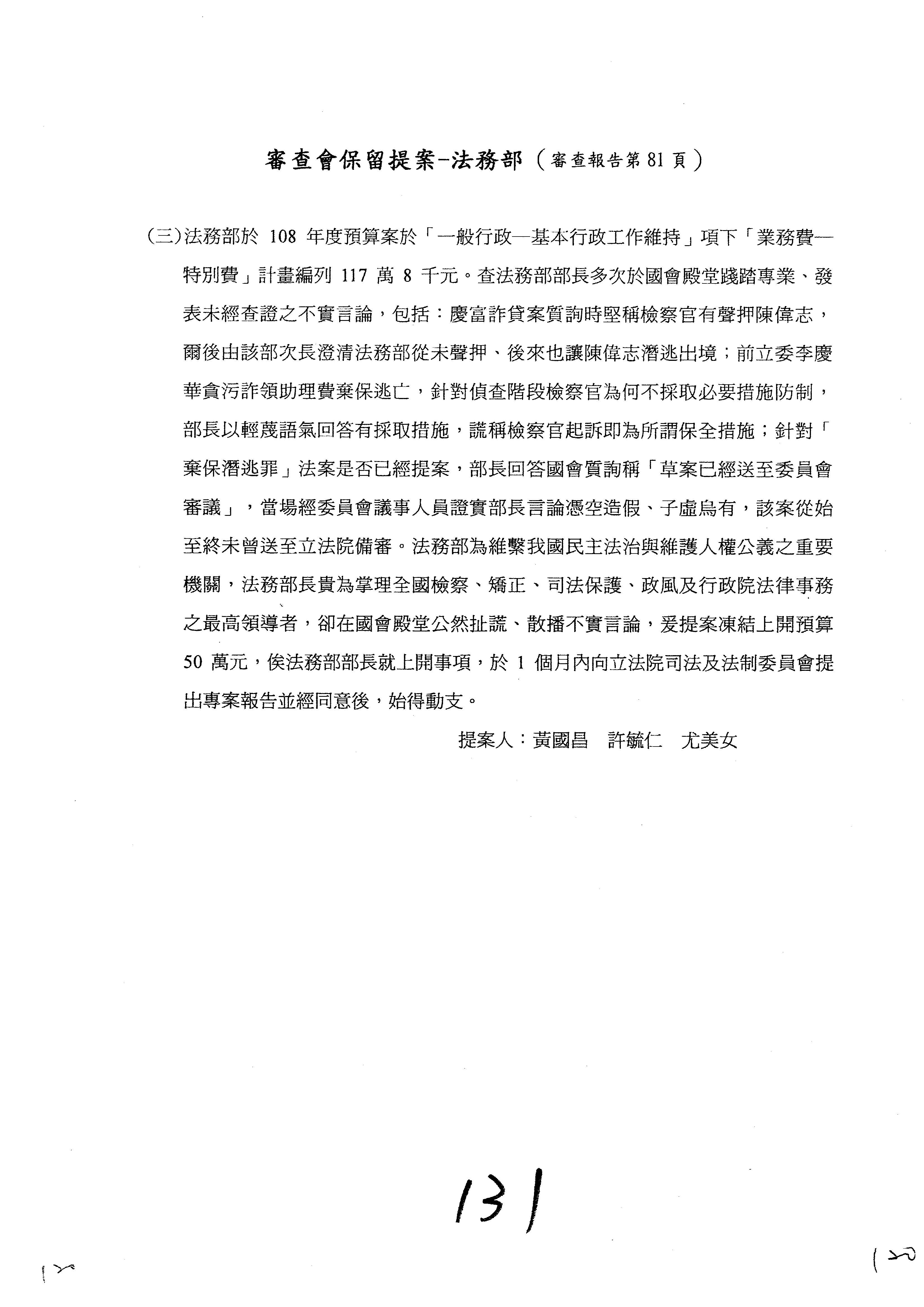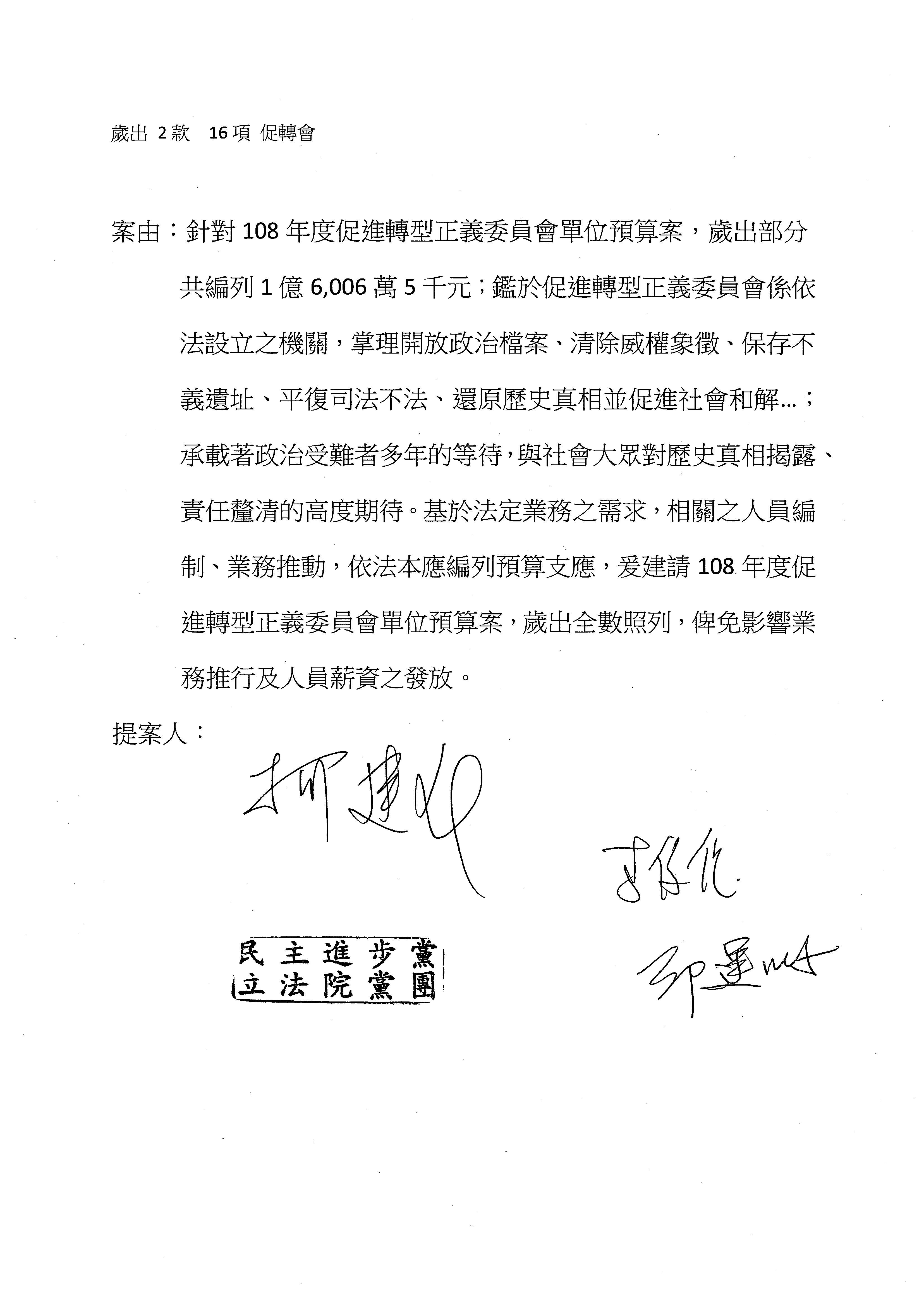 林委員為洲:(16時47分)主席、各位同仁。針對司法及法制委員會審查108年度總預算,本黨團提出二案,堅持、堅定要求保留,第一案就是促轉會1億6,000萬元的所有預算應該要全數凍結,等待新的行政院長提出新的人選,全面改組之後再予以解凍。第二案我們要求主委及副主委的特別費全數刪除,我們再一次堅定的表達立場。