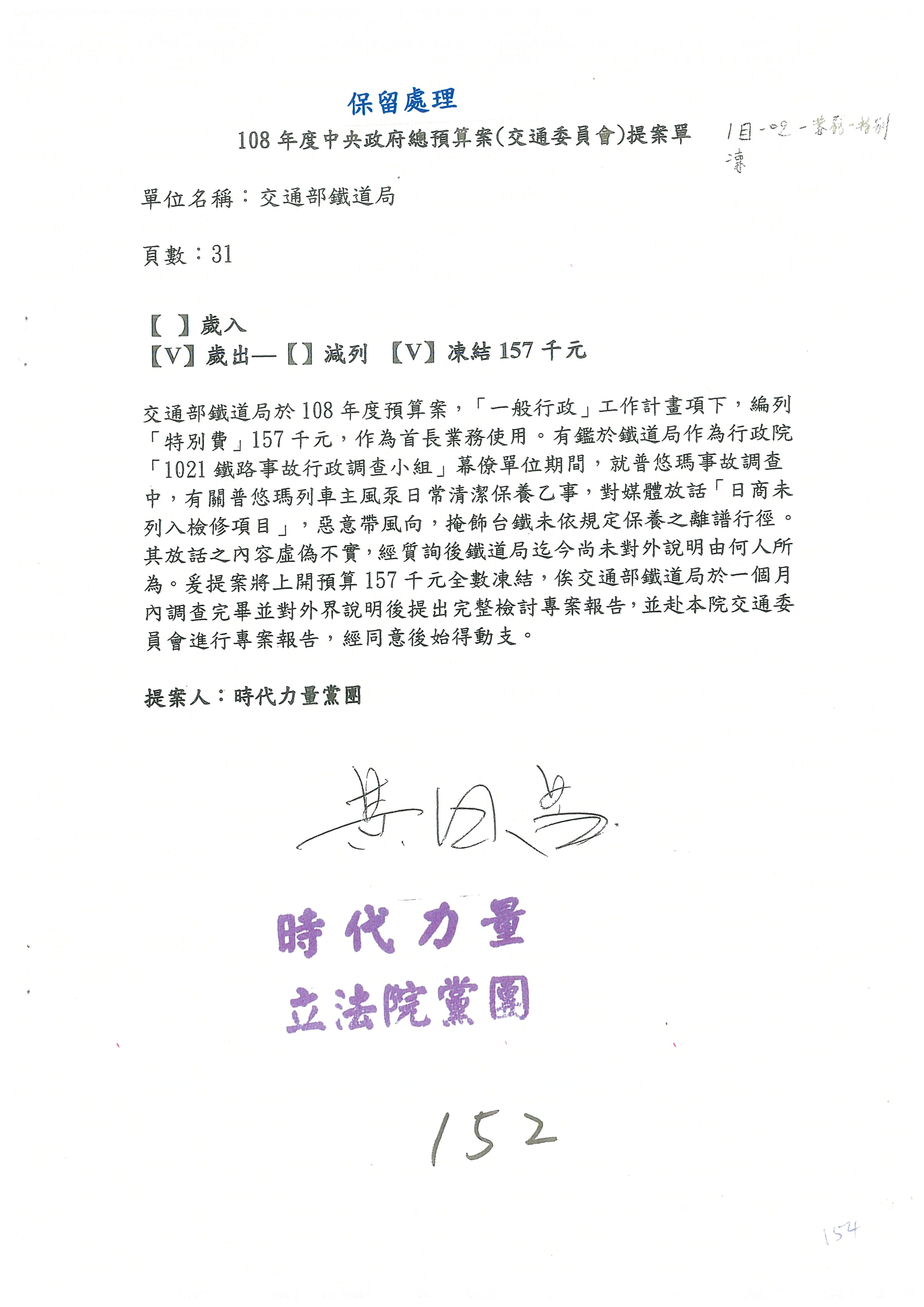 主席:針對第152案,在協商的過程中是保留的,最後也徵求各黨團的同意,第152案照案通過,請問院會,有無異議?(無)無異議,本案照案通過。